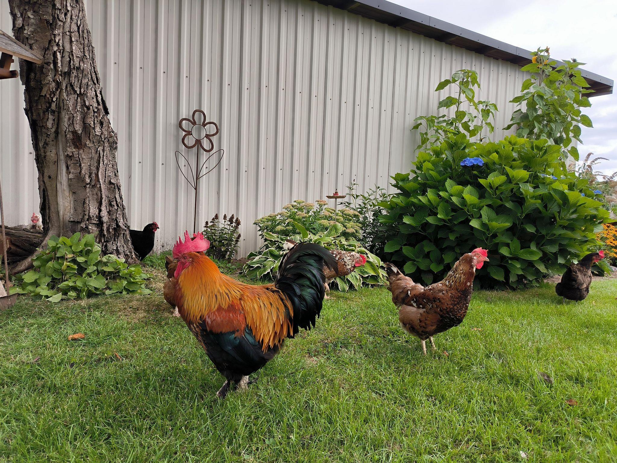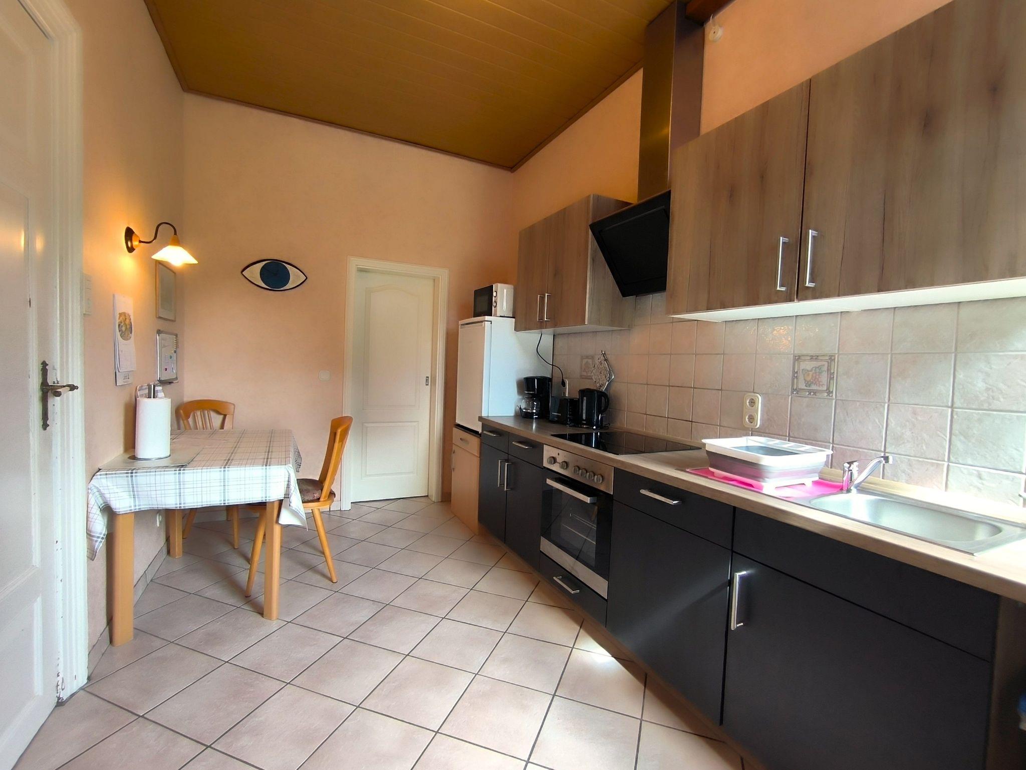Die Küche liegt hinter dem Wohnzimmer, ist neu eingebaut und komplett ausgestattet: es gibt einen Herd, Backofen, Spülmaschine, Kühlschrank mit Gefrierfach, Mikrowelle, Kaffeemaschine und Toaster. Ein kleiner Hauswirtschaftsraum mit viel Staufläche und ein Vorraum mit Waschmaschine und Trockner sowie das Gäste-WC gehen von der Küche ab. Auch gelangt man von hier auf die große Terrasse, die mit Sonnenschirm, Gartentisch und - stühlen sowie zwei Sonnenliegen ausgestattet ist. Auf Wunsch kann man auch den Garten der Vermieter mitnutzen: ein Spielgerüst für Kinder ist vorhanden, es gibt jede Menge Platz zum Toben oder Sitzen und die freilaufenden Hühner und der Hahn sowie die Ponys und Kühe, die hinter dem Haus meist auf der Weide stehen, und zur Sommerzeit natürlich auch die Störche, laden zum Beobachten ein.