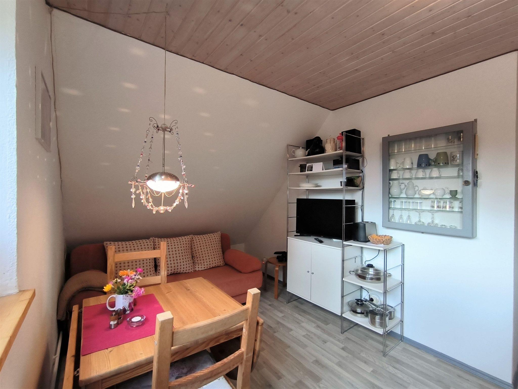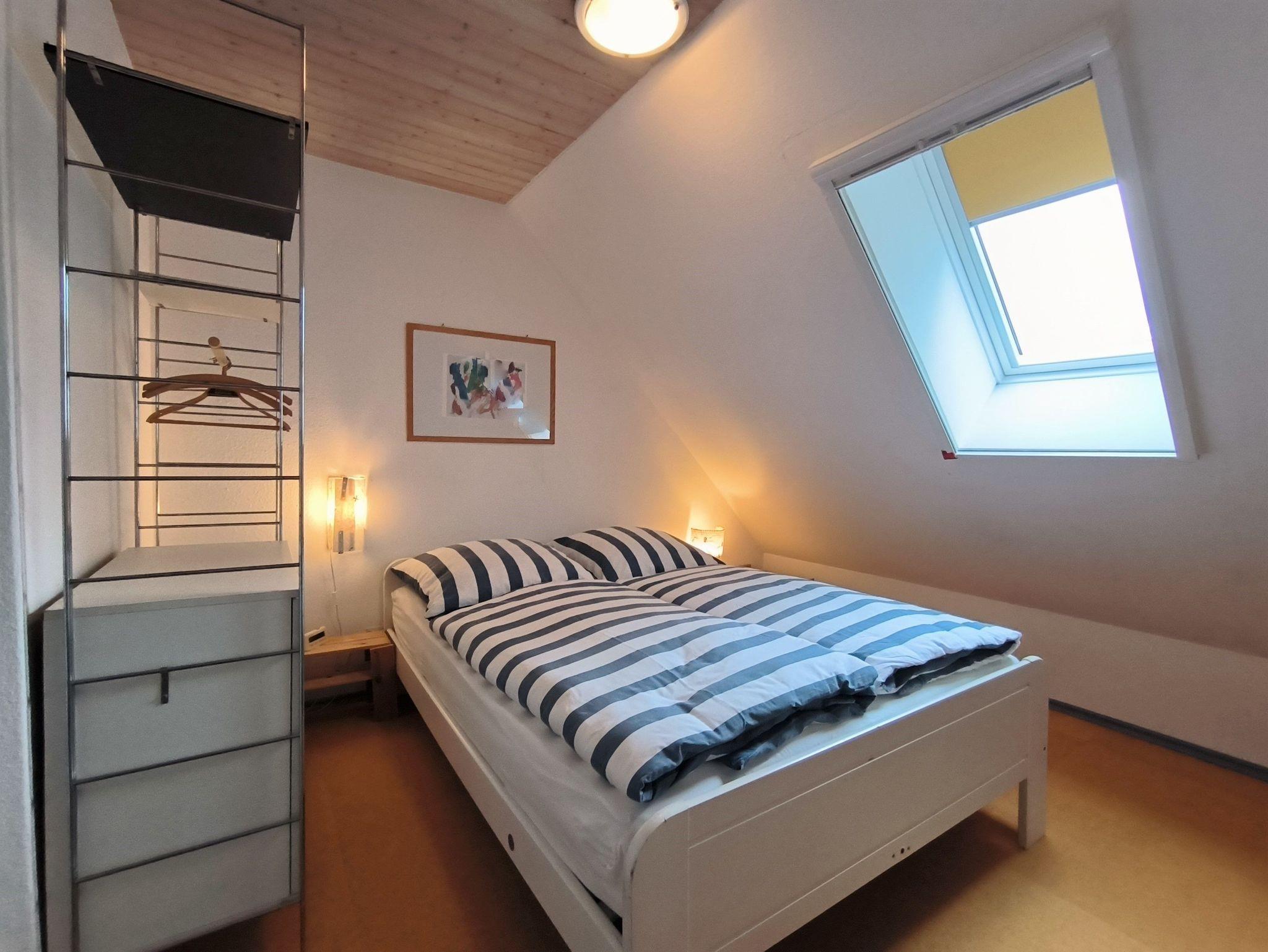 Man erreicht die Räumlichkeiten durch einen separaten Eingang über einen Gemeinschaftsflur, der z.T. an die Eigentümerwohnung grenzt, über eine schmale, steile Treppe. Im Eingangsbereich gibt es eine Sitzgelegenheit für die Gäste. Das Schlafzimmer für ein bis zwei Personen (1,40 x 2,00 m), eine kleiner Aufenthaltsraum mit Küchenzeile, Esstisch, Sofa und TV sowie ein Wannenbad befinden sich im Obergeschoss. Durch die offene Bauart ist die Unterkunft keine abgeschlossene Wohneinheit.