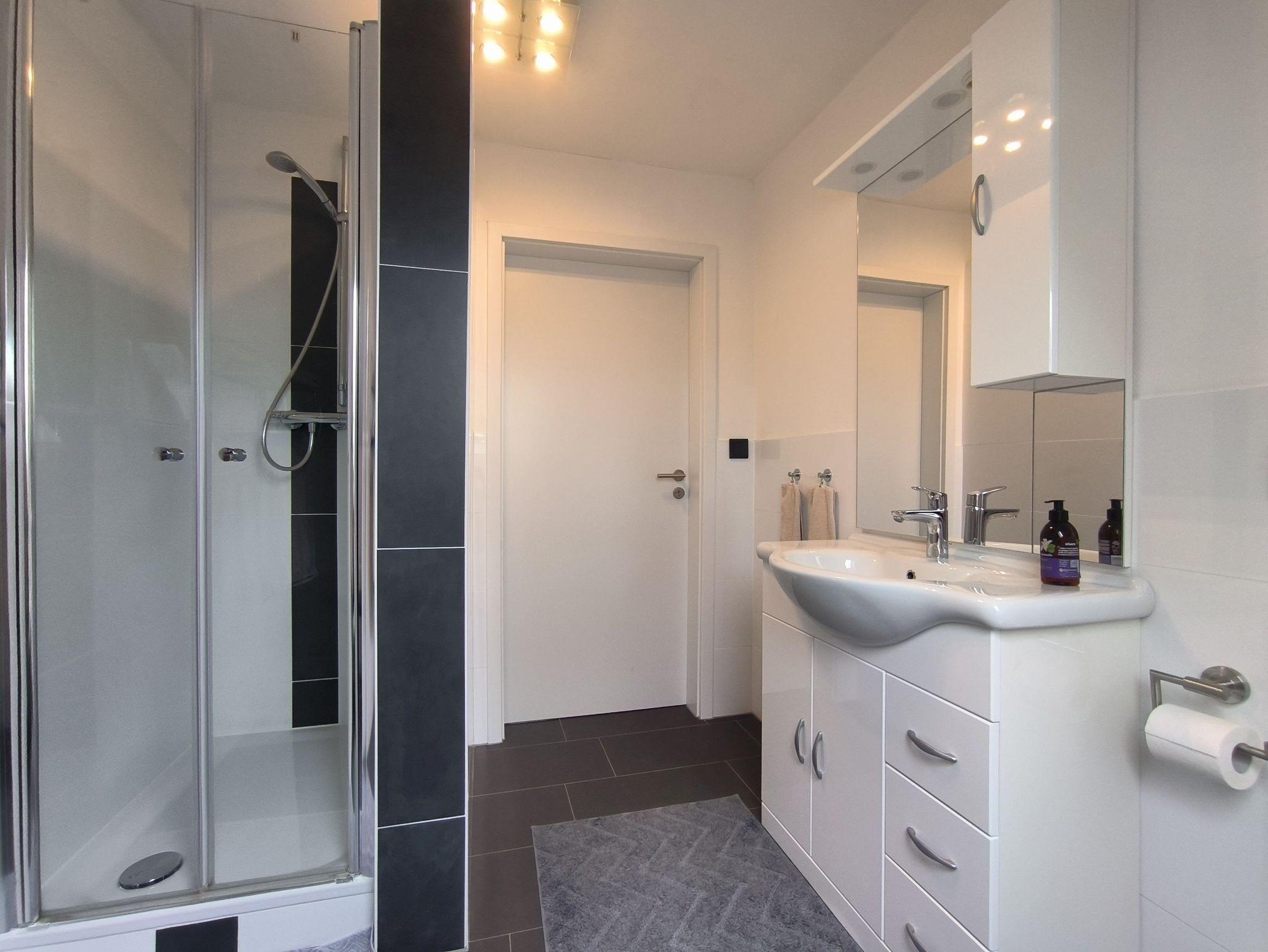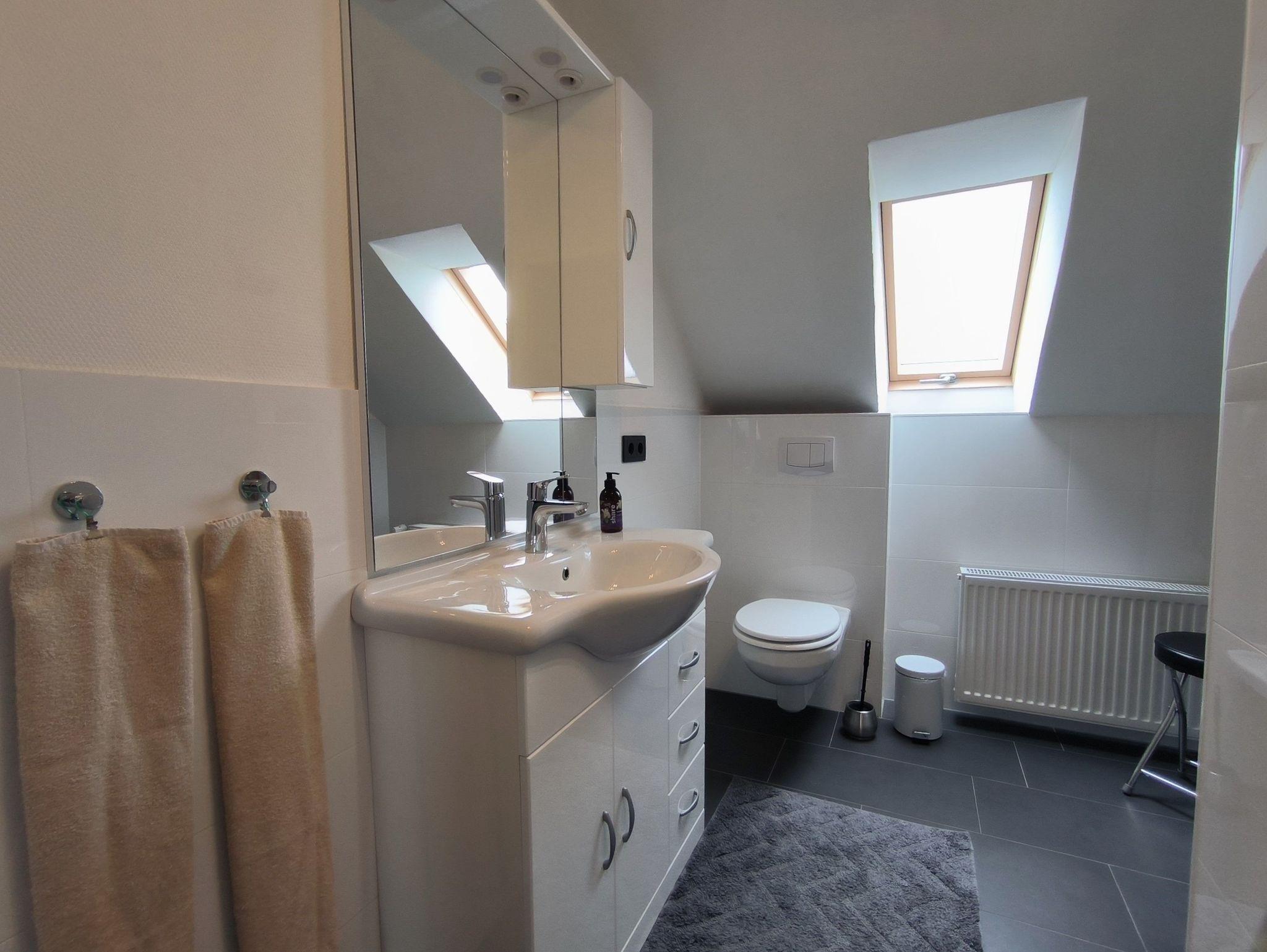 Die Ferienwohnung ist über einen eigenen Eingang erreichbar: eine Treppe führt direkt Obergeschoss: ein geräumiges Wohnzimmer mit gemütlicher Sofaecke, TV und Tisch mit Stühlen und ein Badezimmer mit Duschkabine, Toilette, Waschtisch und Fenster sind direkt vom Flur aus begehbar. Neben der Garderobe liegt das Schlafzimmer mit einem Doppelbett und einem großen Kleiderschrank. Durch das Schlafzimmer gelangt man in die Küche. Sie ist mit Herd, Backofen, Kühlschrank mit Gefrierfach, Mikrowelle, Kaffeemaschine, Toaster und einem kleinen Esstisch ausgestattet, allerdings gibt es keine Spülmaschine. Im Garten hinter dem Haus gibt es eine kleine Sitzecke mit Gartenmöbeln.