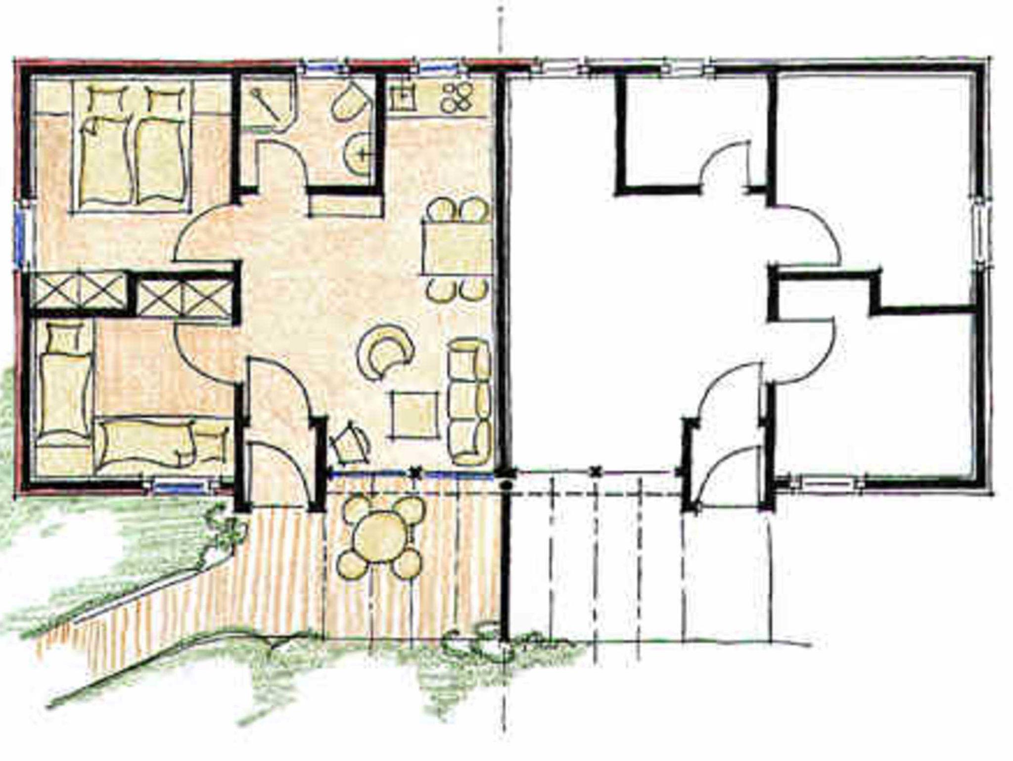 Der Bungalow bietet bis zu 4 Personen Platz und verfügt über zwei Schlafräume (1x Doppelbett und 1x zwei Einzelbetten), ein Wohnraum mit offener Küchenzeile sowie einem Bad mit Waschtisch, Dusche und WC. Eine Terrasse vor dem Haus lädt zum Verweilen ein. Die Waschmaschine und der Trockner befinden sich im Wirtschaftshaus und werden für alle Gäste der Anlage gegen Gebühr bereitgestellt. Das Mitbringen von Haustieren ist unbedingt vorab mit dem Vermieter abzustimmen und es fallen Gebühren an. Bei den ausgewiesenen Bildern handelt es sich um Wohnbeispiele.