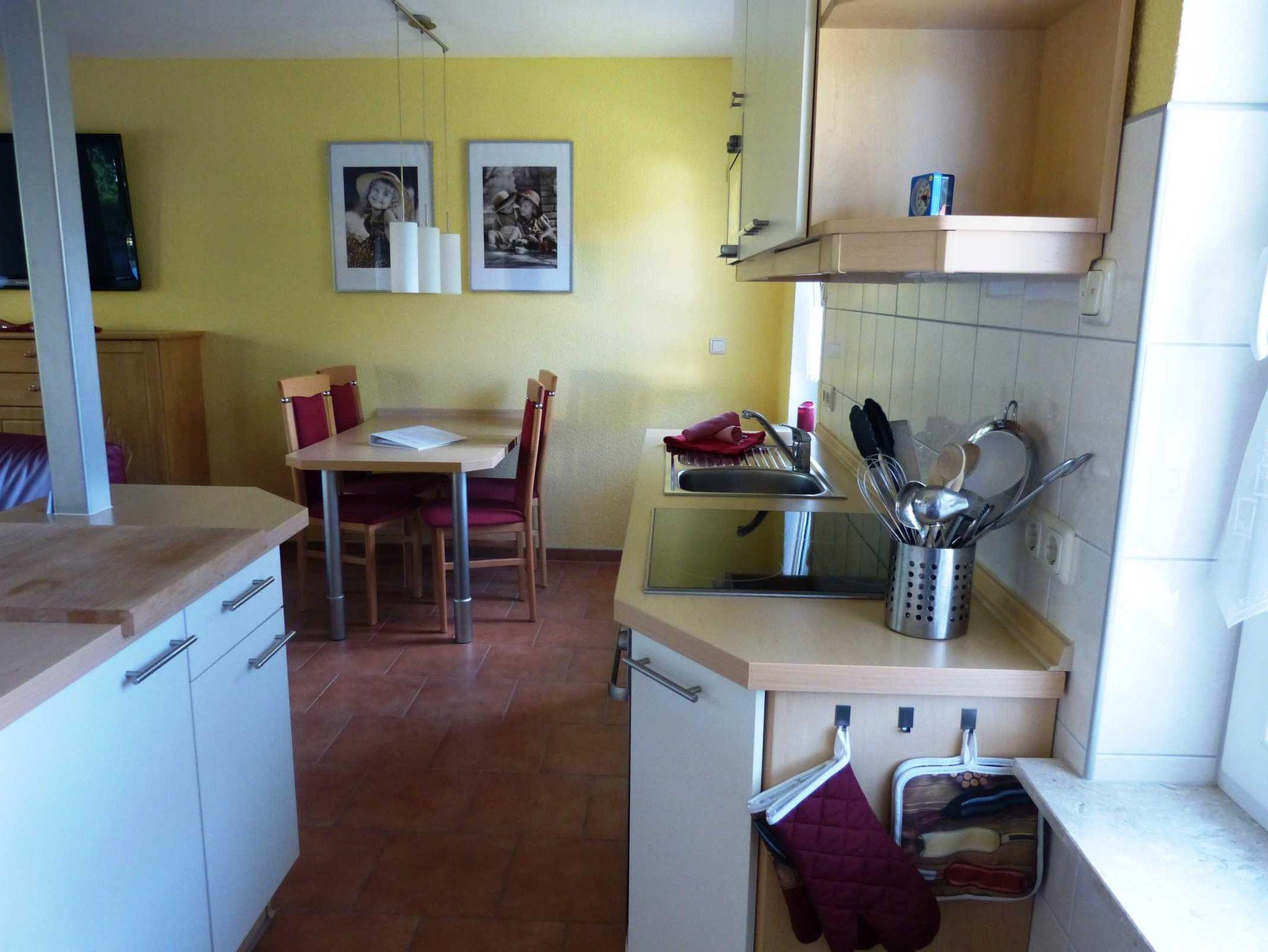 Die Küche ist offen zum Wohnzimmer und mit allen elektrischen Geräten (Geschirrspüler, Mikrowelle, Herd mit Cerankochfeld etc.) ausgestattet.