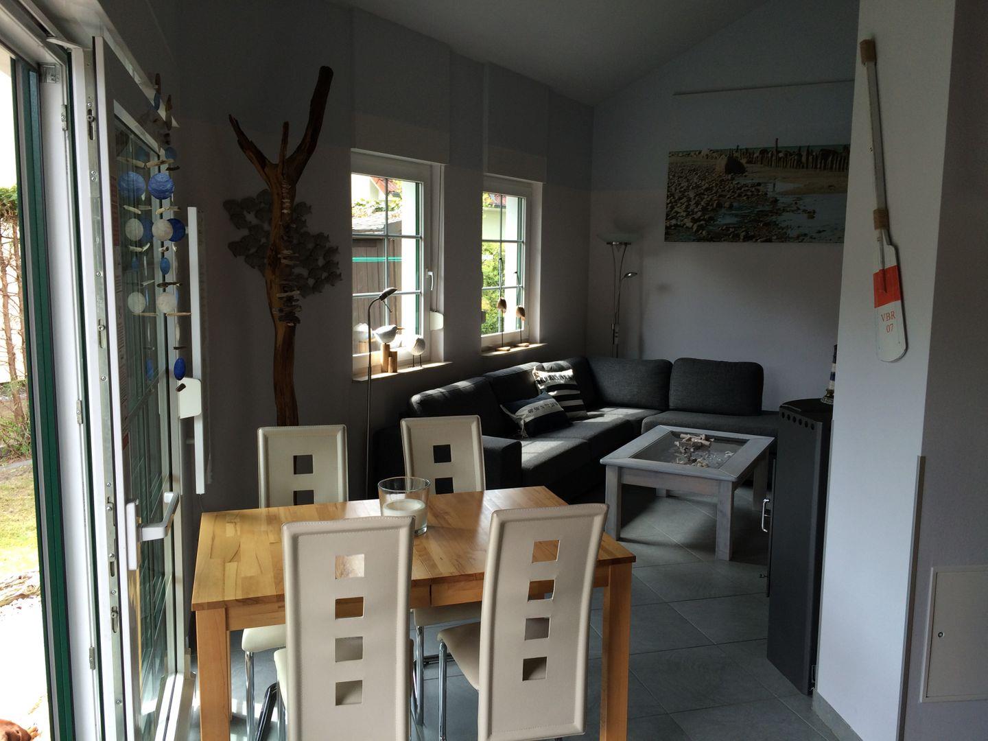Hauses befindet sich das Wohnzimmer mit Eckcouch, einem kleinen Tisch und Kamin (Holz und Briketts werden kostenlos zur Verfügung gestellt.) Angrenzend befindet sich eine eingebaute Sauna. Die offene Küche, mit Esstisch und vier Stühlen, ist mit einem Backofen, einem Cerankochfeld, einem Kühlschrank mit Gefrierfach, Mikrowelle, Kaffeemaschine, Wasserkocher und Toaster ausgestattet.