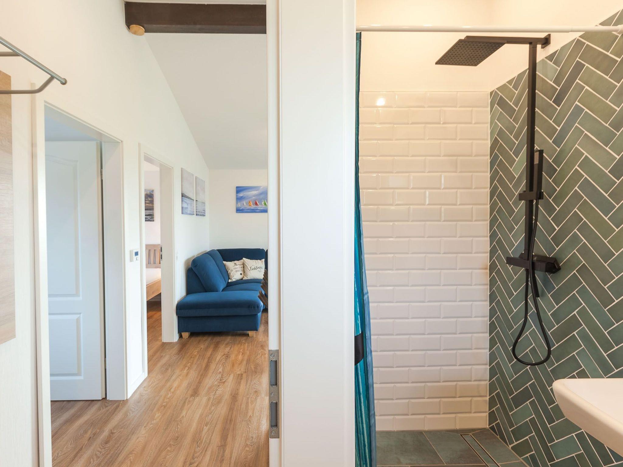 Wohnzimmer mit offener Küche, 2 Schlafräume 1x 160er Bett 2x 80er Betten, 1 Dusch/WC mit bodengleicher Dusche.