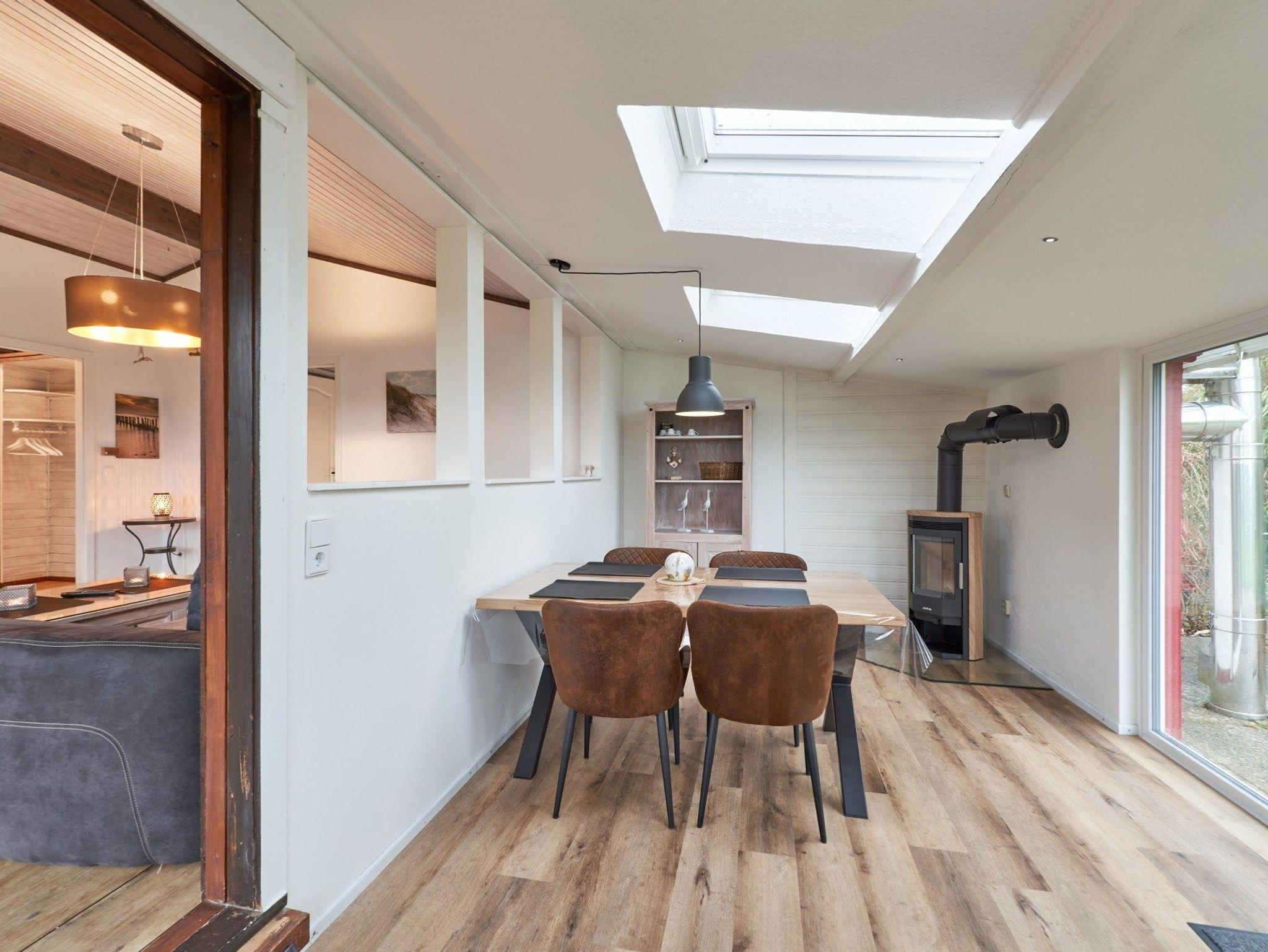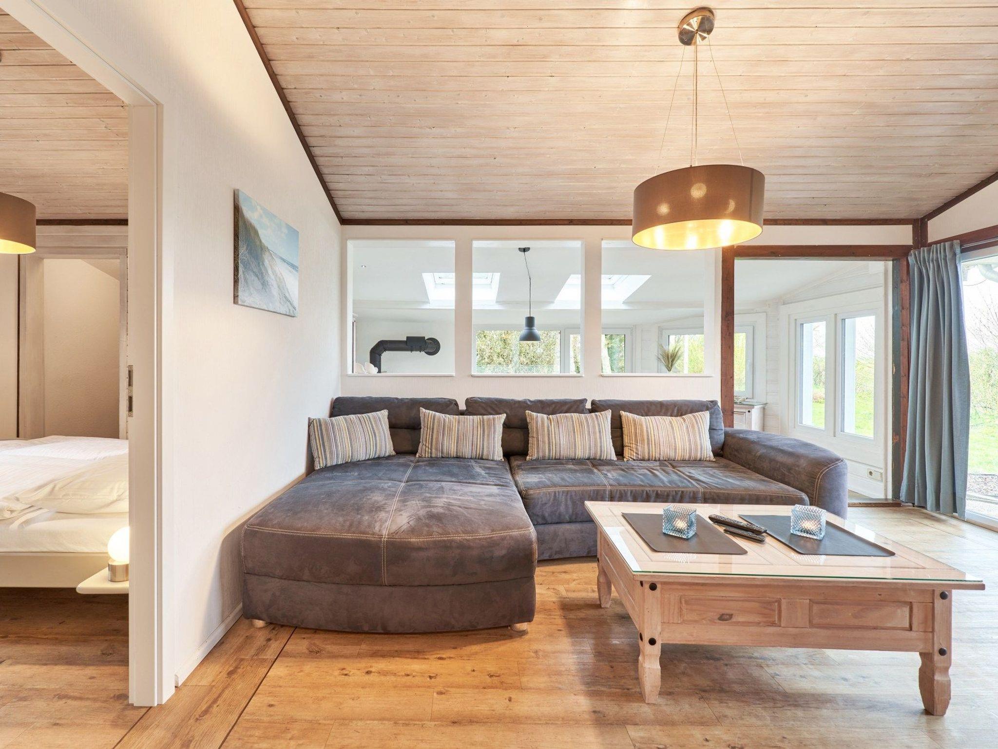 Großes Wohnzimmer, Küche, 2 Schlafräume (2 Einzelbetten [&] 1 Doppelbett, 1 Dusch/WC, Schuppen, Sauna mit Ruheraum überdachte Terrasse in Süd-West Lage mit Gartenmöbel.