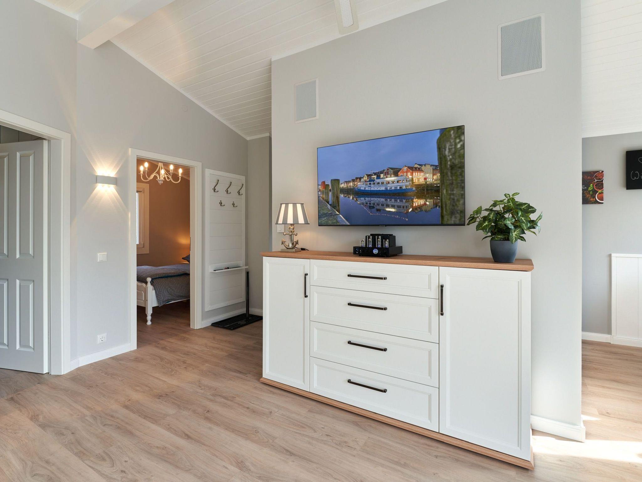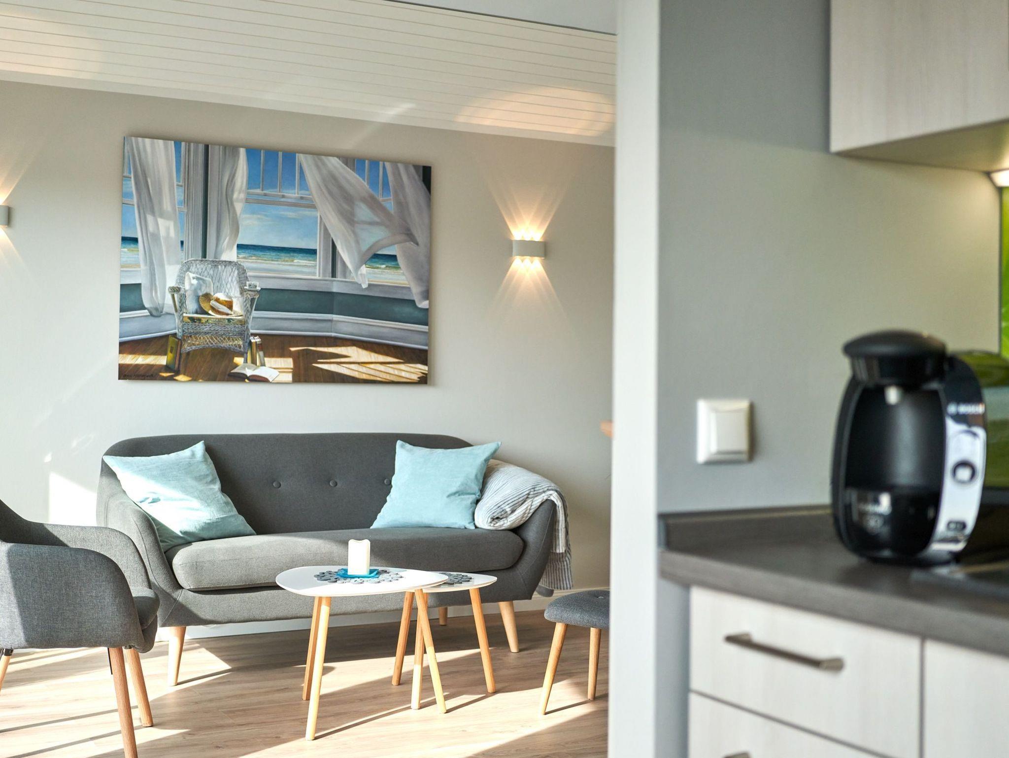 Das 2022 komplett renovierte Ferienhaus Mein Ankerpunkt ist der ideale Ort zum Entspannen und neue Energie tanken. In dem stilvoll eingerichteten und lichtdurchfluteten Haus finden auf 50 Quadratmetern bis zu vier Personen Platz. Das großzügige Wohnzimmer begeistert mit einer einladenden Sitzgruppe und großen Fenstern, die den Blick auf die sonnenverwöhnte Terrasse freigeben. Der 50-Zoll-Smart-TV bietet Zugang zu Netflix und Amazon Prime, um auch bei schlechtem Wetter unterhaltsame Stunden zu verbringen. Kostenloses WLAN steht ebenfalls zur Verfügung, und an heißen Tagen sorgt ein Deckenventilator für angenehme Kühle.