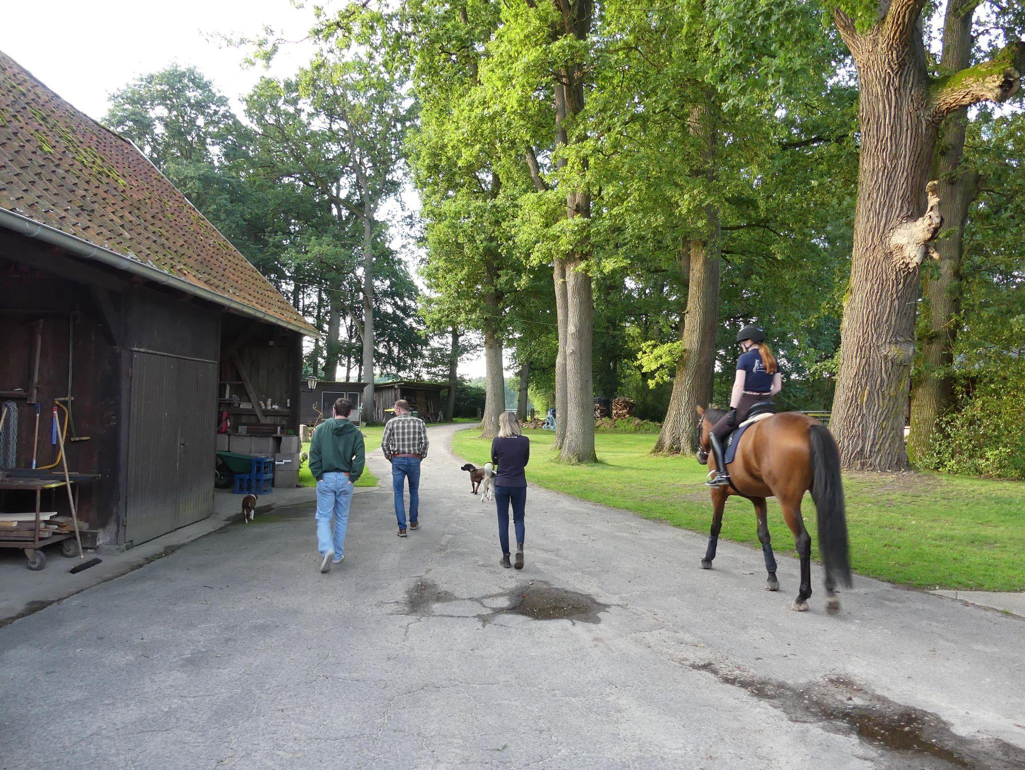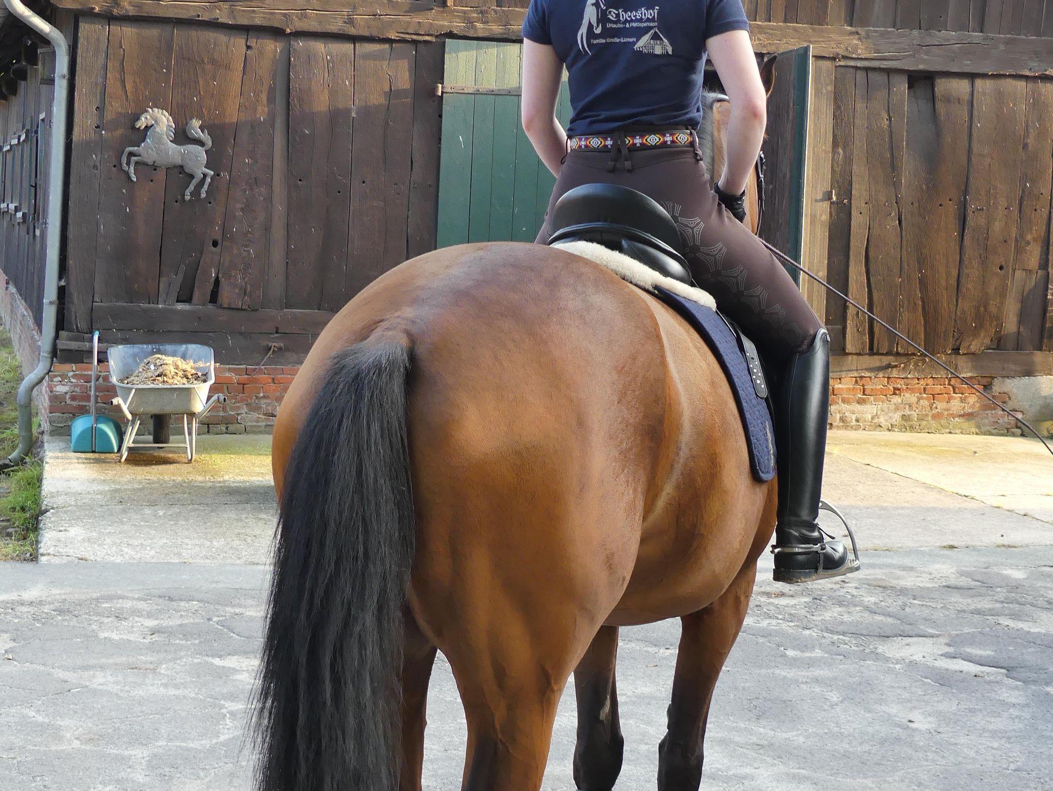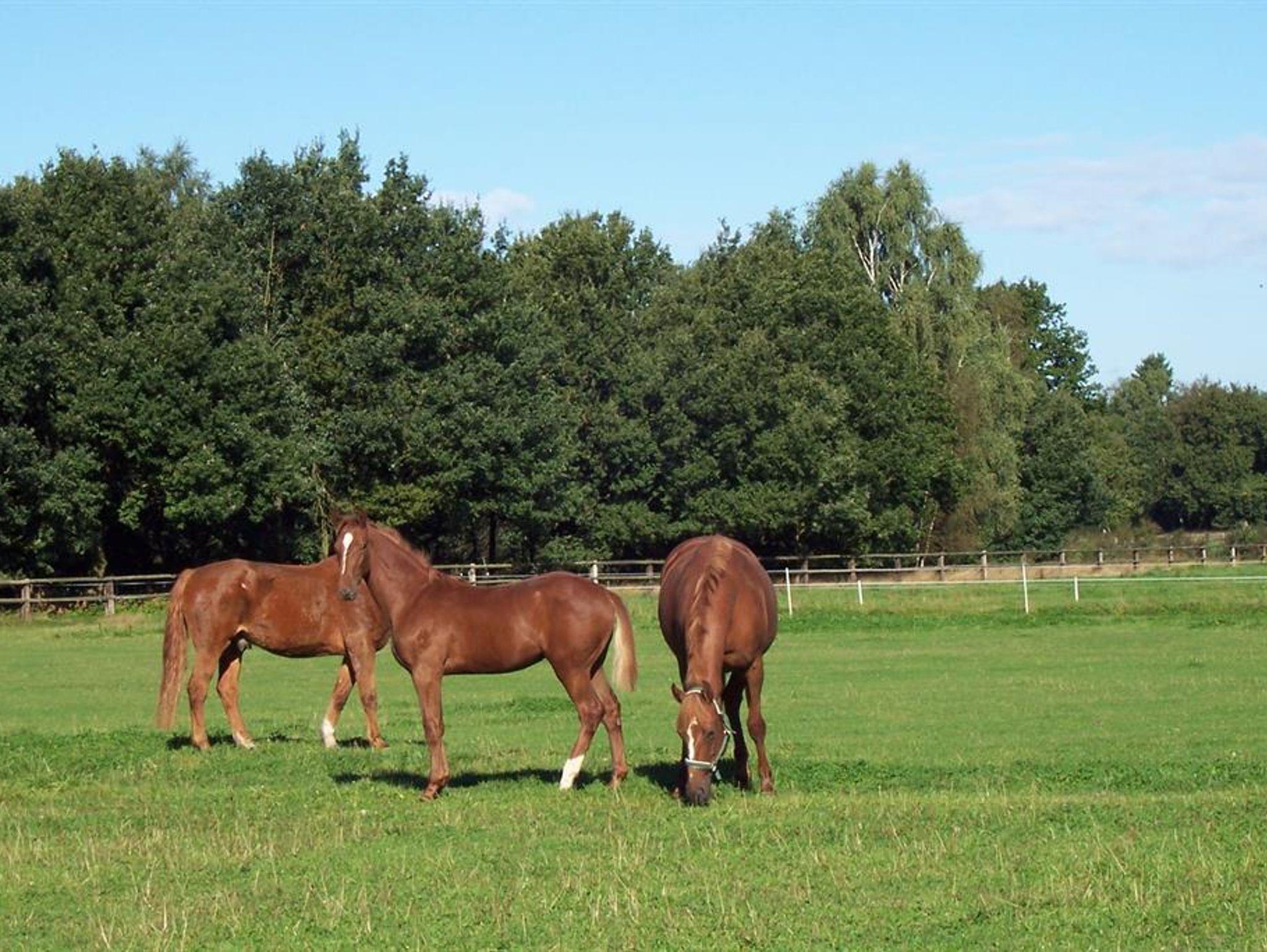 Auch Ihrem Pferd bietet der Theeshof eine Menge. Nur wenige Schritte von Ihrer Unterkunft entfernt, liegt unser FN- und VFD-ausgezeichnete Pensionsstall. Hier werden Ihre Vierbeiner optimal versorgt: Es gibt geräumige Außenboxen, Weidegang auf Wunsch, 2 x täglich Kraftfutter und Heu/Silage, kilometerlange Sandreitwege in naturbelassener Landschaft, eine 1 km lange Galoppbahn mit Natursprüngen, Außenreit-/Springplatz und einen schönen Badeteich zur Abkühlung! Das herrliche Ausreitgelände beginnt direkt bei uns vor der Tür.