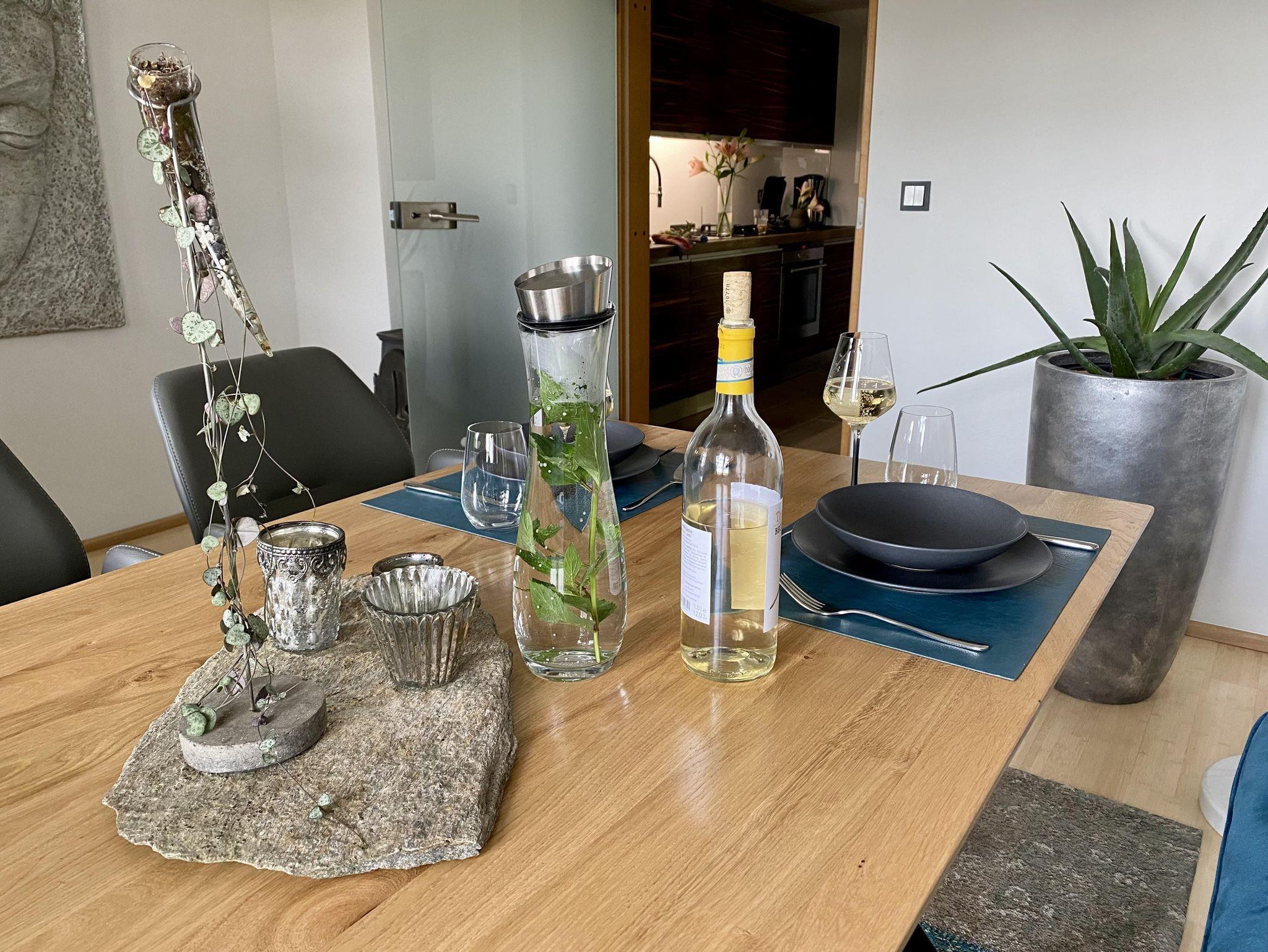 Im EG befindet sich die vollausgestattete Einbau-Küche, mit Abstellraum und Waschmaschine sowie das südausgerichtete Esszimmer mit Kaminofen.