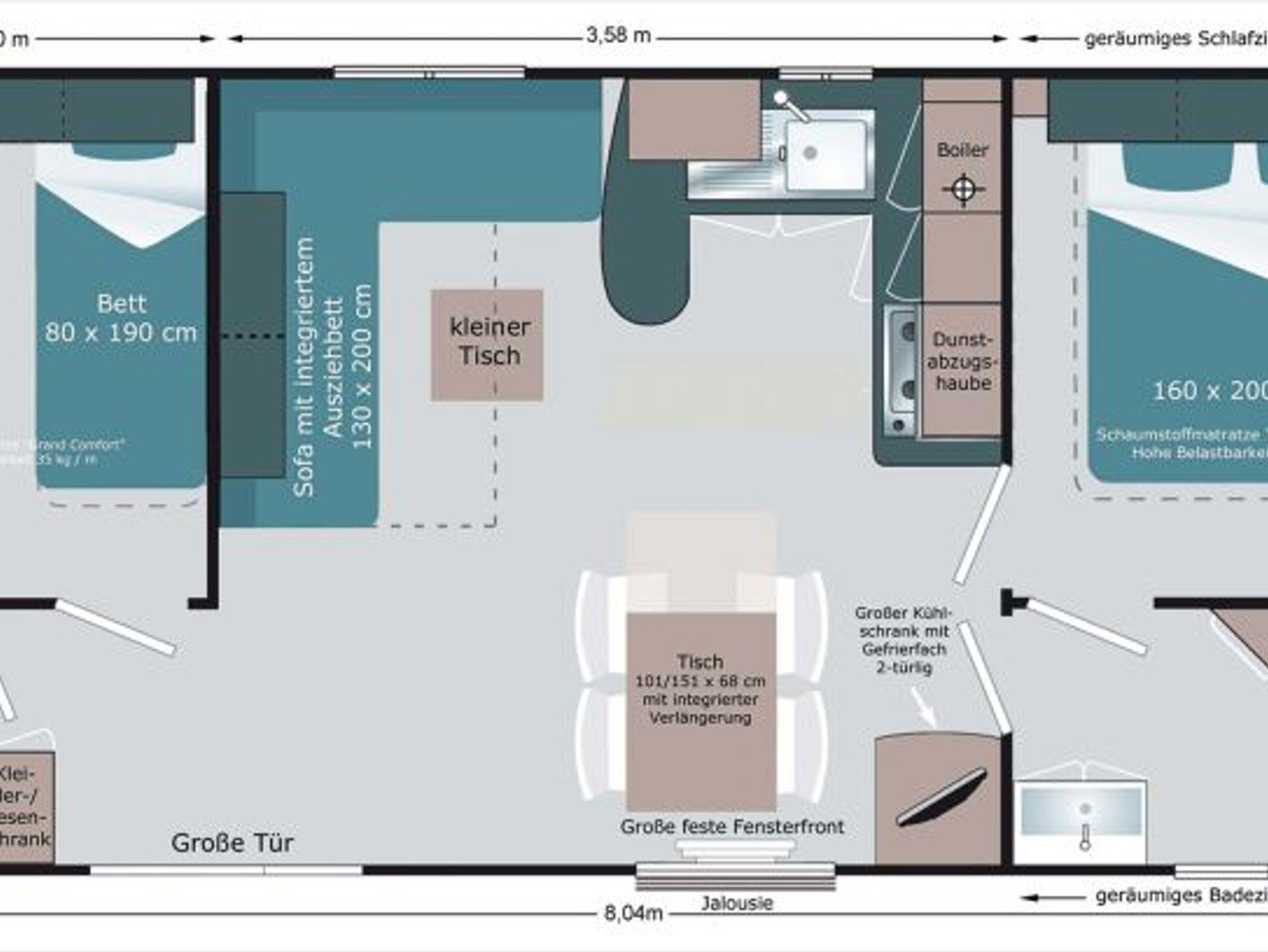 Die modern und gemütlich eingerichteten Mobilheime sind für bis zu 4 Personen eingerichtet.