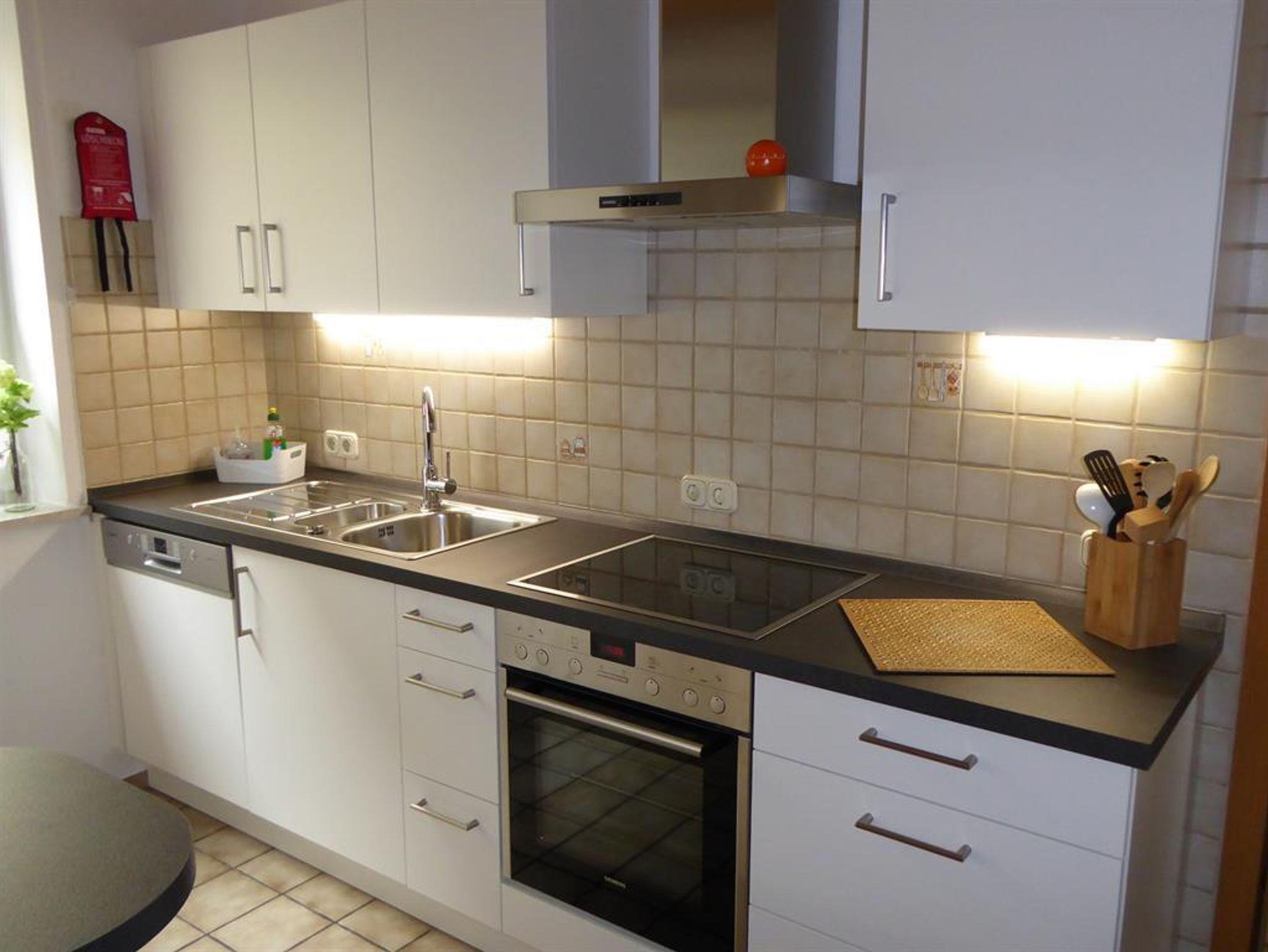 Moderne Einbauküche mit Spülmaschine,4 Platten- Ceranfeld,Backofen/Grill,Dunstabzugshaube,Kühlschrank mit Gefrierfach,Mikrowelle/Grill, Wasserkocher,Kaffeemaschine mit Kaffeefilter,Toaster,Eierk.,digitale Küchenwaage,Handmixer,Pürierstab,Waffeleisen,Gewürze,Spülmittel, div. weiteres Kücheninventar;