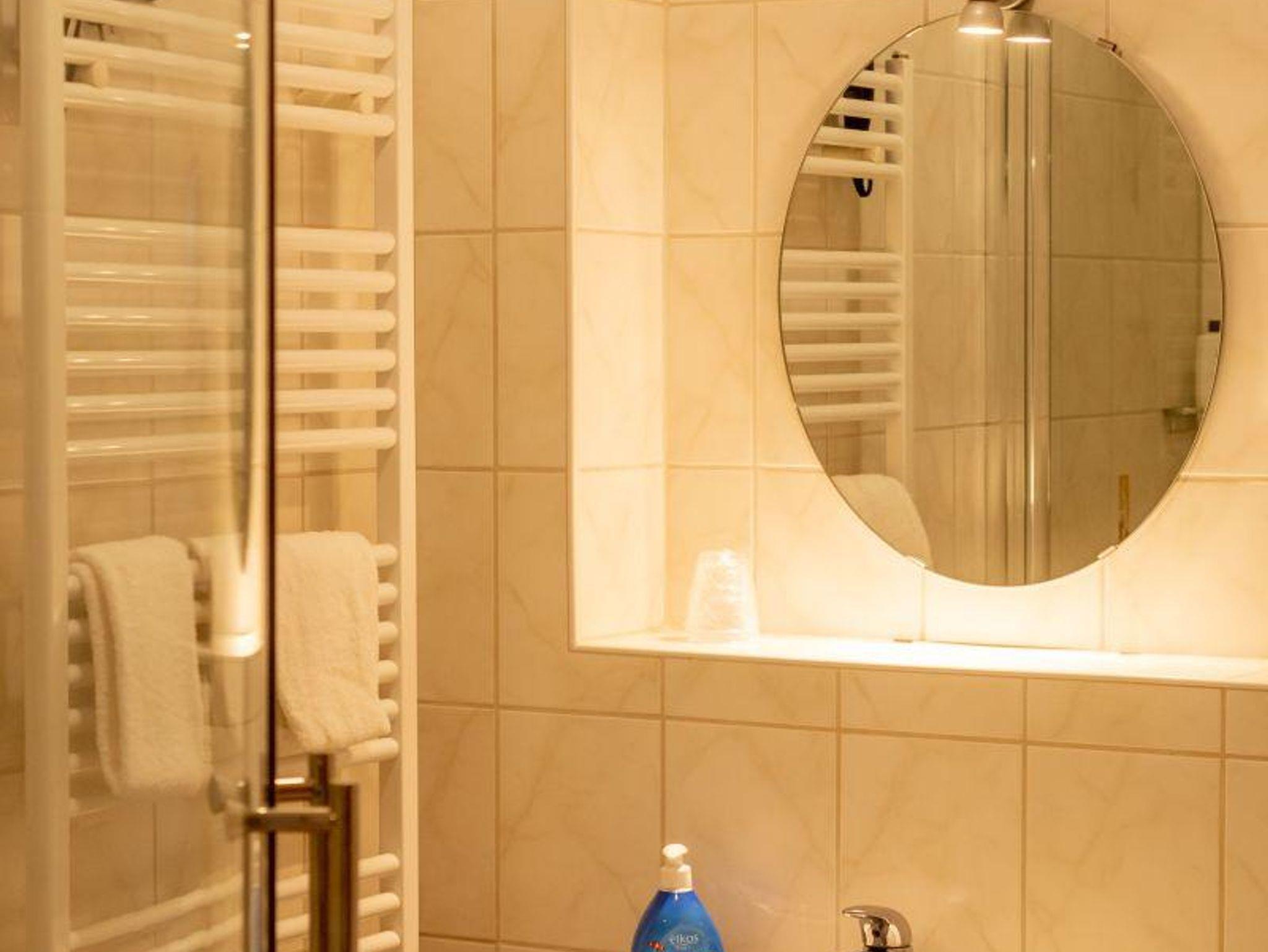 Unsere Gästezimmer, in warmen Farbtönen gehalten, befinden sich im Haupthaus in der 1. Etage und sind über Treppen zu erreichen. Sie sind komfortabel mit einem Doppelbett, eigenem Bad mit WC und Dusche eingerichtet.