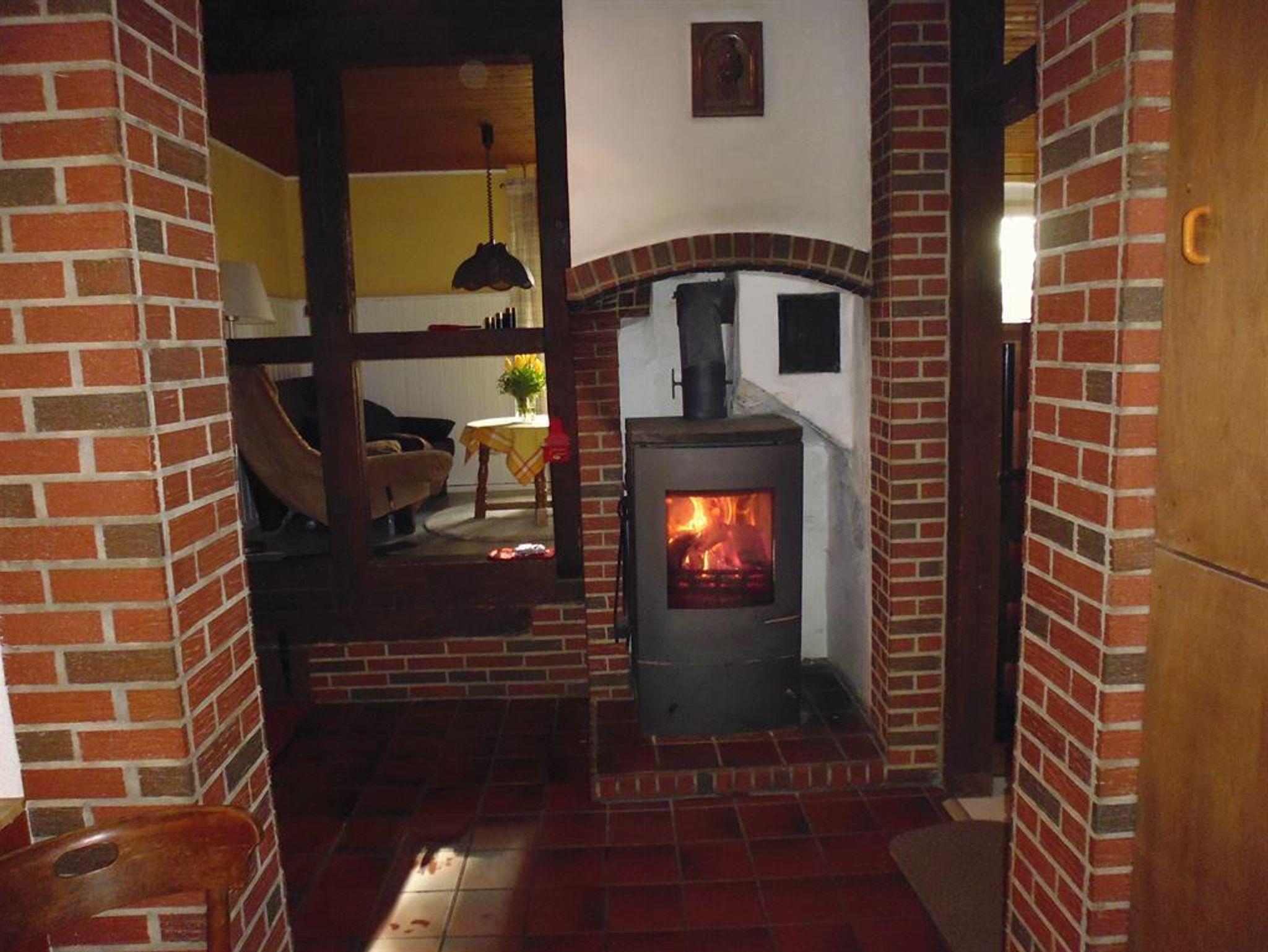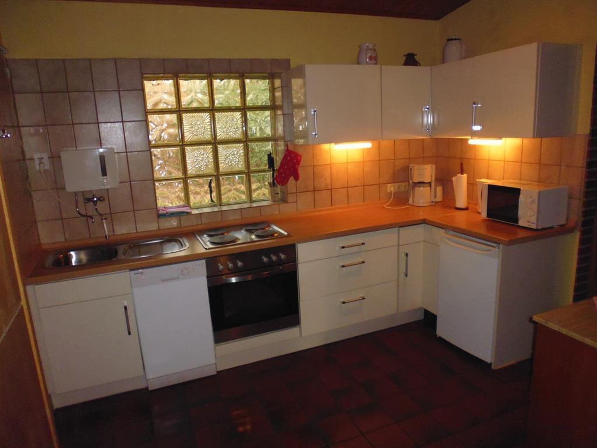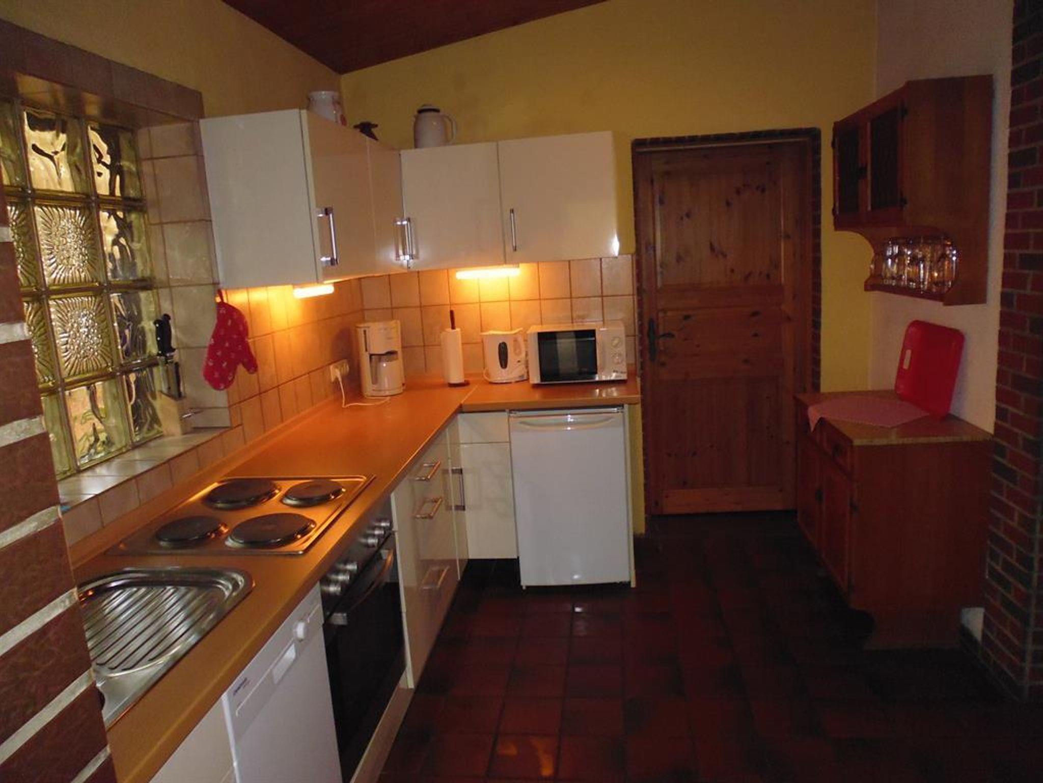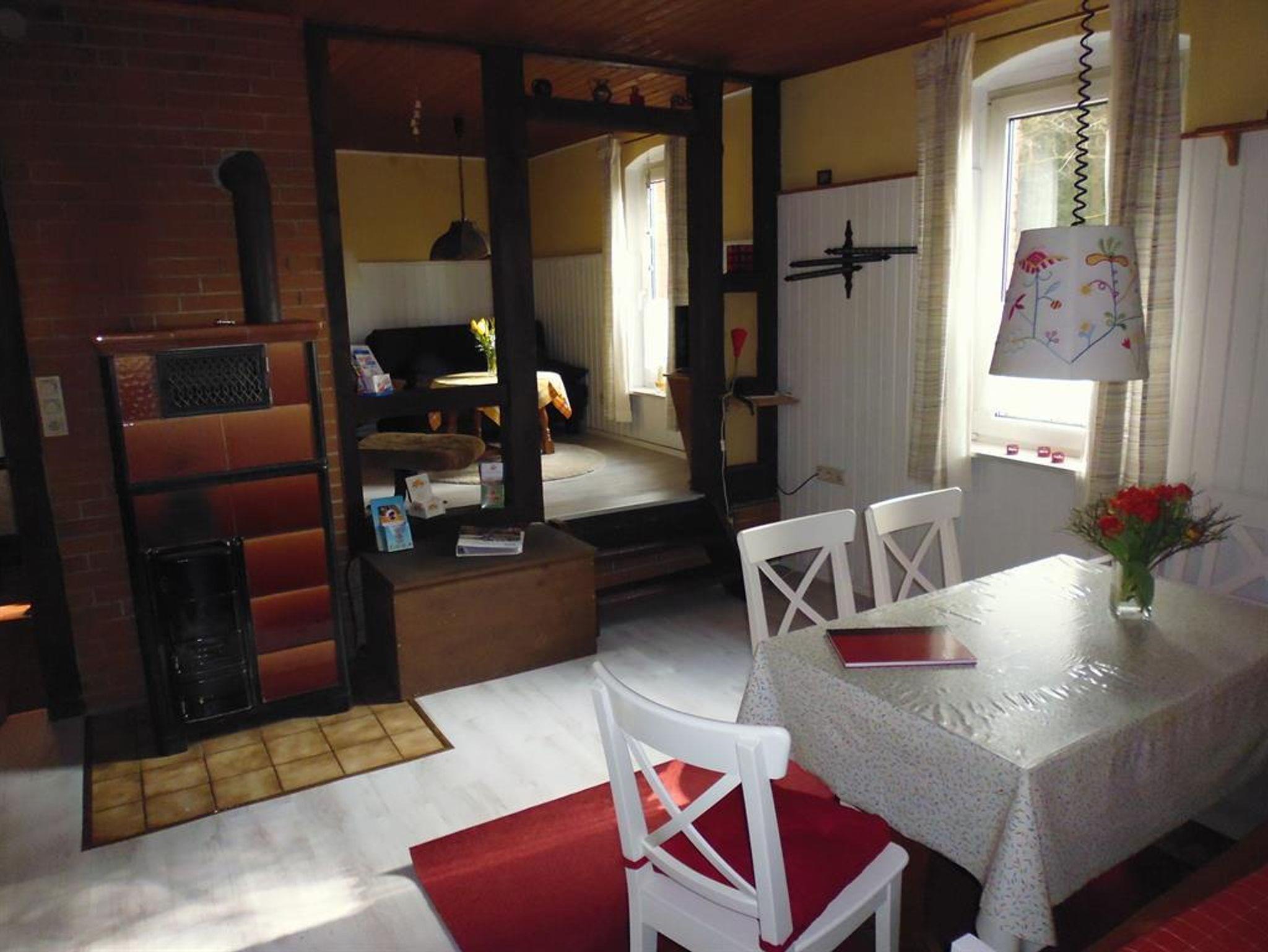 Unten: Fachwerk, Wohnraum in 2 Ebenen, 2 Kaminöfen, 1 Schlafzimmer mit Ehebetten und ein Hoch- bzw. Etagenbett, Küchenzeile mit Backofenherd und Geschirrspüler im Eingangsbereich, Duschbad, überdachte Terrasse und Grill.