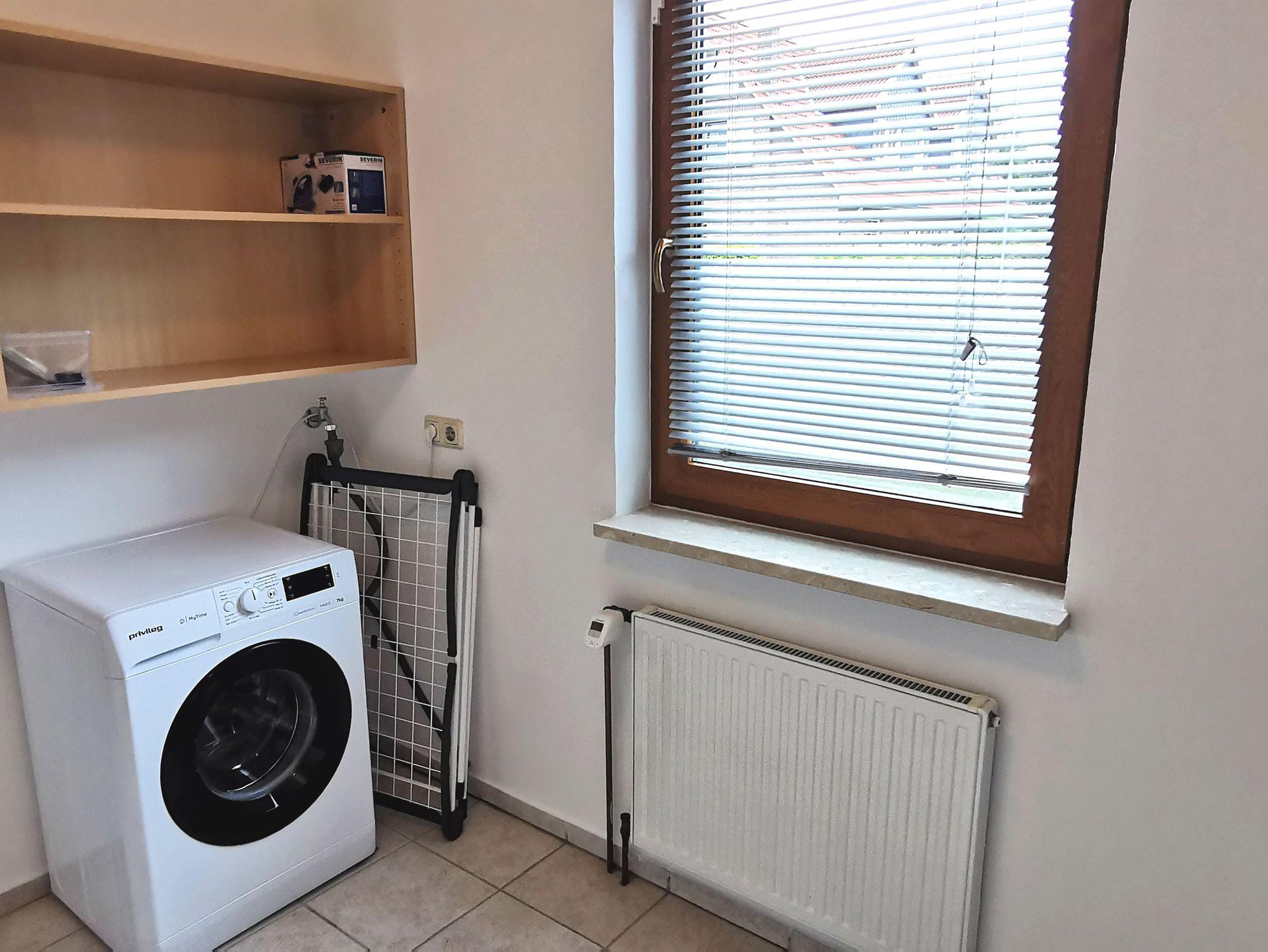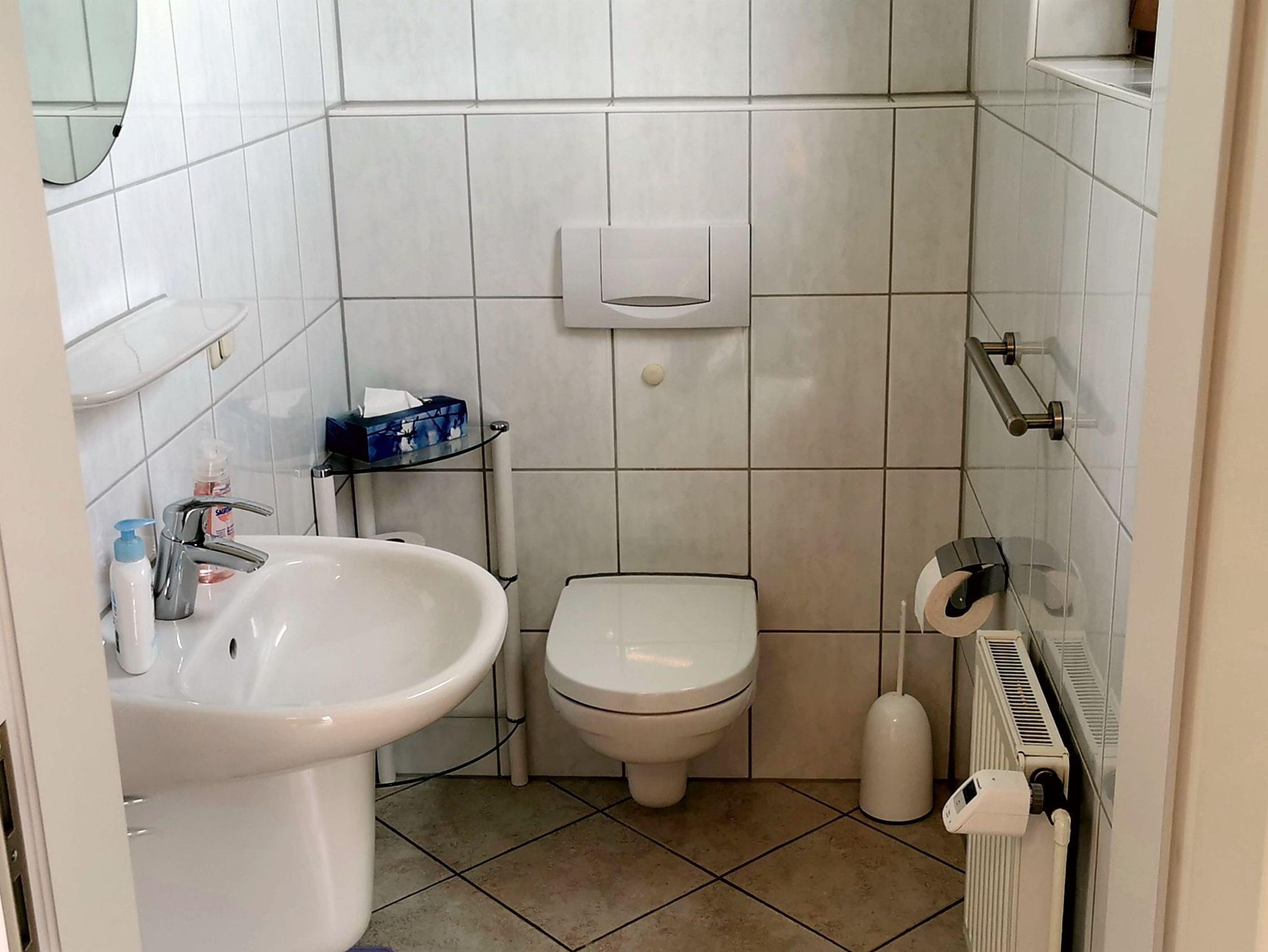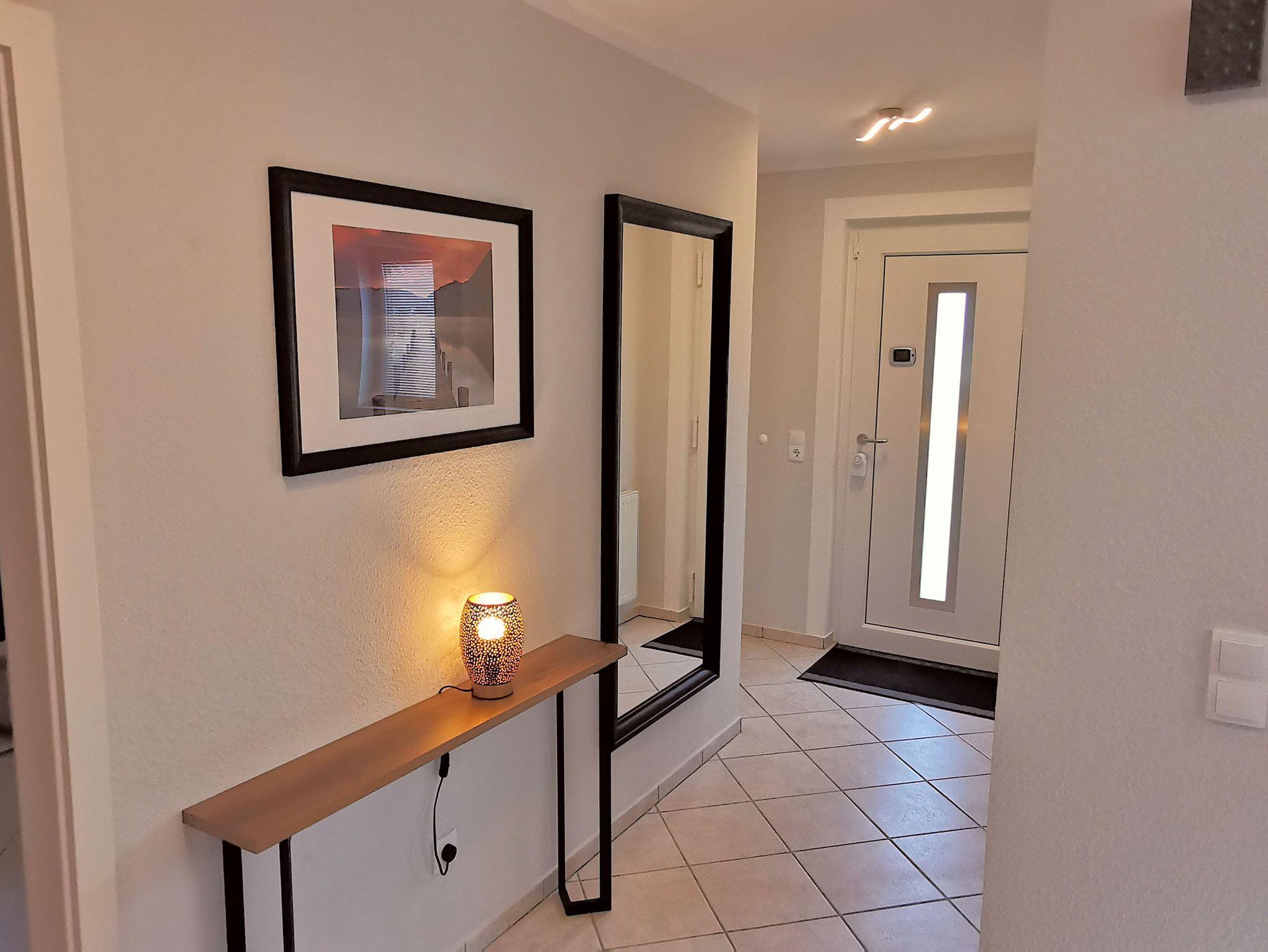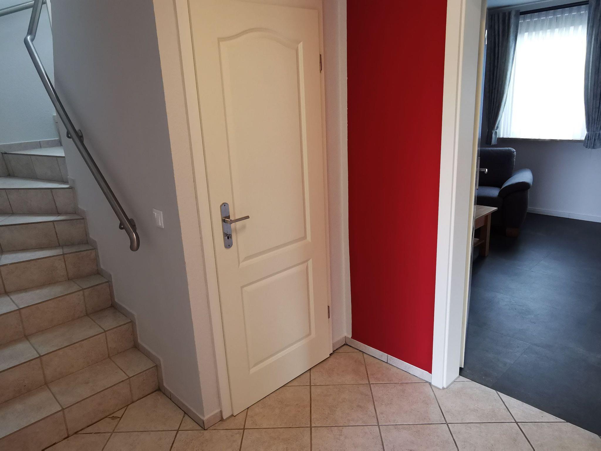 Betreten Sie das Haus durch den Flur mit Garderobe, von dem aus Sie alle Wohnbereiche erreichen. Gleich links liegt ein Gäste-WC mit Waschbecken, und rechts befindet sich ein praktischer Hauswirtschaftsraum mit Waschmaschine.