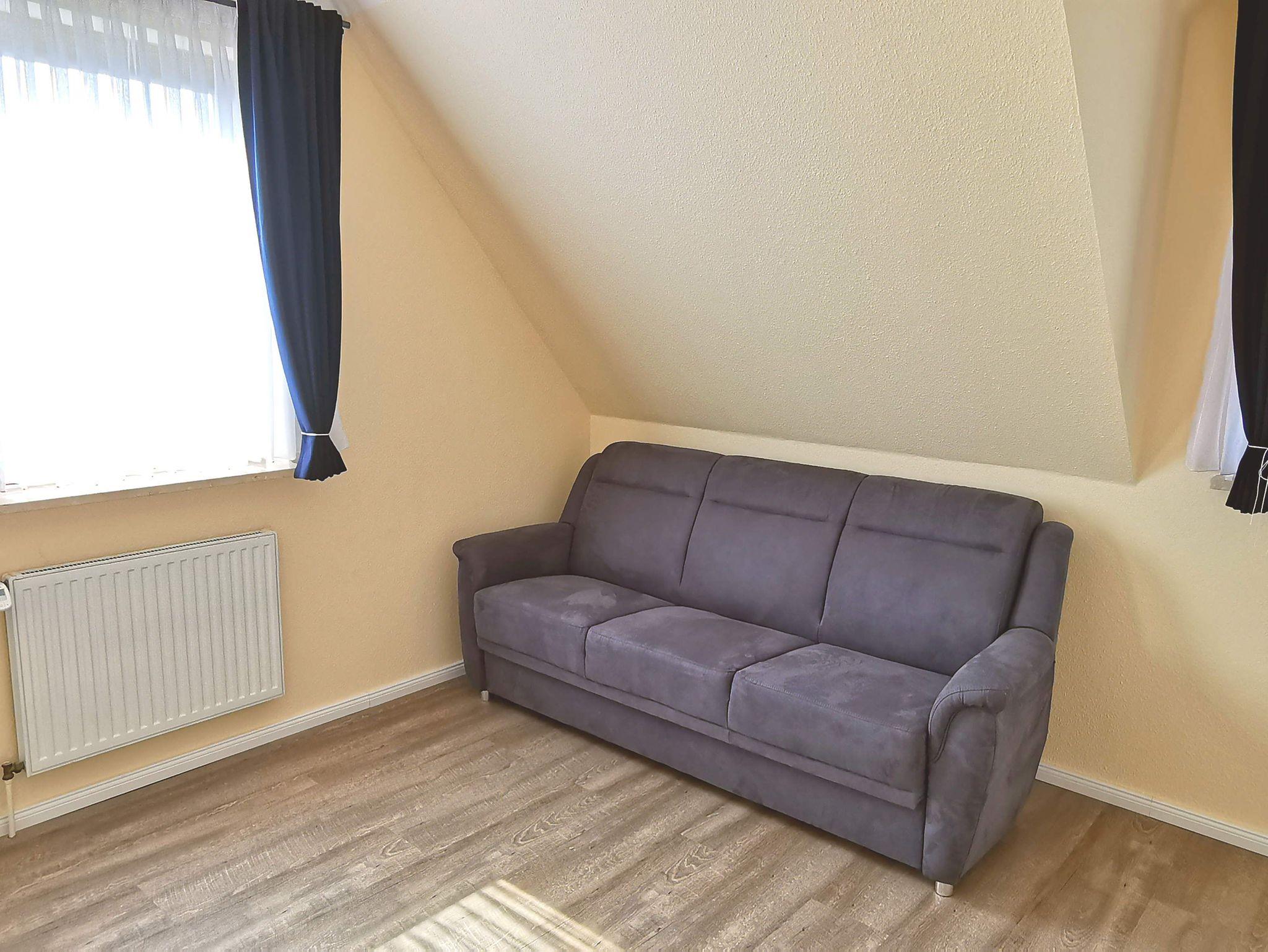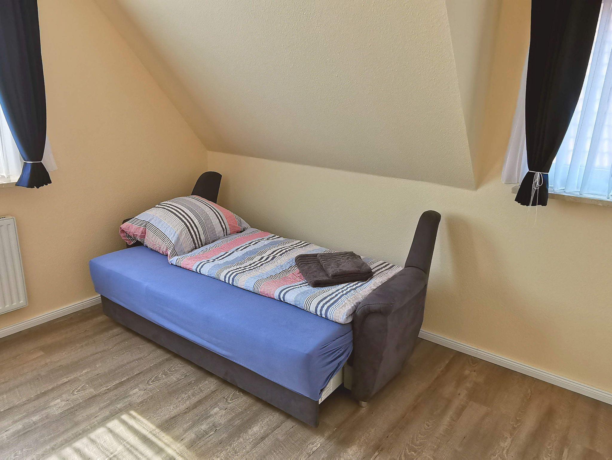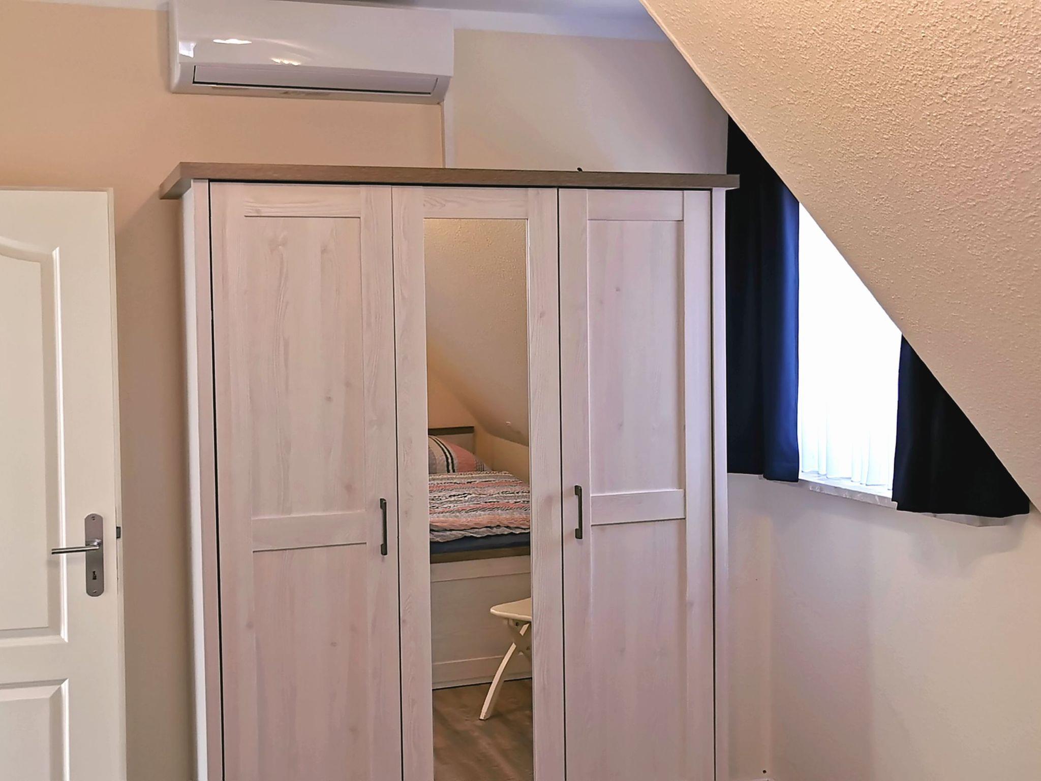 Im Obergeschoss befinden sich die beiden Schlafzimmer beide auf Wunsch mit Klimaanlage sowie das geräumige Badezimmer mit Badewanne und Dusche. Das größere Schlafzimmer verfügt über ein Doppelbett (1,8 x 2,0 m) sowie ein Schlafsofa, das als zusätzliche Schlafgelegenheit genutzt werden kann. Die Liegefläche des Sofas beträgt 1,0 x 1,9 m. Das kleinere Schlafzimmer ist mit zwei Einzelbetten (0,80 x 2,0 m) ausgestattet.