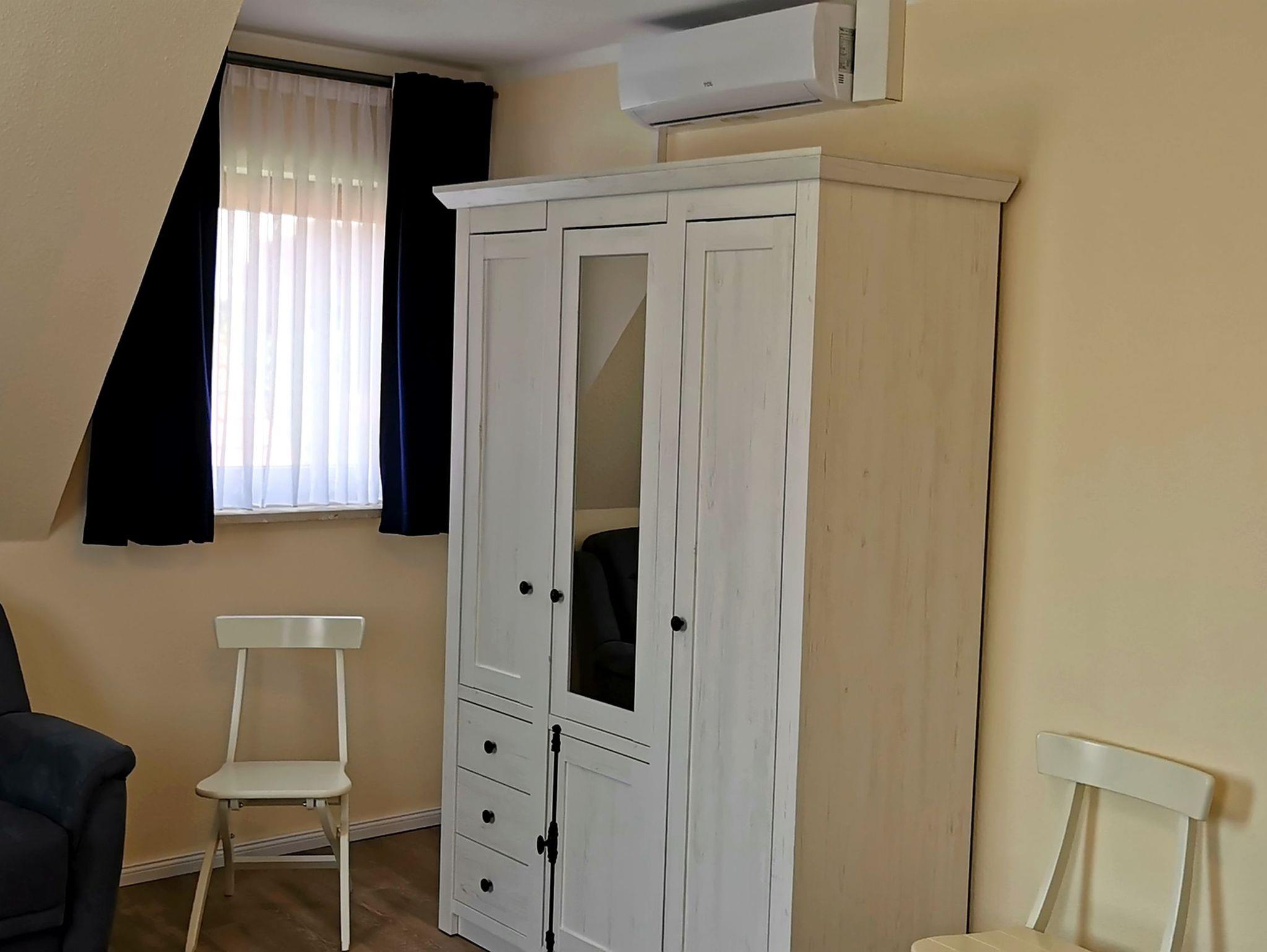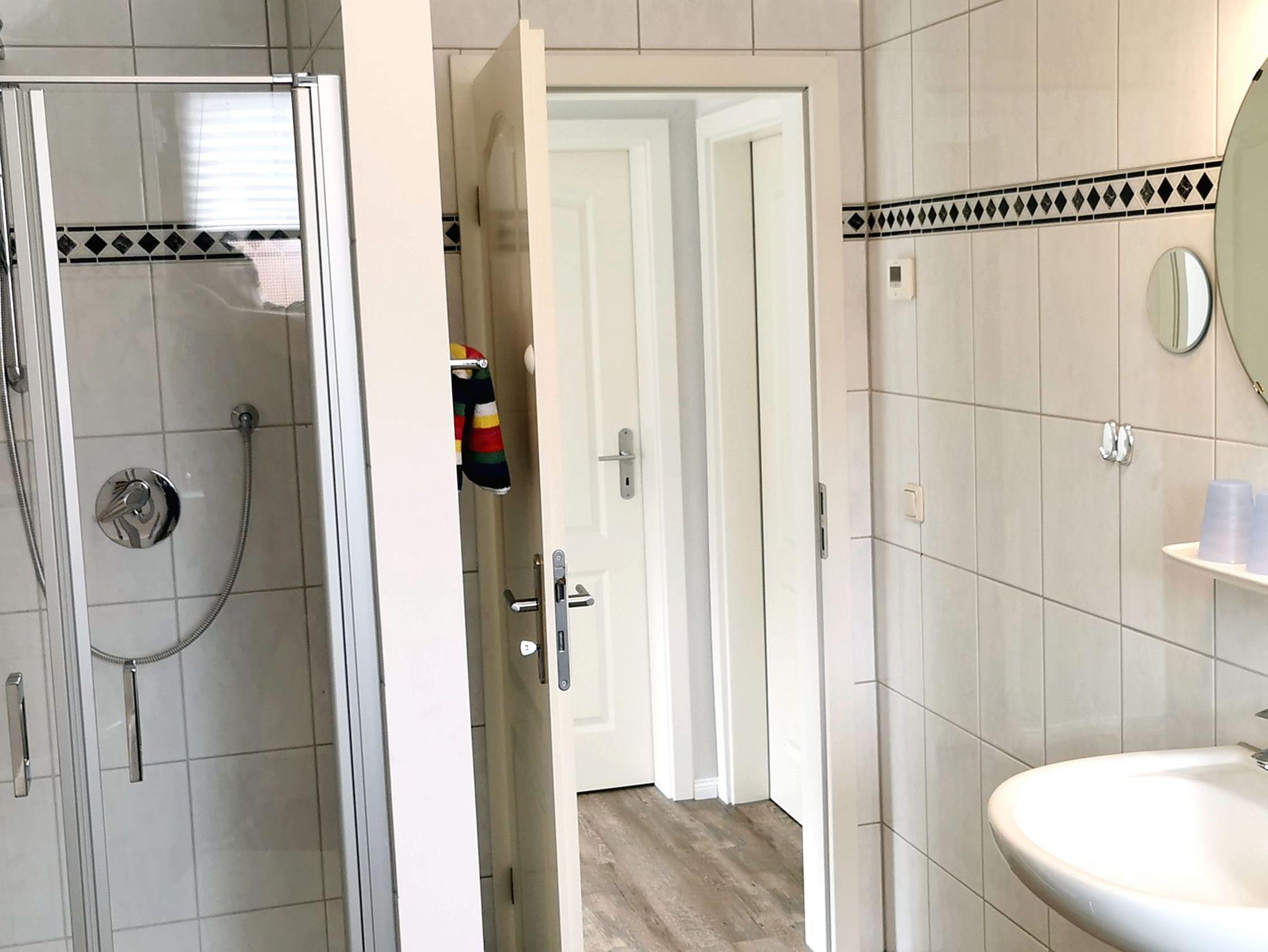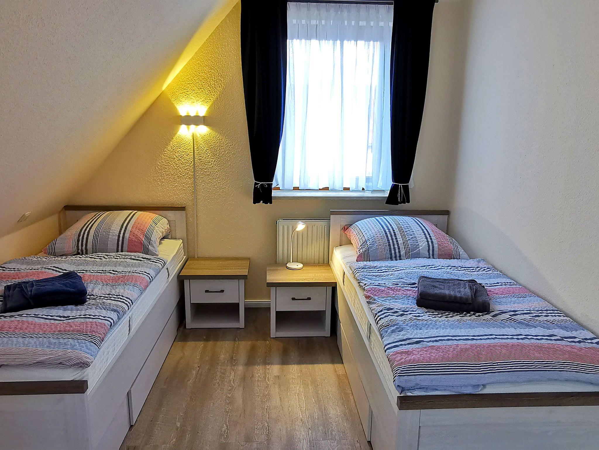 Im Obergeschoss befinden sich die beiden Schlafzimmer beide auf Wunsch mit Klimaanlage sowie das geräumige Badezimmer mit Badewanne und Dusche. Das größere Schlafzimmer verfügt über ein Doppelbett (1,8 x 2,0 m) sowie ein Schlafsofa, das als zusätzliche Schlafgelegenheit genutzt werden kann. Die Liegefläche des Sofas beträgt 1,0 x 1,9 m. Das kleinere Schlafzimmer ist mit zwei Einzelbetten (0,80 x 2,0 m) ausgestattet.