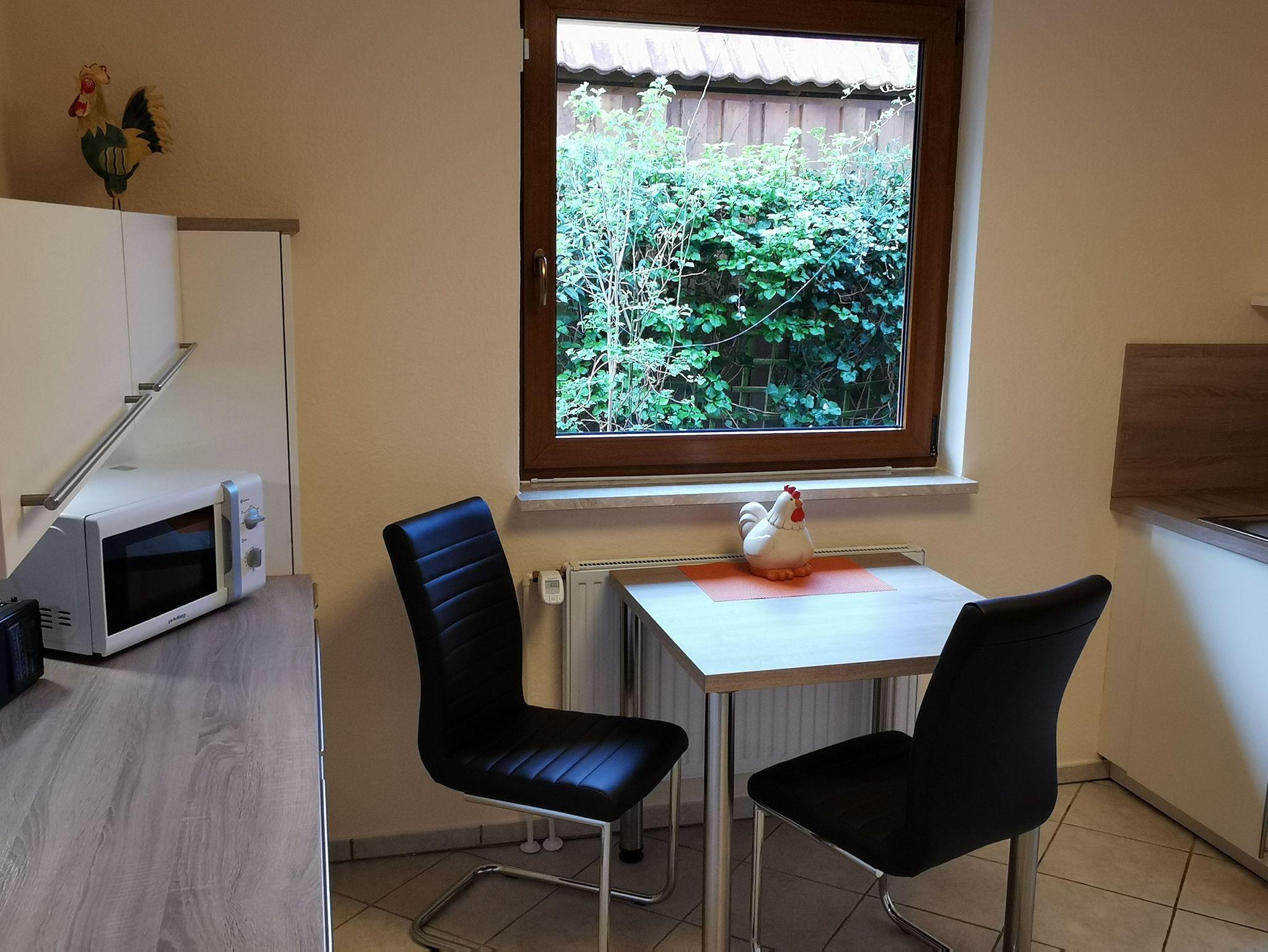 Weiter hinten links erwartet Sie unsere komplett ausgestattete Küche, in der Sie mit Kühl-/Gefrierkombination, Herd, Mikrowelle, Airfryer, Kaffeemaschine, Toaster und Wasserkocher alles vorfinden, was das Herz begehrt. Vom Flur aus gelangen Sie geradeaus in den gemütlichen Wohn- und Essbereich, der Sie direkt auf die sichtgeschützte Terrasse führt.