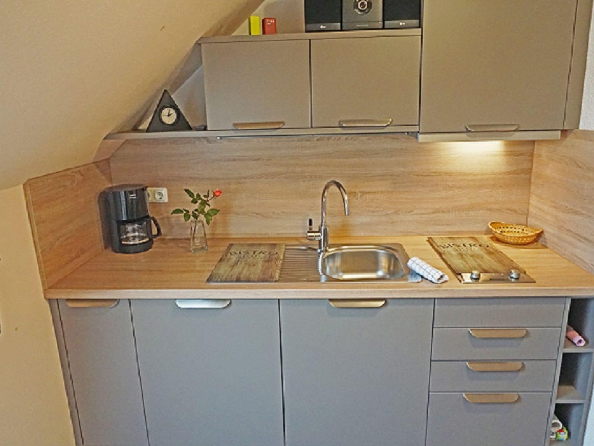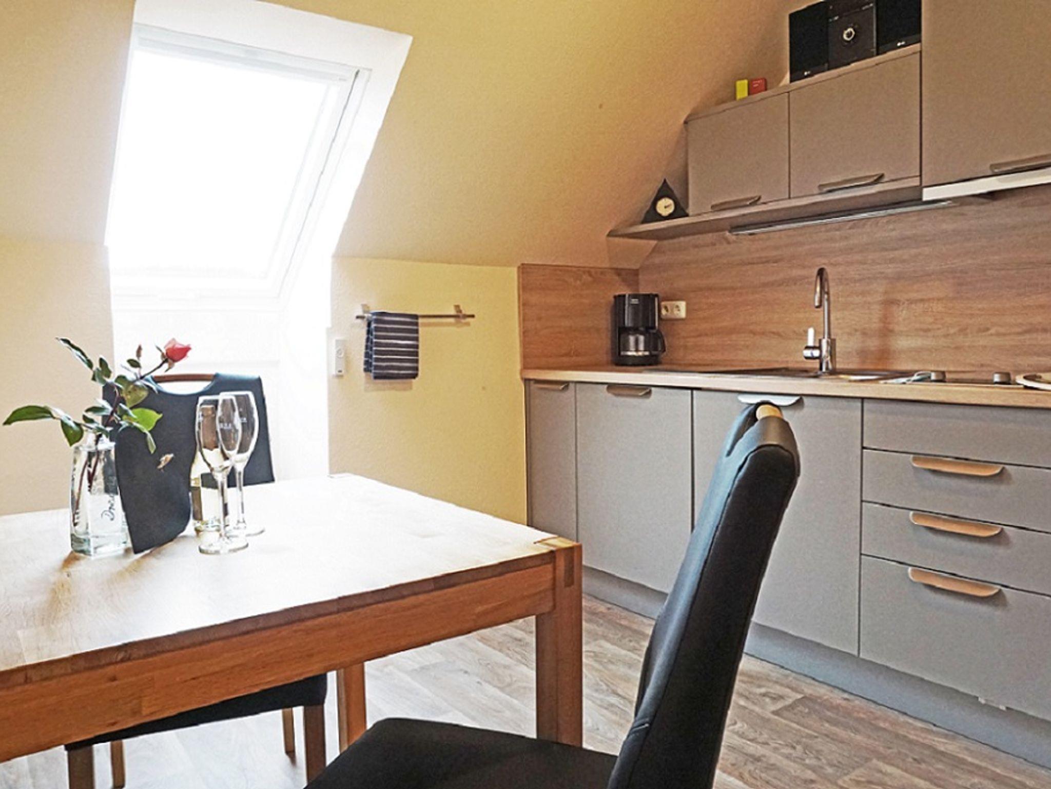 Separater Essbereich mit kleiner Küche, Dunstabzug, Kühlschrank mit Gefrierfach, Kaffeemaschine, Wasserkocher, Toaster, Eierkocher