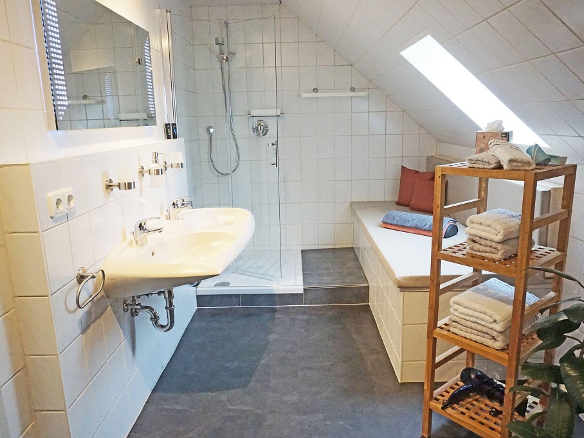 Bad mit Dusche und WC, Fön, Seifenspender, LED-Kosmetikspiegel, Kosmetiktücher