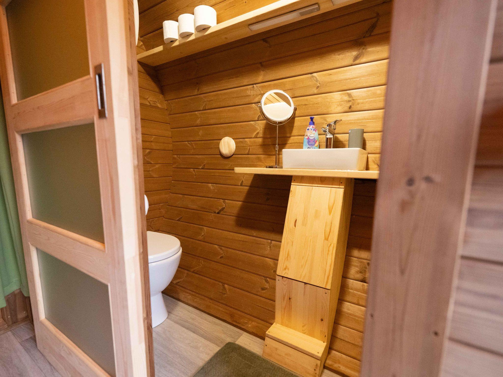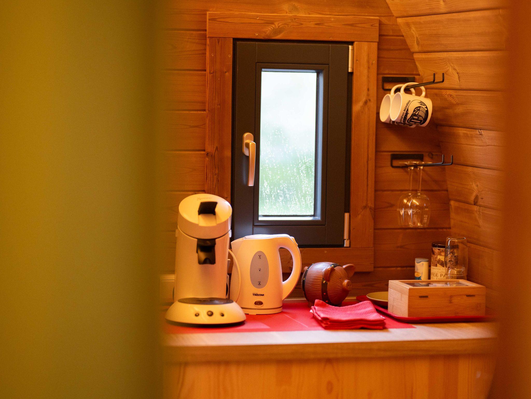 Das moderne Badezimmer ist mit WC und Dusche ausgestattet und bietet Ihnen Handtücher sowie einen Föhn. Der Kühlschrank ist mit Wein und Wasser zur Selbstbedienung gefüllt. Eine Kaffeemaschine und ein Wasserkocher sowie Teller, Besteck und Gläser sind selbstverständlich vorhanden.