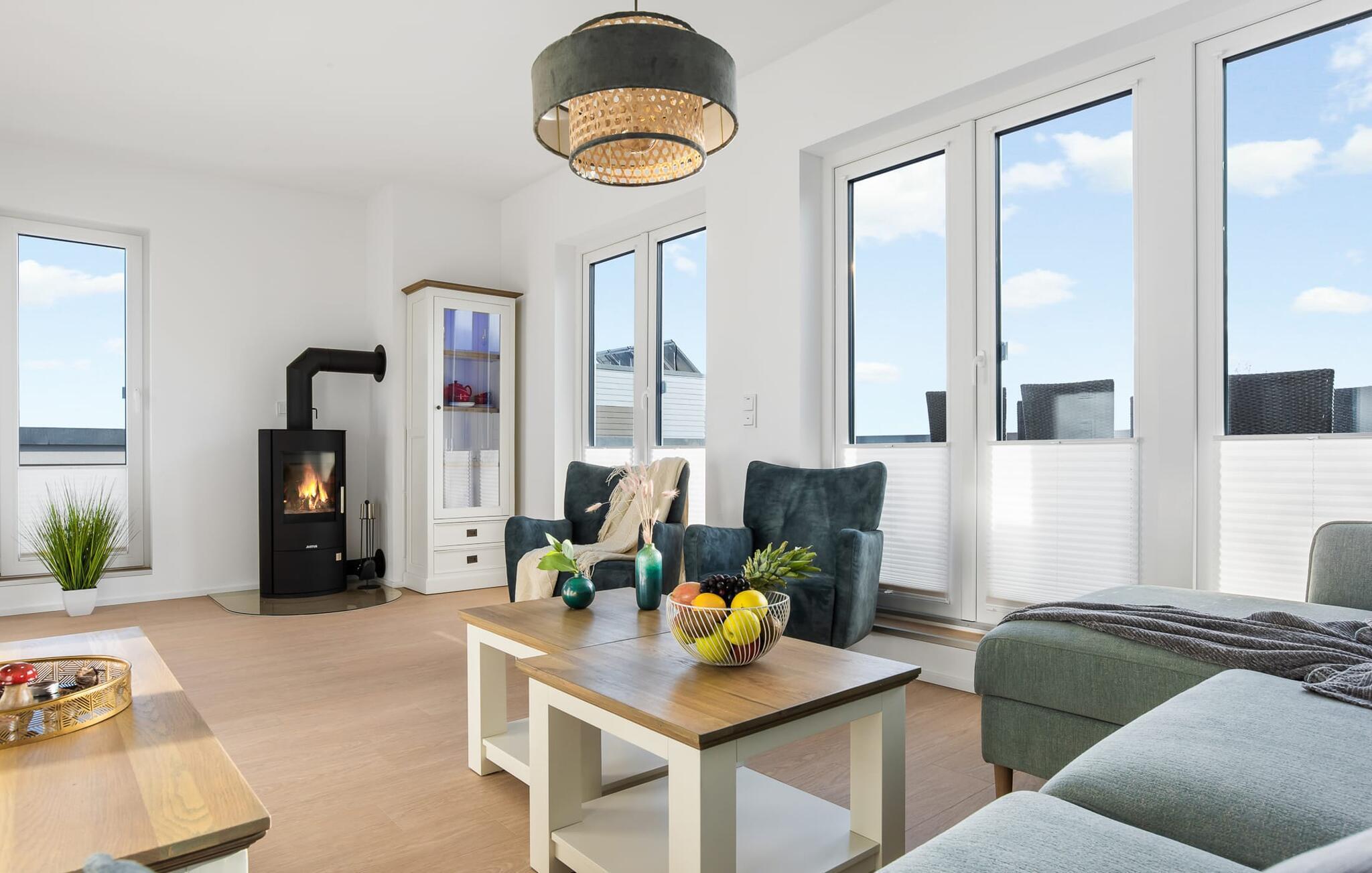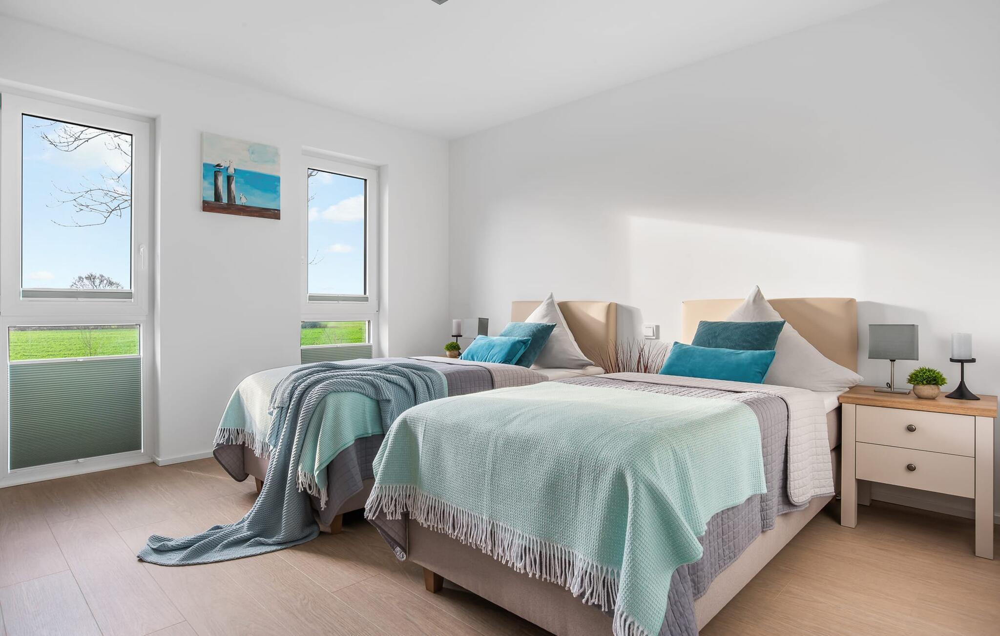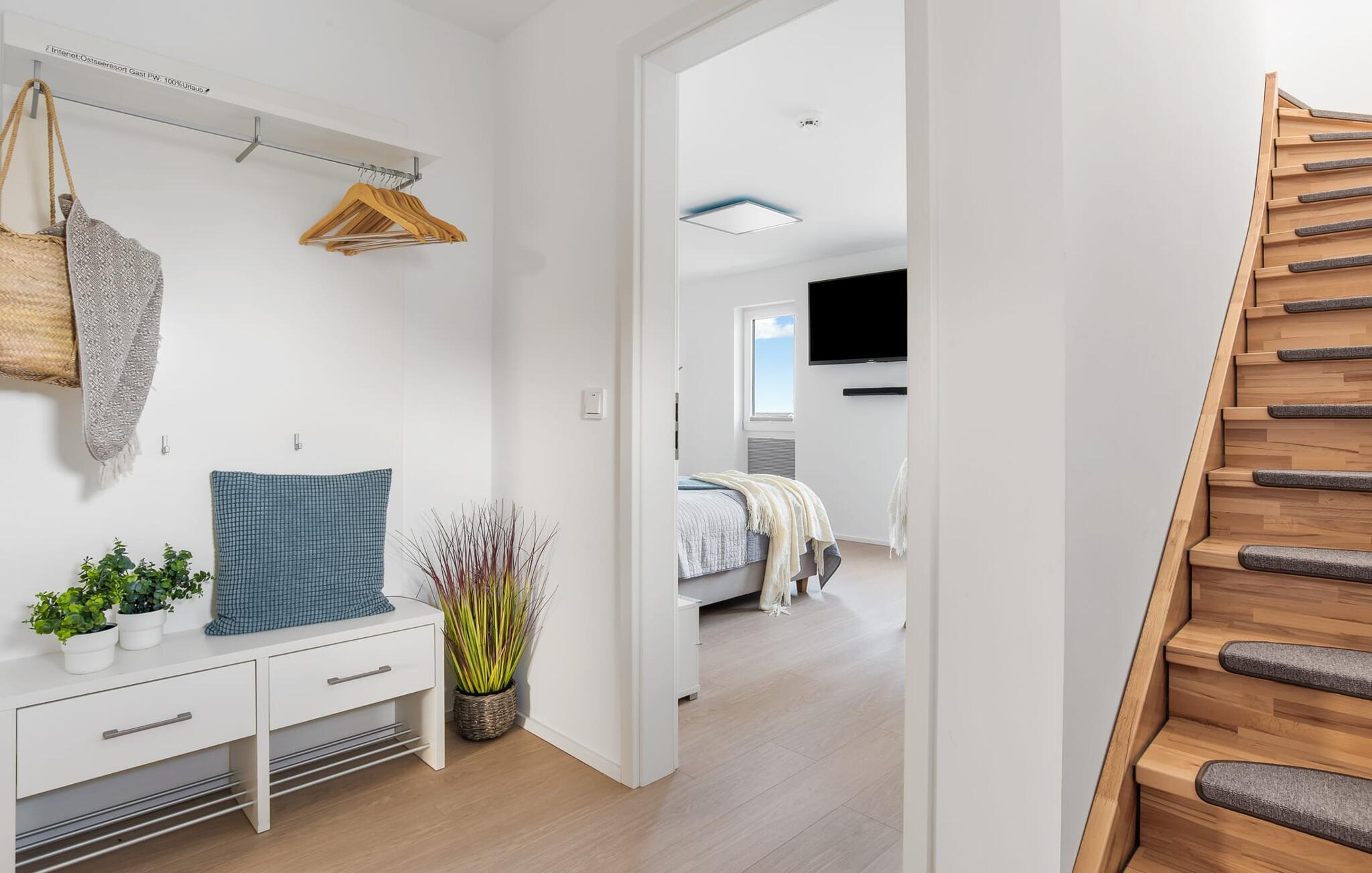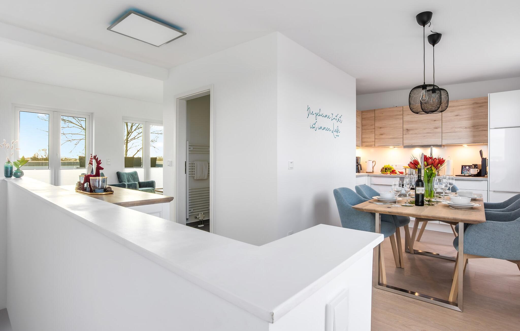 SOMMERWIND er en rummelig og rummelig maisonette ferielejlighed på 1. og 2. sal med direkte udsigt til de naturbevarende strandenge og marker. Sandstranden Weidefelder med kiosk, restaurant og strandstole ligger i gåafstand og er et attraktivt rejsemål på alle tider af året. Minigolfbanen med maritimt tema ligger også i umiddelbar nærhed og glæder både store og små. Når I træder ind i ferielejligheden på første sal, begynder nedbremsningen fra allerførste øjeblik. I er direkte i afslapningsområdet i SOMMERWIND. Lejlighedens tre soveværelser er placeret på denne etage. Uanset hvilket soveværelse I vælger, kan I være sikker på en afslappende søvn. Hvert af soveværelserne er udstyret med et fjernsyn. I det store soveværelse inviterer en stor dobbeltseng til at drømme. Skal I arbejde på en eller to småting, mens I er på ferie, er det nemt muligt her, da I finder et stort skrivebord med en ekstra skærm. Der er også et soveværelse med en lille dobbeltseng til rådighed. Det tredje soveværelse inviterer jer til at sove godt med to enkeltsenge. På denne etage er der også et veludstyret badeværelse med bruser i gulvniveau og infrarød sauna. En oase af velvære, der sikrer afslapning i hver sæson. En gang på anden sal lever SOMMERWIND op til sit navn. Her bydes I velkommen af gulv-til-loft vinduesfronten med den tilstødende terrasse med strandstol og udsigt til de naturbeskyttede strandenge. At komme ind og straks føle sig hjemme er én ting. At slappe af i den hyggelige opholdsstue, nyde naturens fred og ro ud af vinduet eller se tv er ren afslapning og afslapning! Der er også en in-house Netflix-adgang og en Bluetooth-boks til jeres underholdning. I den kolde årstid giver pejsen hyggelige timer. Med få enkle trin kan opholdsrummet omdannes til et ekstra soveplads (1,40 mx 2 m). Takket være den højkvalitets lamelramme kan I sove her, som I er på cloud nine. Det integrerede køkken er perfekt udstyret, og det er sjovt at lave mad sammen. Så nyd de færdige lækkerier på terrassen eller start en hyggelig grillaften... Det er ren ferie. Direkte fra opholdsområdet kommer man ind på den store terrasse med syd-vest orientering. Vender mod bagsiden med udsigt til de naturbevarende strandenge, marker og havet, er hyggelige timer garanteret. Et andet komplet badeværelse med badekar runder ideelt set hele pakken af til en afslappende ferie. Foran ferielejligheden finder I jeres egen parkeringsplads. Vores foretrukne sted: at se ud over markerne på terrassen og nyde SOMMERVINDEN... Bemærk venligst: OstseeResort Olpenitz er meget populært, og der bygges fortsat i parken. Ikke desto mindre kan I se frem til en 5-stjernet standard og et førsteklasses ophold. Byggeaktiviteterne kommer ikke til at forstyrre jer på ferien, og derfor gives der ikke yderligere afslag i prisen.