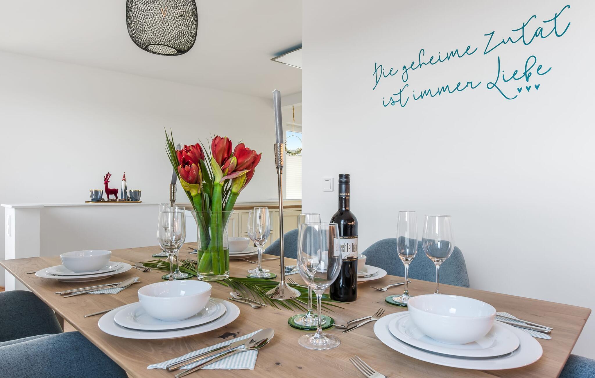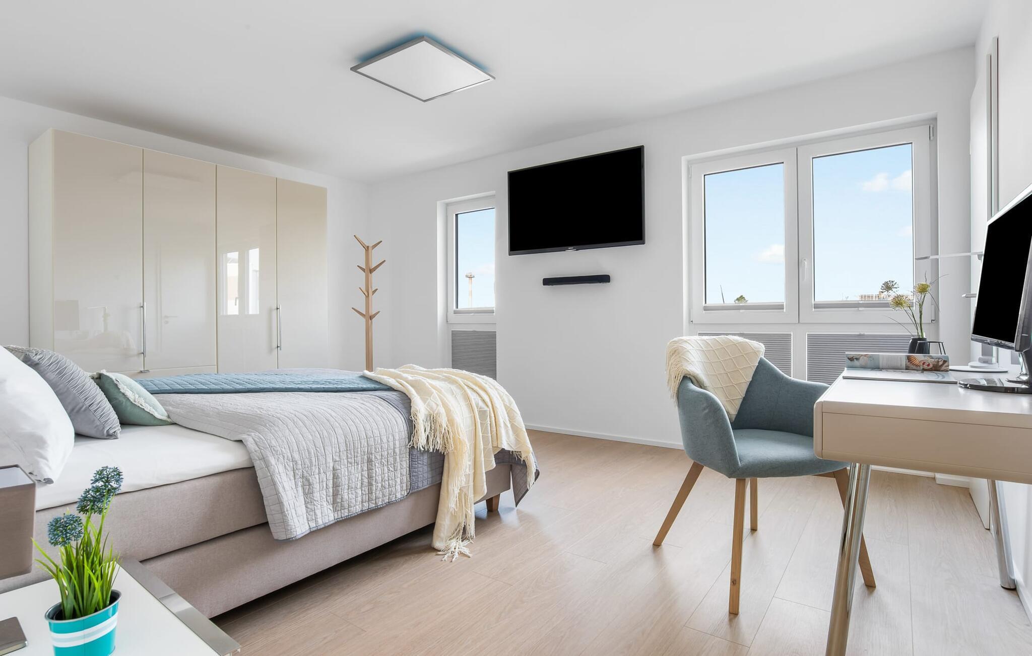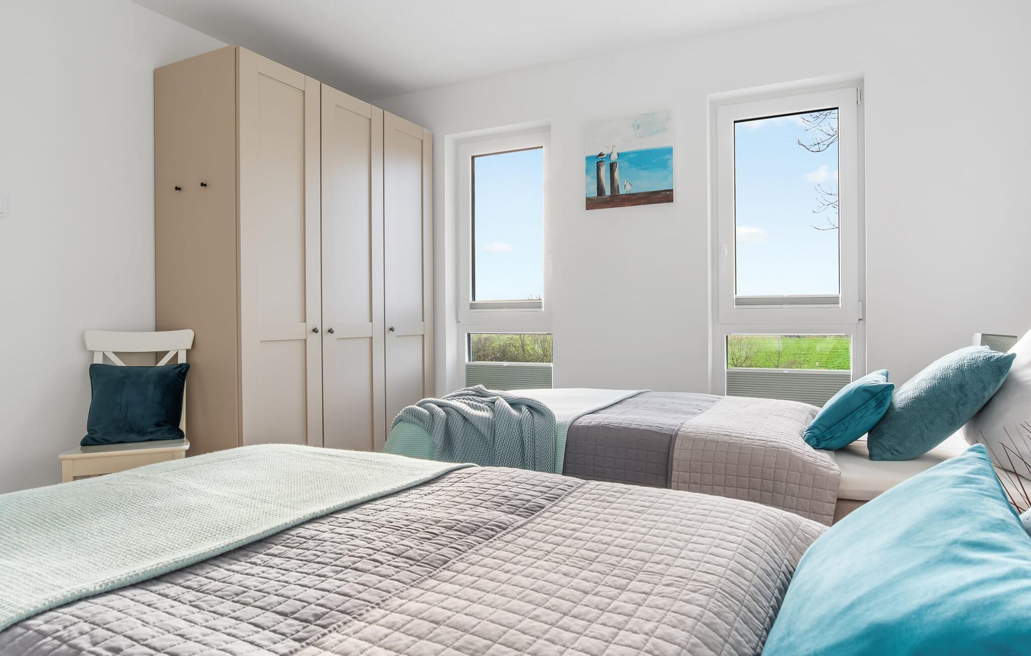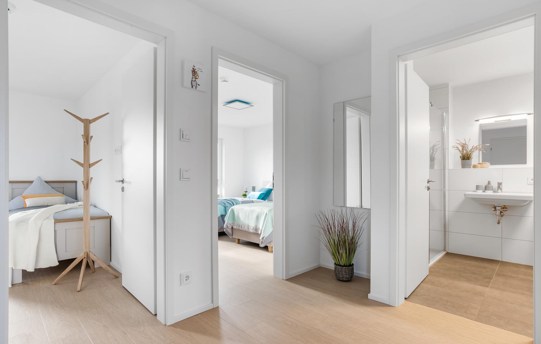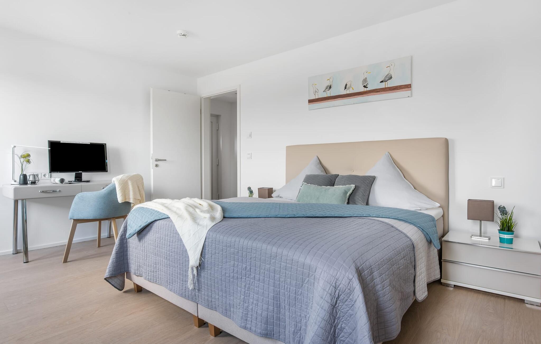 SOMMERWIND er en rummelig og rummelig maisonette ferielejlighed på 1. og 2. sal med direkte udsigt til de naturbevarende strandenge og marker. Sandstranden Weidefelder med kiosk, restaurant og strandstole ligger i gåafstand og er et attraktivt rejsemål på alle tider af året. Minigolfbanen med maritimt tema ligger også i umiddelbar nærhed og glæder både store og små. Når I træder ind i ferielejligheden på første sal, begynder nedbremsningen fra allerførste øjeblik. I er direkte i afslapningsområdet i SOMMERWIND. Lejlighedens tre soveværelser er placeret på denne etage. Uanset hvilket soveværelse I vælger, kan I være sikker på en afslappende søvn. Hvert af soveværelserne er udstyret med et fjernsyn. I det store soveværelse inviterer en stor dobbeltseng til at drømme. Skal I arbejde på en eller to småting, mens I er på ferie, er det nemt muligt her, da I finder et stort skrivebord med en ekstra skærm. Der er også et soveværelse med en lille dobbeltseng til rådighed. Det tredje soveværelse inviterer jer til at sove godt med to enkeltsenge. På denne etage er der også et veludstyret badeværelse med bruser i gulvniveau og infrarød sauna. En oase af velvære, der sikrer afslapning i hver sæson. En gang på anden sal lever SOMMERWIND op til sit navn. Her bydes I velkommen af gulv-til-loft vinduesfronten med den tilstødende terrasse med strandstol og udsigt til de naturbeskyttede strandenge. At komme ind og straks føle sig hjemme er én ting. At slappe af i den hyggelige opholdsstue, nyde naturens fred og ro ud af vinduet eller se tv er ren afslapning og afslapning! Der er også en in-house Netflix-adgang og en Bluetooth-boks til jeres underholdning. I den kolde årstid giver pejsen hyggelige timer. Med få enkle trin kan opholdsrummet omdannes til et ekstra soveplads (1,40 mx 2 m). Takket være den højkvalitets lamelramme kan I sove her, som I er på cloud nine. Det integrerede køkken er perfekt udstyret, og det er sjovt at lave mad sammen. Så nyd de færdige lækkerier på terrassen eller start en hyggelig grillaften... Det er ren ferie. Direkte fra opholdsområdet kommer man ind på den store terrasse med syd-vest orientering. Vender mod bagsiden med udsigt til de naturbevarende strandenge, marker og havet, er hyggelige timer garanteret. Et andet komplet badeværelse med badekar runder ideelt set hele pakken af til en afslappende ferie. Foran ferielejligheden finder I jeres egen parkeringsplads. Vores foretrukne sted: at se ud over markerne på terrassen og nyde SOMMERVINDEN... Bemærk venligst: OstseeResort Olpenitz er meget populært, og der bygges fortsat i parken. Ikke desto mindre kan I se frem til en 5-stjernet standard og et førsteklasses ophold. Byggeaktiviteterne kommer ikke til at forstyrre jer på ferien, og derfor gives der ikke yderligere afslag i prisen.