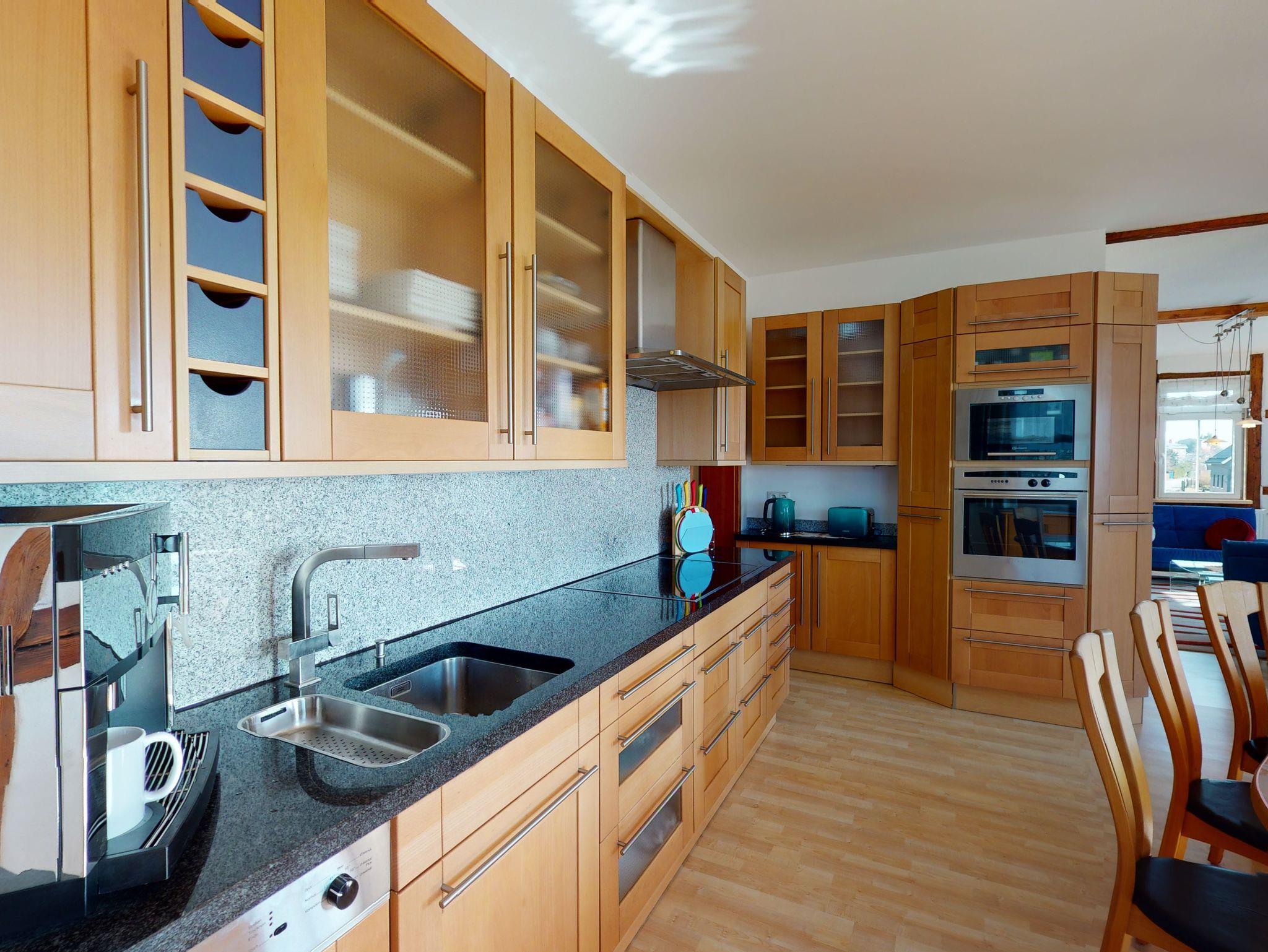 Die komplett ausgestattete Küche mit Backofen, Cerankochfeld, Mikrowelle, Kaffee-Vollautomat von WMF, Kühl-Gefrier Kombination mit separatem Flaschenkühler und Spülmaschine mit integriertem großen Essbereich läßt keine Wünsche offen.