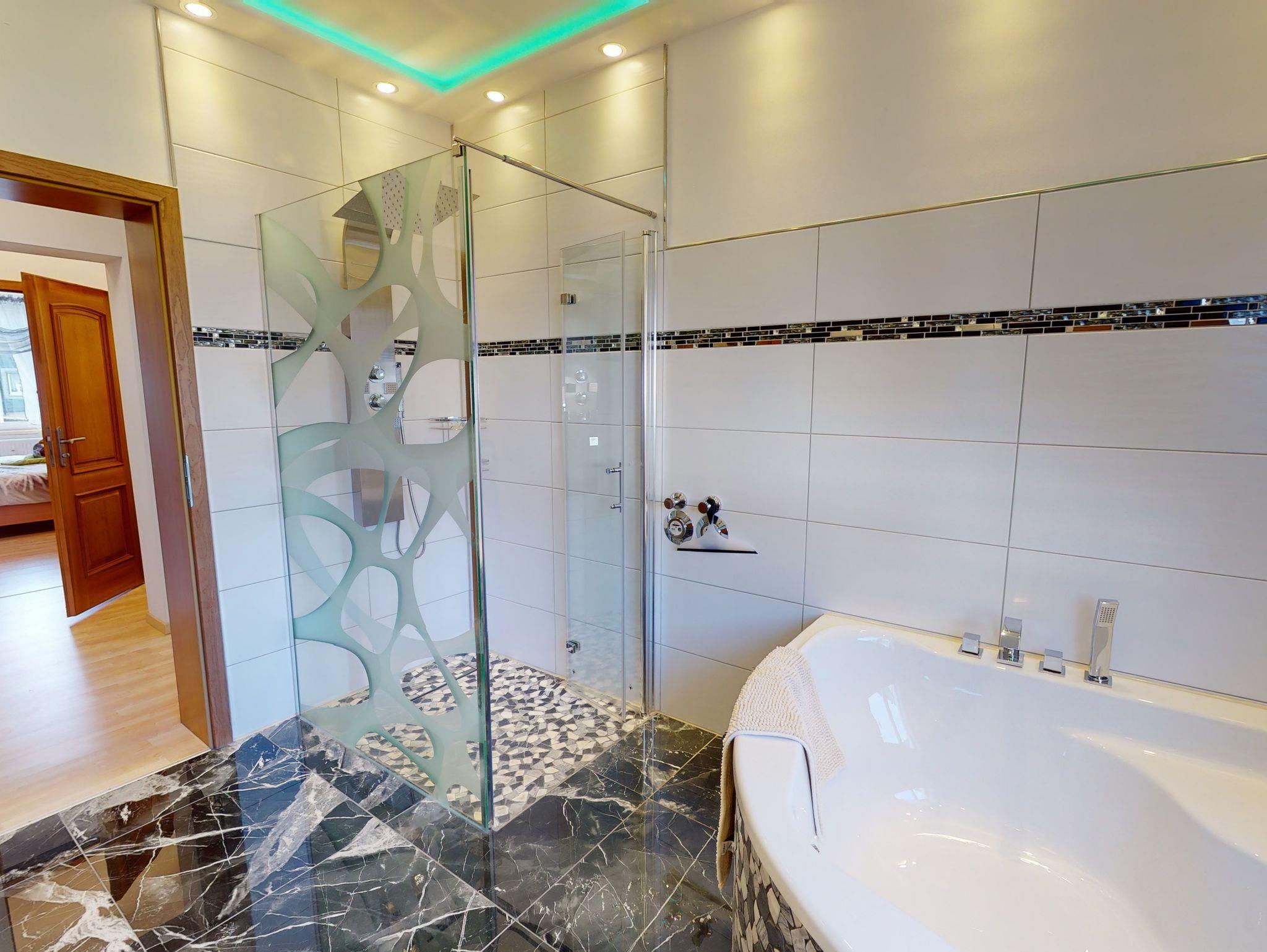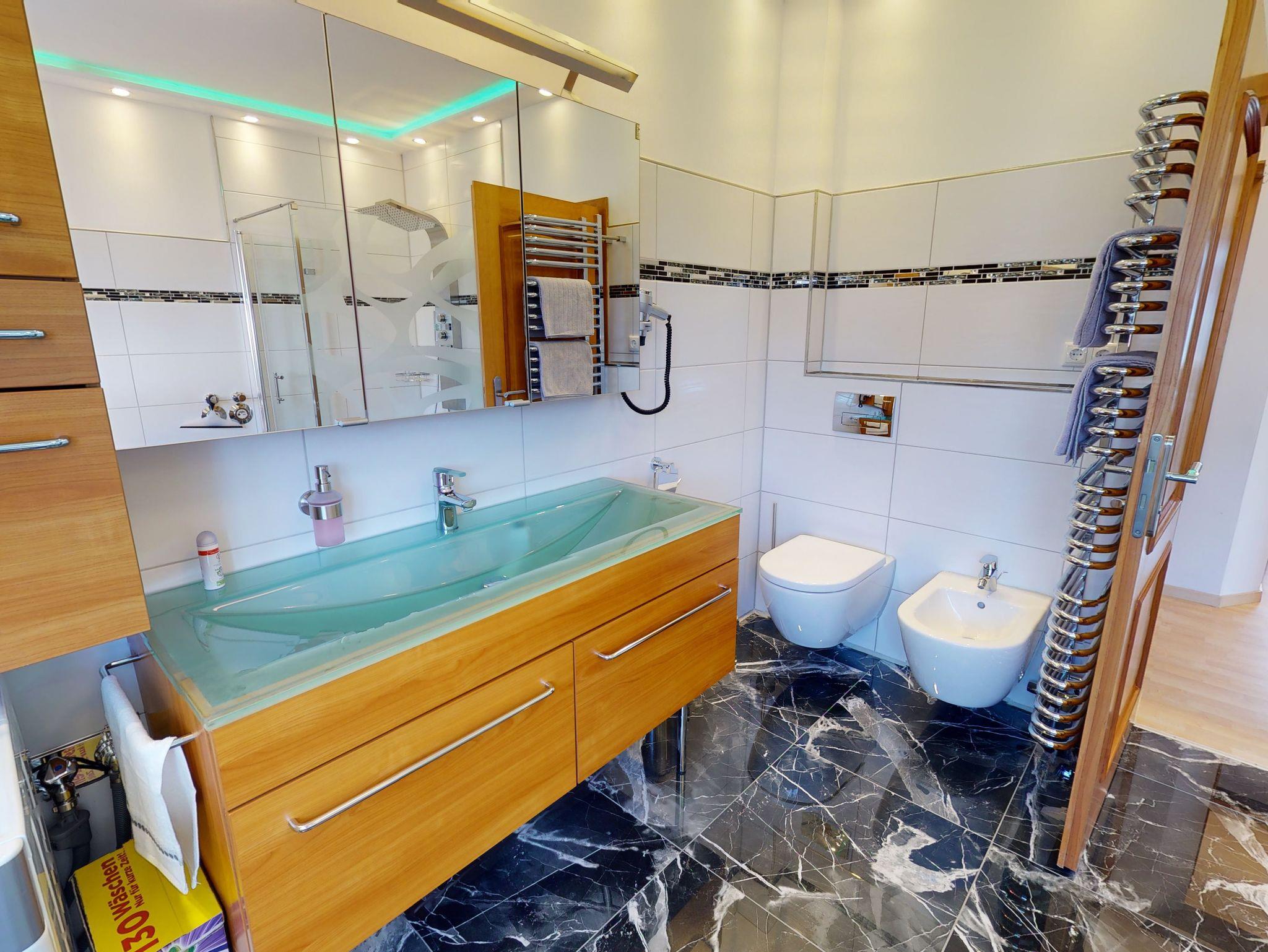 Das große geräumige helle Tageslicht Badezimmer mit großem Waschtisch, Handtuchwärmer, WC und Bidet einer Eckbadewanne und barrierefreier Regendusche lädt zum relaxen ein.