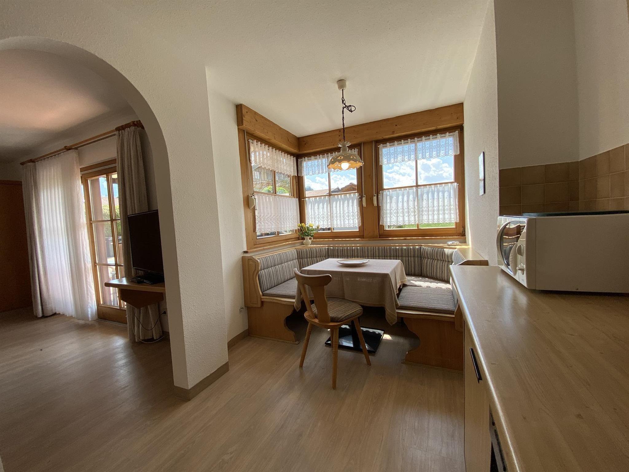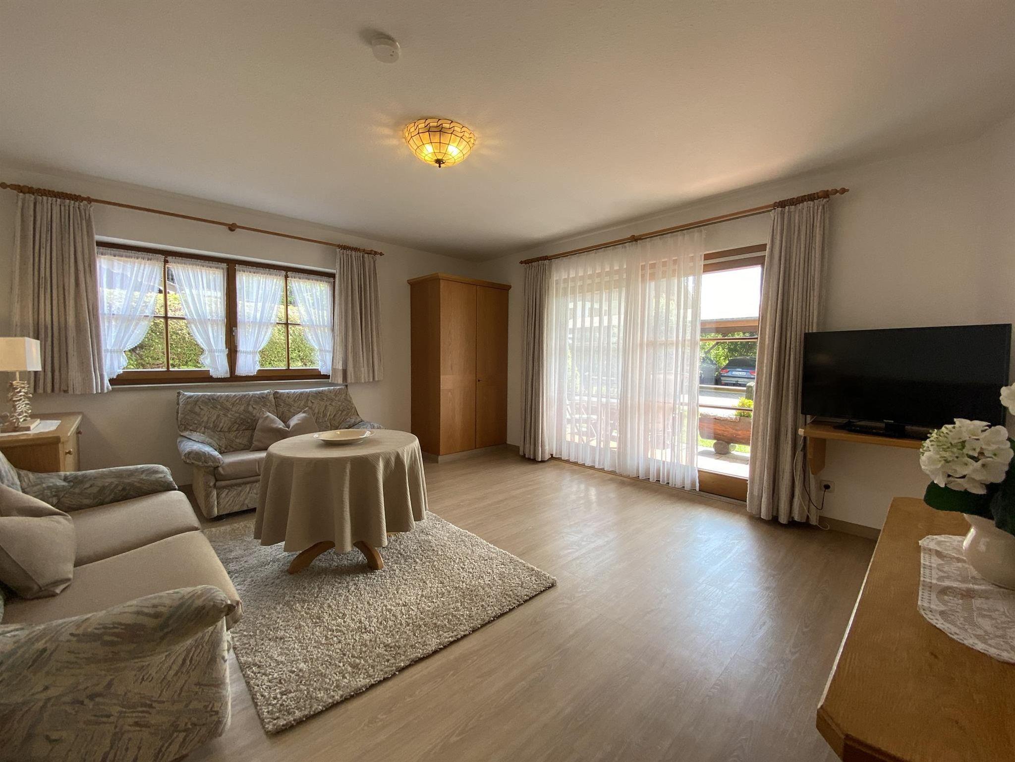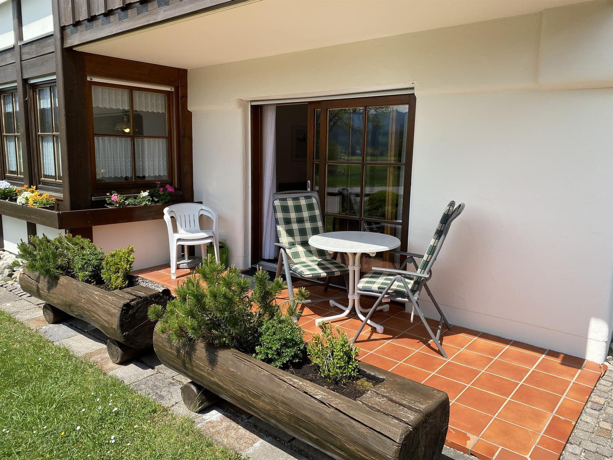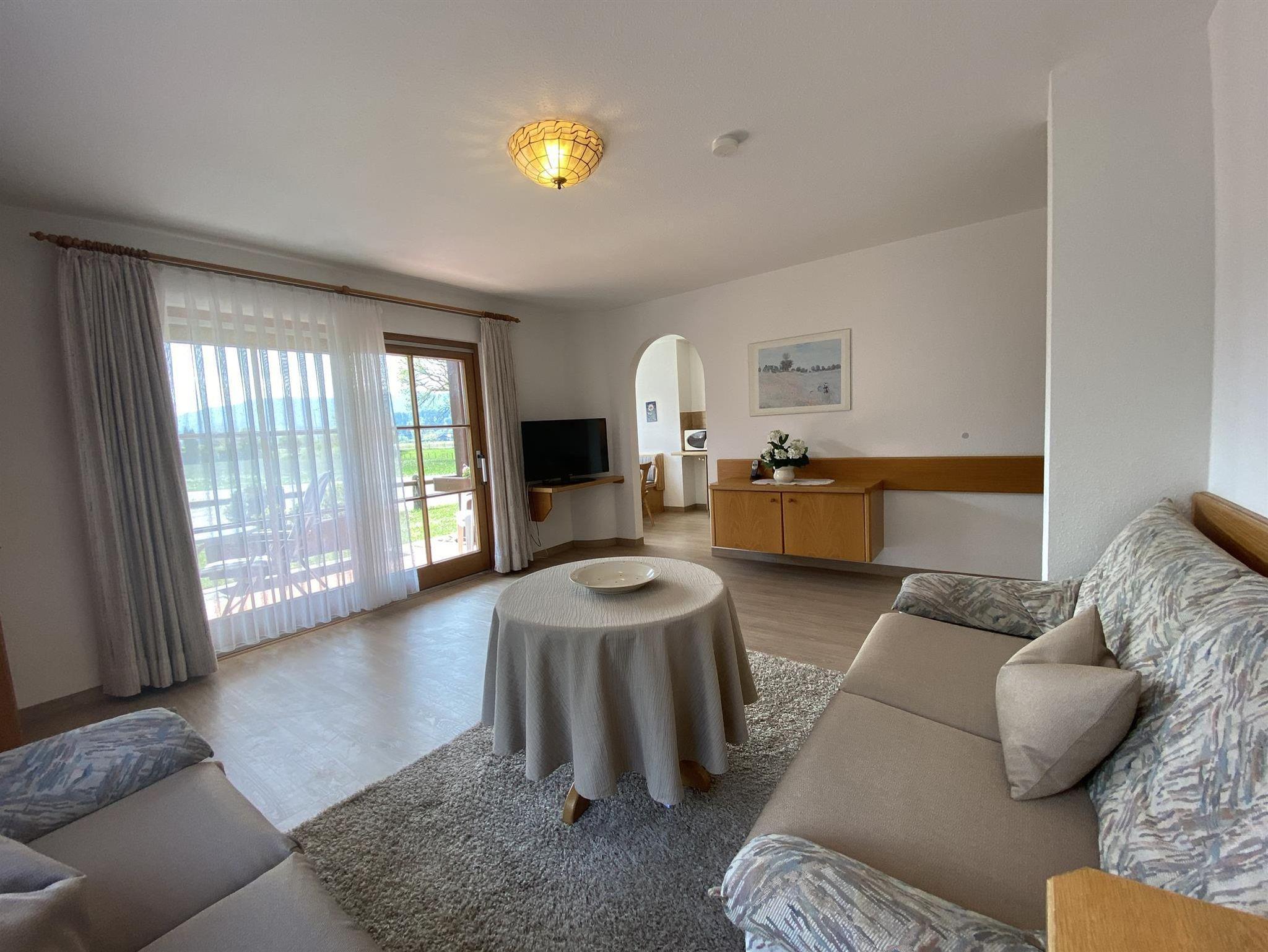 Die bequeme 2-Zimmer-Wohnung ist im EG mit schöner Bergsicht und einladender Südterrasse, davor der Rasengarten. Das helle Wohnzimmer hat breiter Schiebetüre zur Terrasse, die Polstermöbel sind eingeteilt in 2er Sofa, 3er Sofa (Doppel-Ausziehschlafcoutch), Tisch, Kleiderschrank, Bettschrank, Kabel-Flach-TV, daneben ist die Wohnküche mit vorgebautem Erkeressbereich und Einbauküche (Spülmaschine), das Schlafzimmer hat Doppelbetten, Schrank und Schminktisch, im weiss gefliesten Bad ist Wanne, Dusche, WC und Waschbecken, Flur mit Garderobe. In der Wohnung ist Fußbodenheizung.