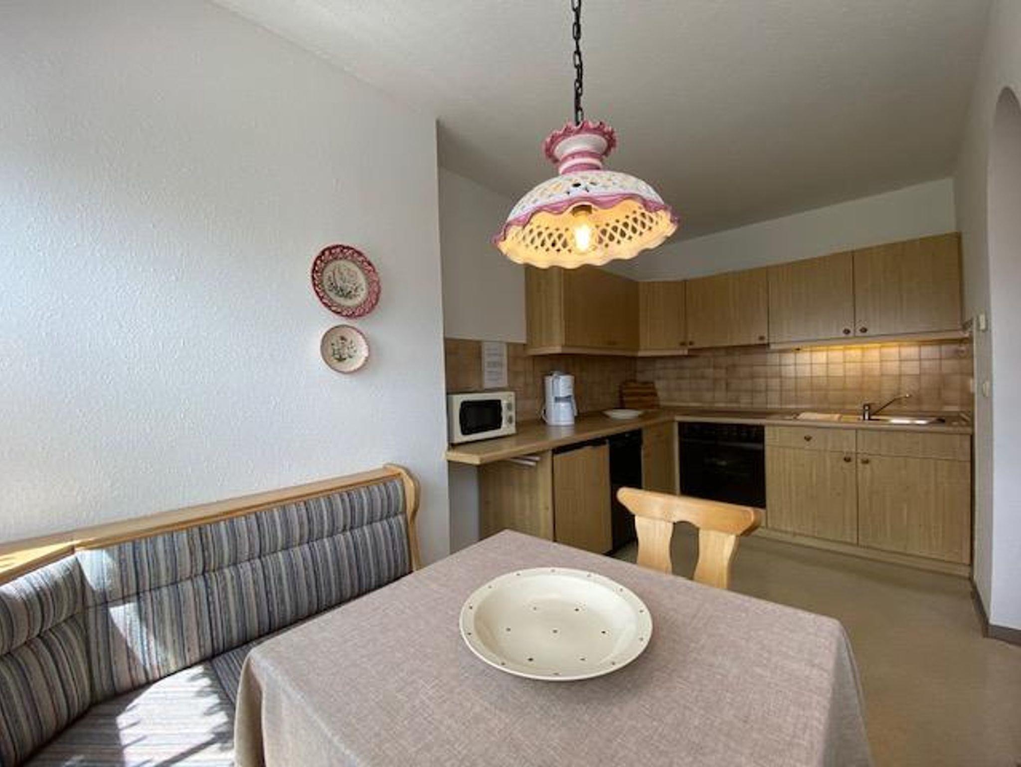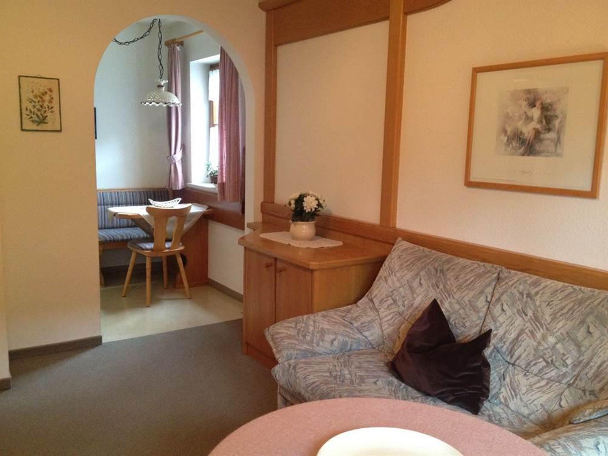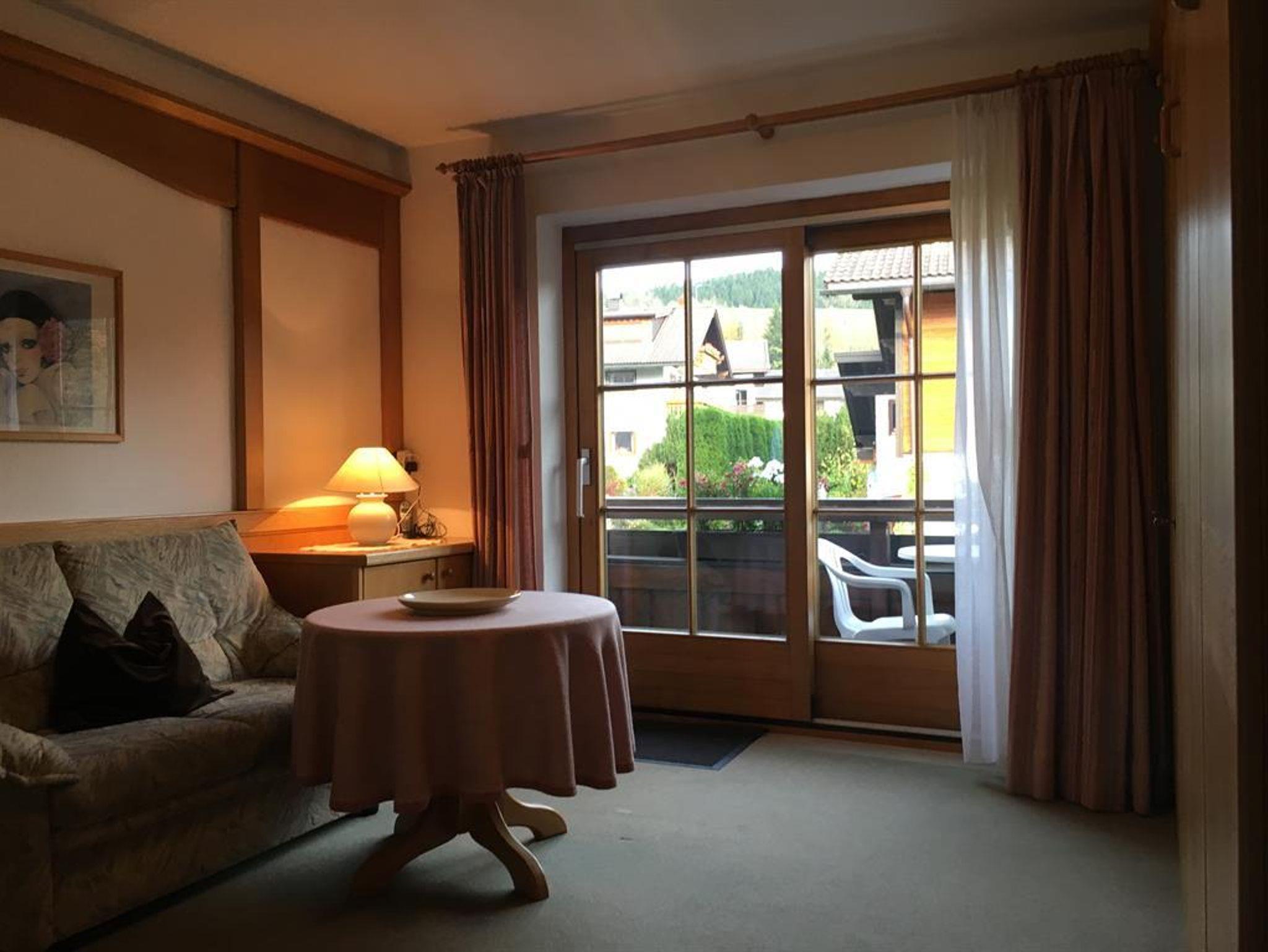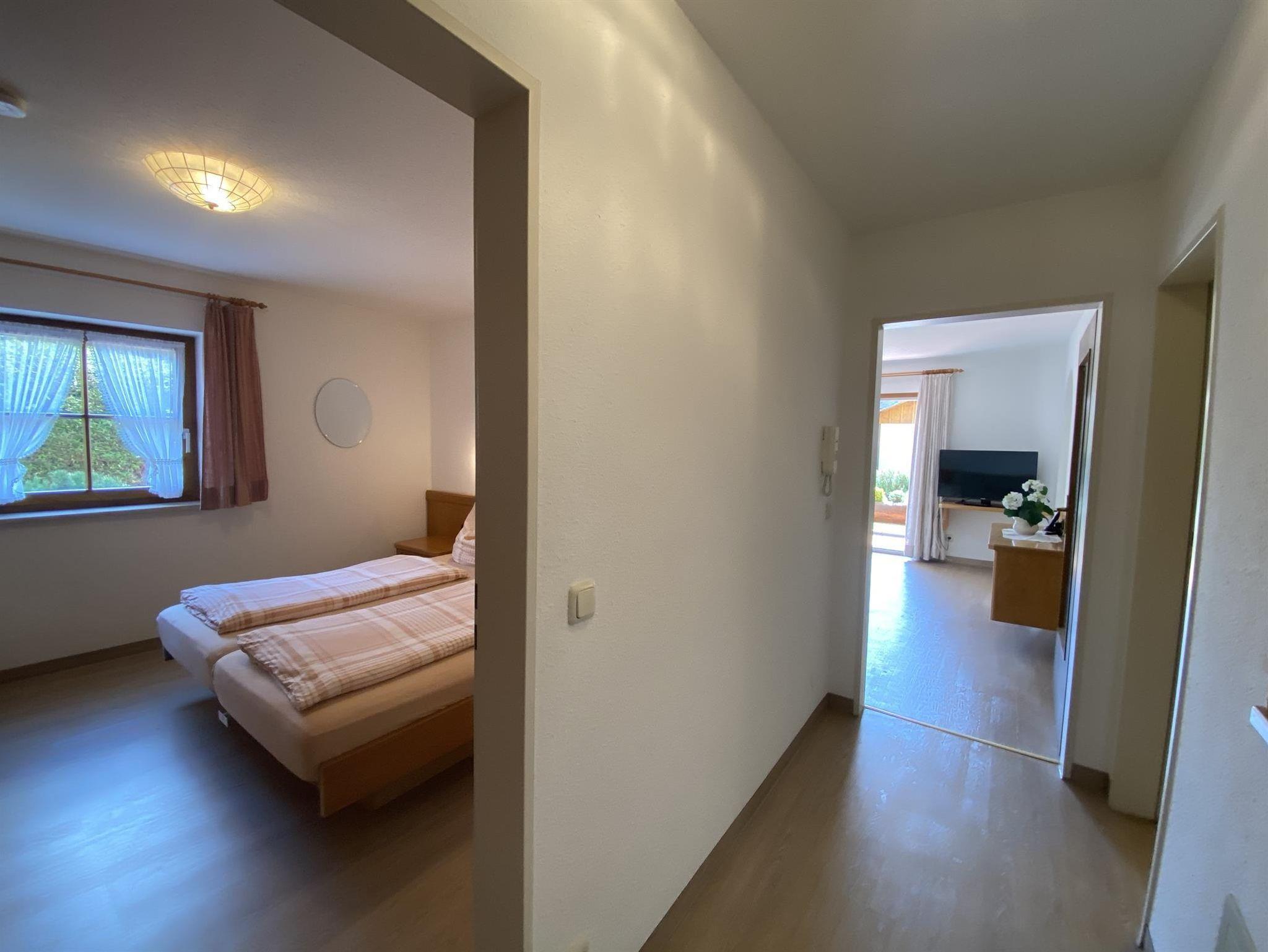 Die bequeme 2-Zimmer-Wohnung ist im EG mit schöner Bergsicht und einladender Südterrasse, davor der Rasengarten. Das helle Wohnzimmer hat breiter Schiebetüre zur Terrasse, die Polstermöbel sind eingeteilt in 2er Sofa, 3er Sofa (Doppel-Ausziehschlafcoutch), Tisch, Kleiderschrank, Bettschrank, Kabel-Flach-TV, daneben ist die Wohnküche mit vorgebautem Erkeressbereich und Einbauküche (Spülmaschine), das Schlafzimmer hat Doppelbetten, Schrank und Schminktisch, im weiss gefliesten Bad ist Wanne, Dusche, WC und Waschbecken, Flur mit Garderobe. In der Wohnung ist Fußbodenheizung.