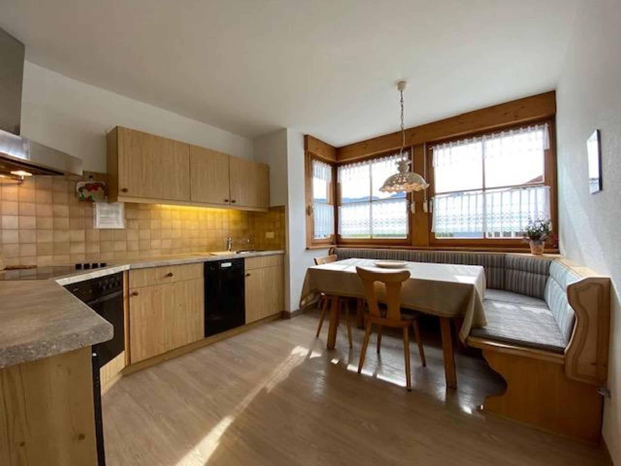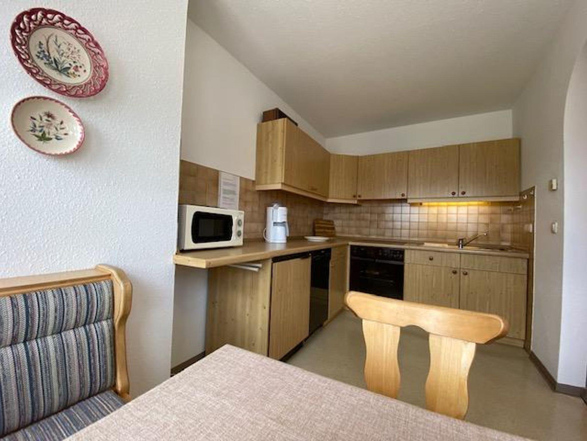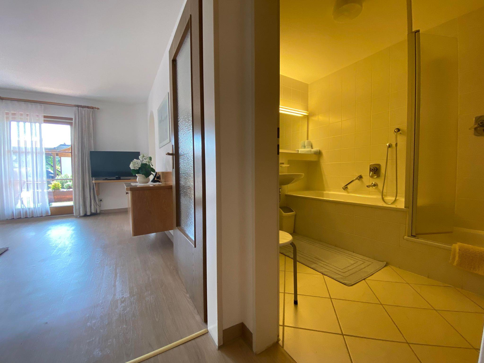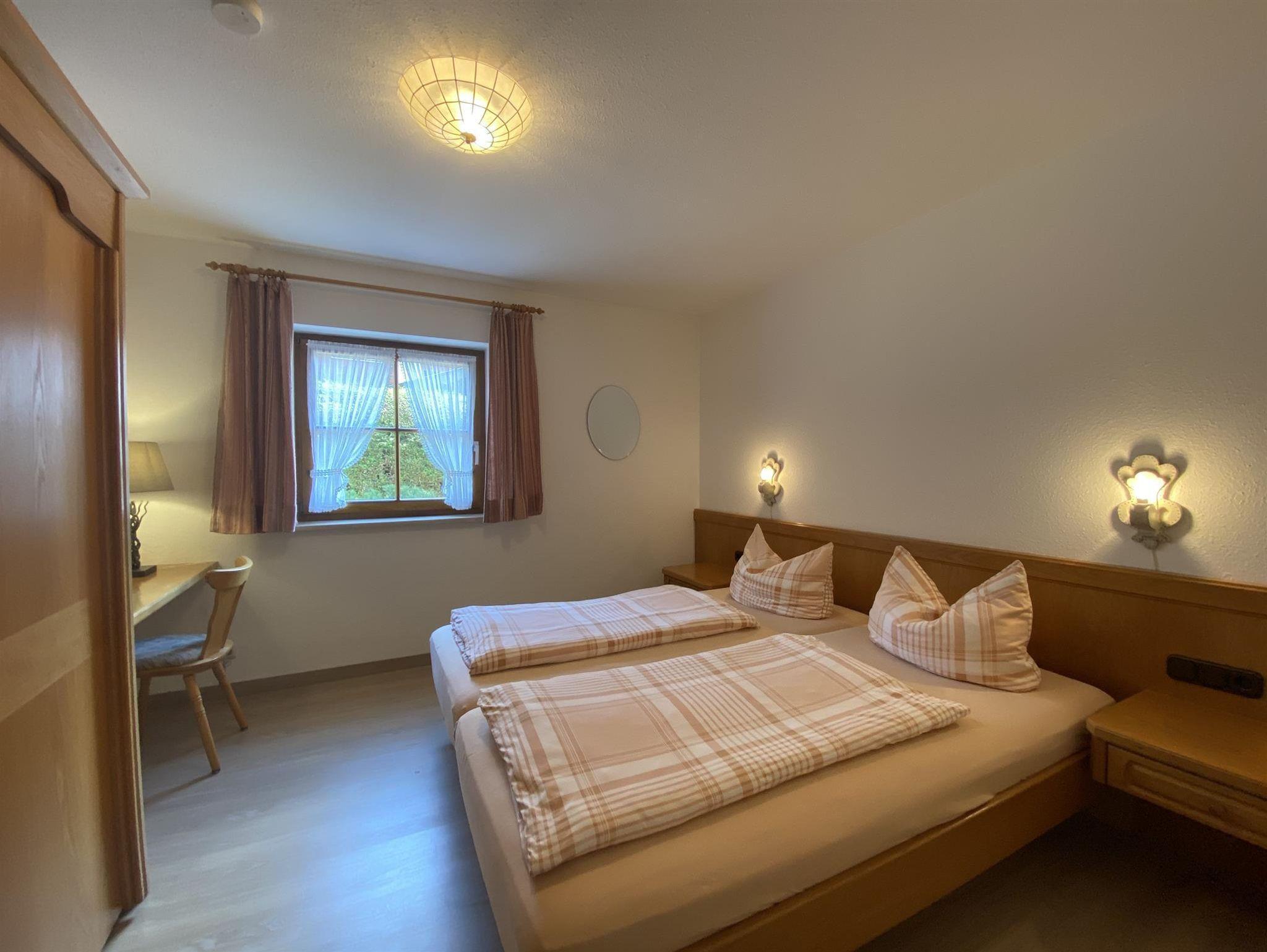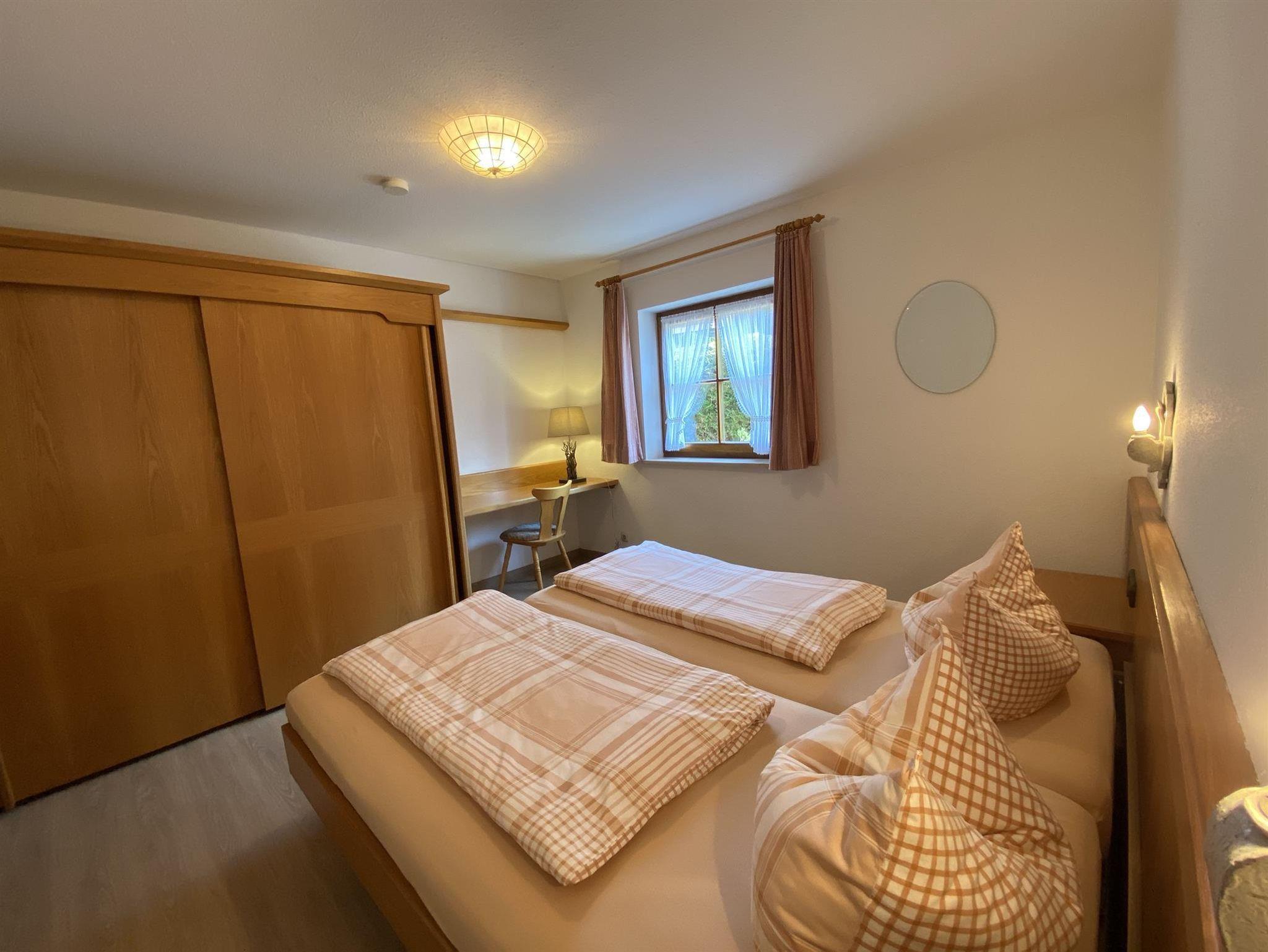 Die bequeme 2-Zimmer-Wohnung ist im EG mit schöner Bergsicht und einladender Südterrasse, davor der Rasengarten. Das helle Wohnzimmer hat breiter Schiebetüre zur Terrasse, die Polstermöbel sind eingeteilt in 2er Sofa, 3er Sofa (Doppel-Ausziehschlafcoutch), Tisch, Kleiderschrank, Bettschrank, Kabel-Flach-TV, daneben ist die Wohnküche mit vorgebautem Erkeressbereich und Einbauküche (Spülmaschine), das Schlafzimmer hat Doppelbetten, Schrank und Schminktisch, im weiss gefliesten Bad ist Wanne, Dusche, WC und Waschbecken, Flur mit Garderobe. In der Wohnung ist Fußbodenheizung.