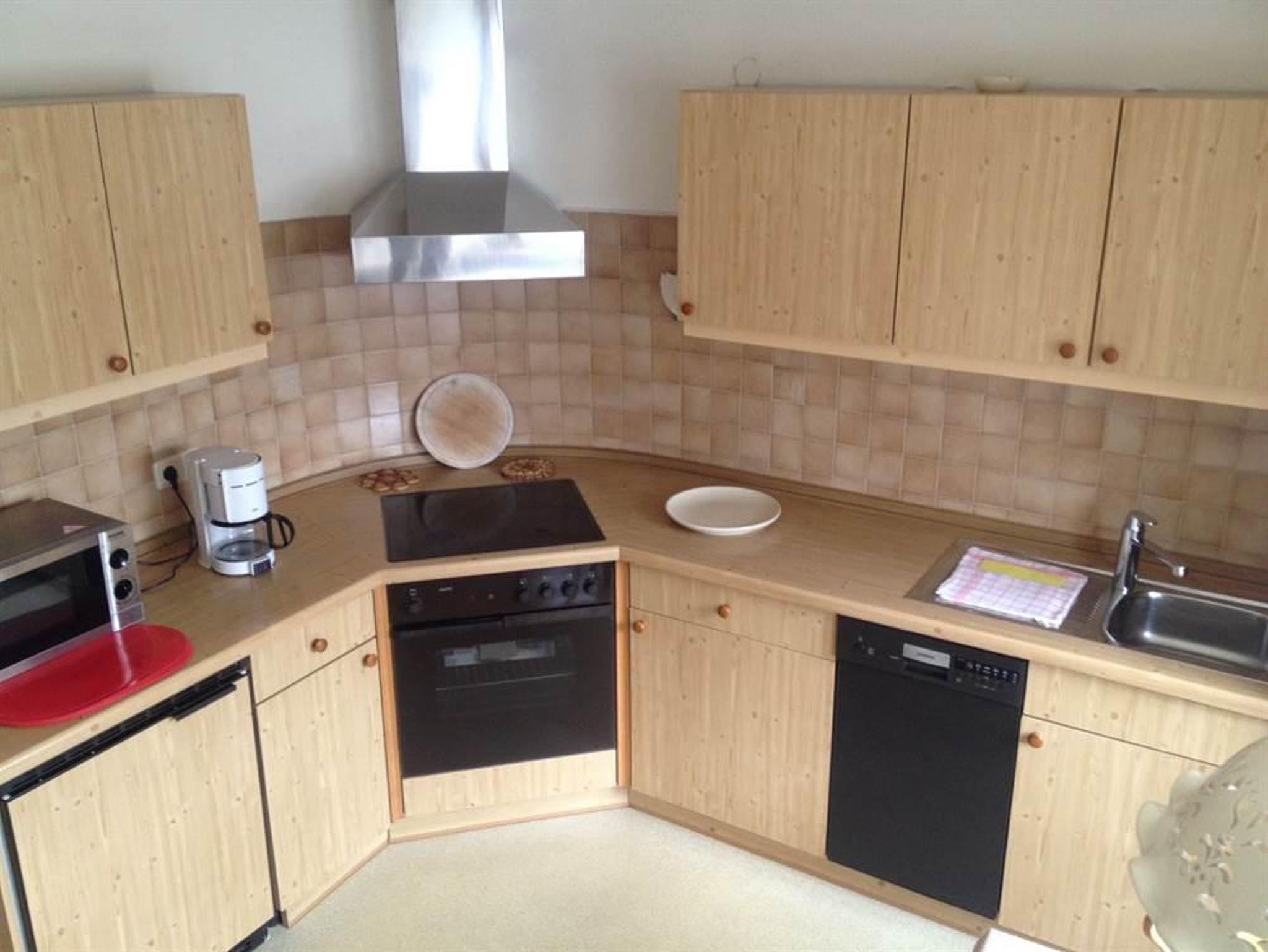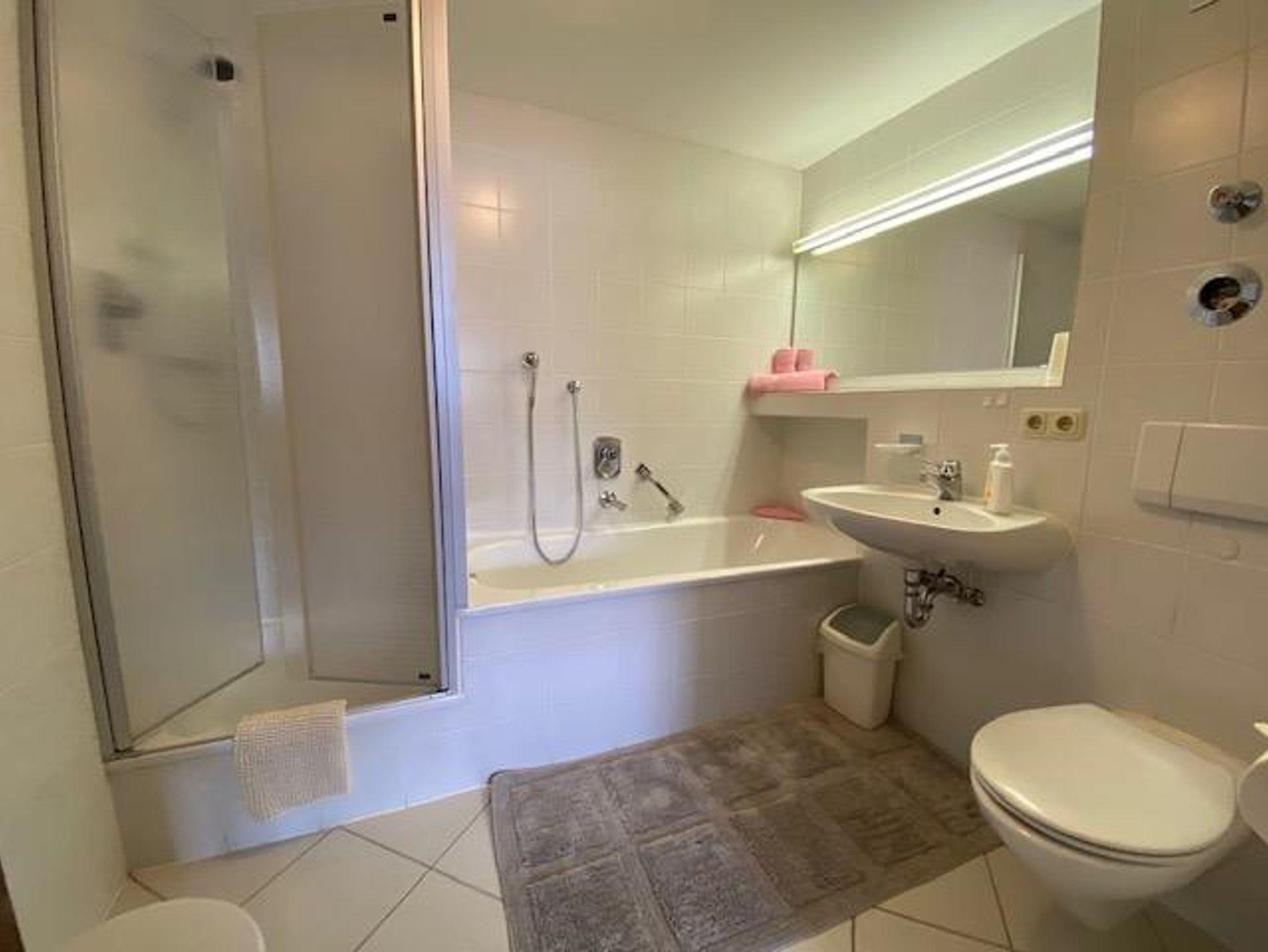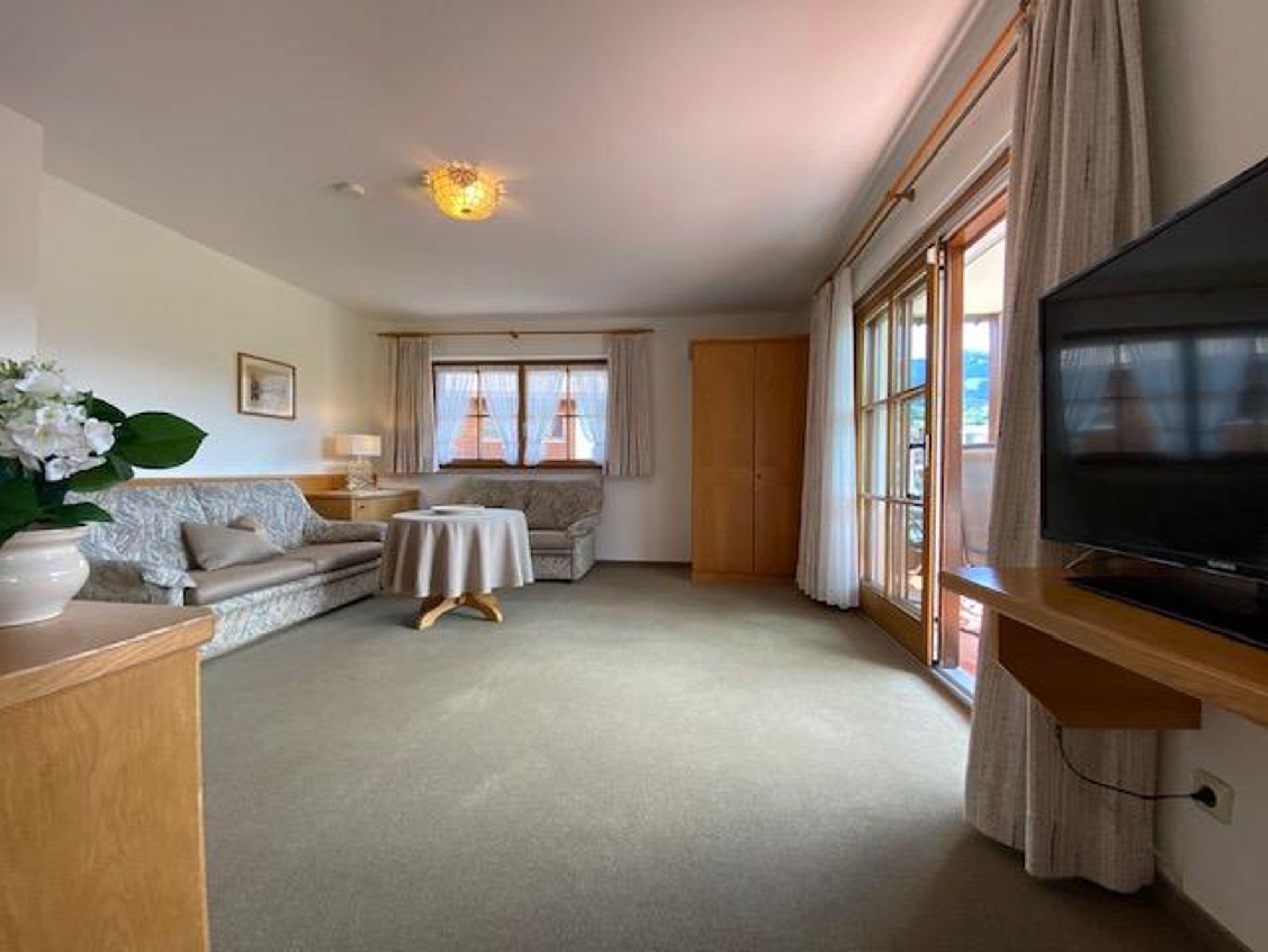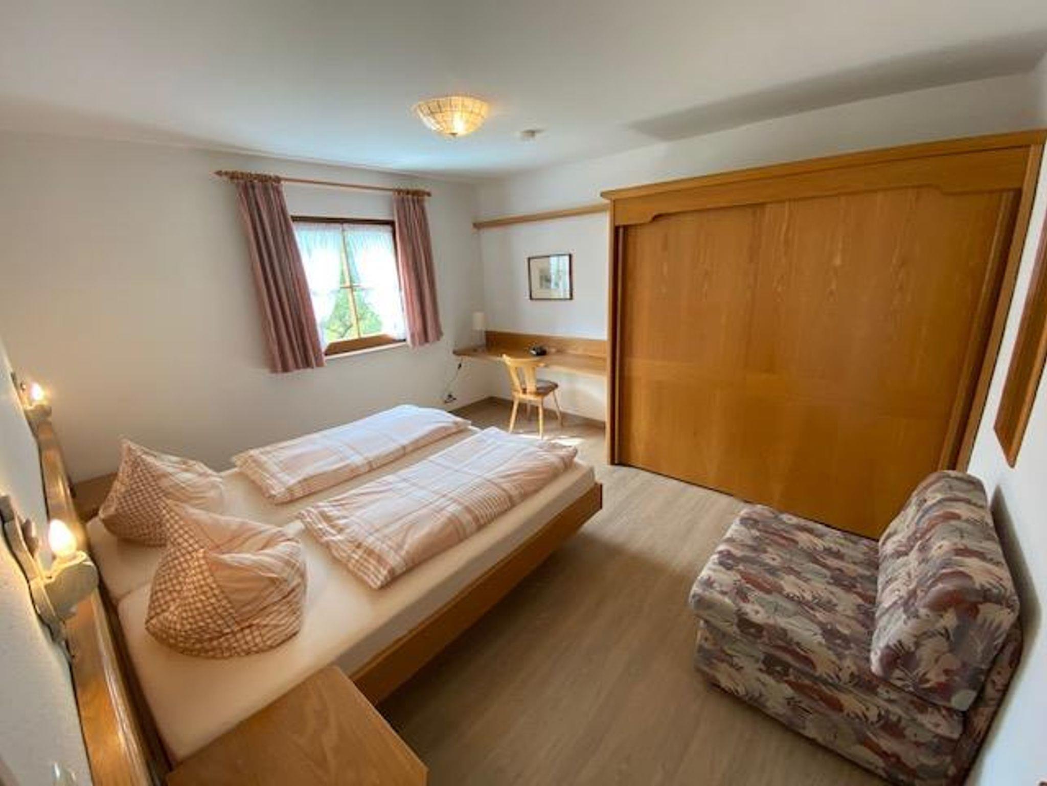 Die bequeme 2-Zimmer-Wohnung ist im EG mit schöner Bergsicht und einladender Südterrasse, davor der Rasengarten. Das helle Wohnzimmer hat breiter Schiebetüre zur Terrasse, die Polstermöbel sind eingeteilt in 2er Sofa, 3er Sofa (Doppel-Ausziehschlafcoutch), Tisch, Kleiderschrank, Bettschrank, Kabel-Flach-TV, daneben ist die Wohnküche mit vorgebautem Erkeressbereich und Einbauküche (Spülmaschine), das Schlafzimmer hat Doppelbetten, Schrank und Schminktisch, im weiss gefliesten Bad ist Wanne, Dusche, WC und Waschbecken, Flur mit Garderobe. In der Wohnung ist Fußbodenheizung.