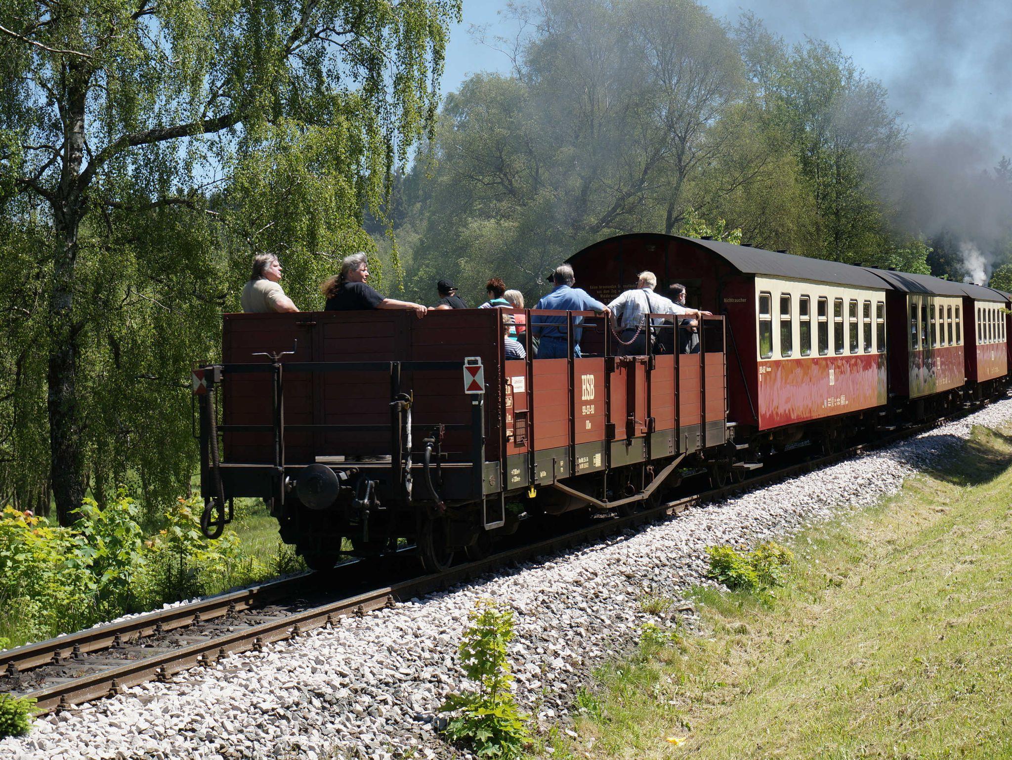 Zum Haus gehört eine 55 m² große Terrasse mit Sonnenschirm, sechs bequemen Hochlehnstühlen, Gartentisch, einer Doppel- und einer Einzelliege. An der Vorderseite des Hauses steht außerdem noch eine Sitzbank zur Verfügung. Von dort aus haben Sie einen besonders schönen Blick auf das Tal und die Dampfeisenbahn, die mit historischen Lokomotiven bespannt in nur zirka 30 Metern Entfernung vorbeifährt.