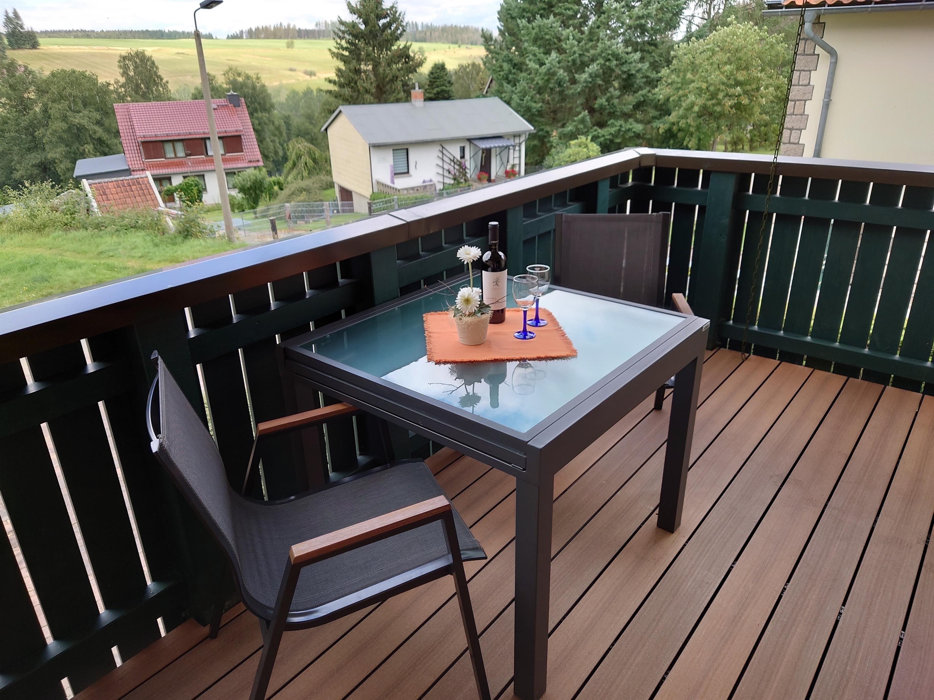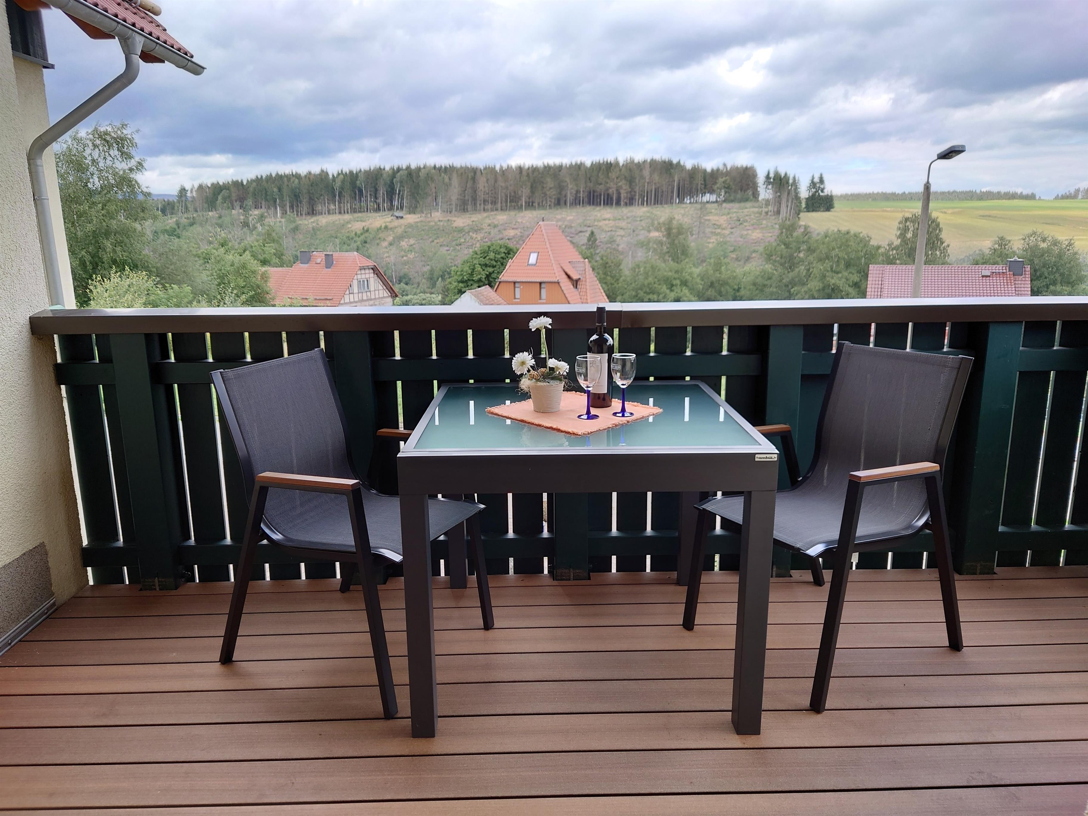 Der Balkon zeigt nach Norden mit tollem Blick auf das Tal. Sitzmöbel sind vorhanden.