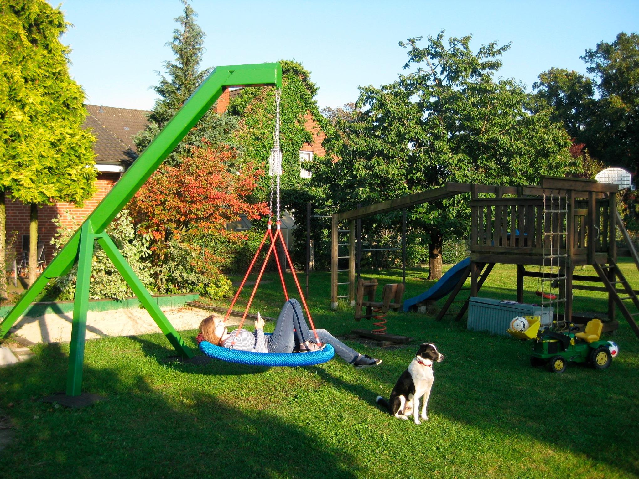 Ein großes Hofgelände mit Spielplatz, Trampolin, Nestschaukel und vielen Spielgeräten zum Austoben für die Kinder, oder ruhige Sitzecken zum Entspannen warten auf Sie.