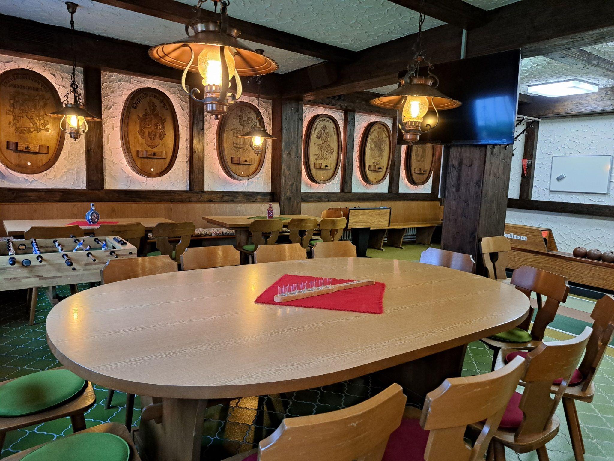 An die Küche anschließend befindet sich ein großer Gemeinschaftsraum. Zusätzlich bieten wir eine Kegelbahn, eine Tischtennisplatte, einen Tischkicker, einen großen Fernseher, eine Dartscheibe, sowie diverse Familienspiele.