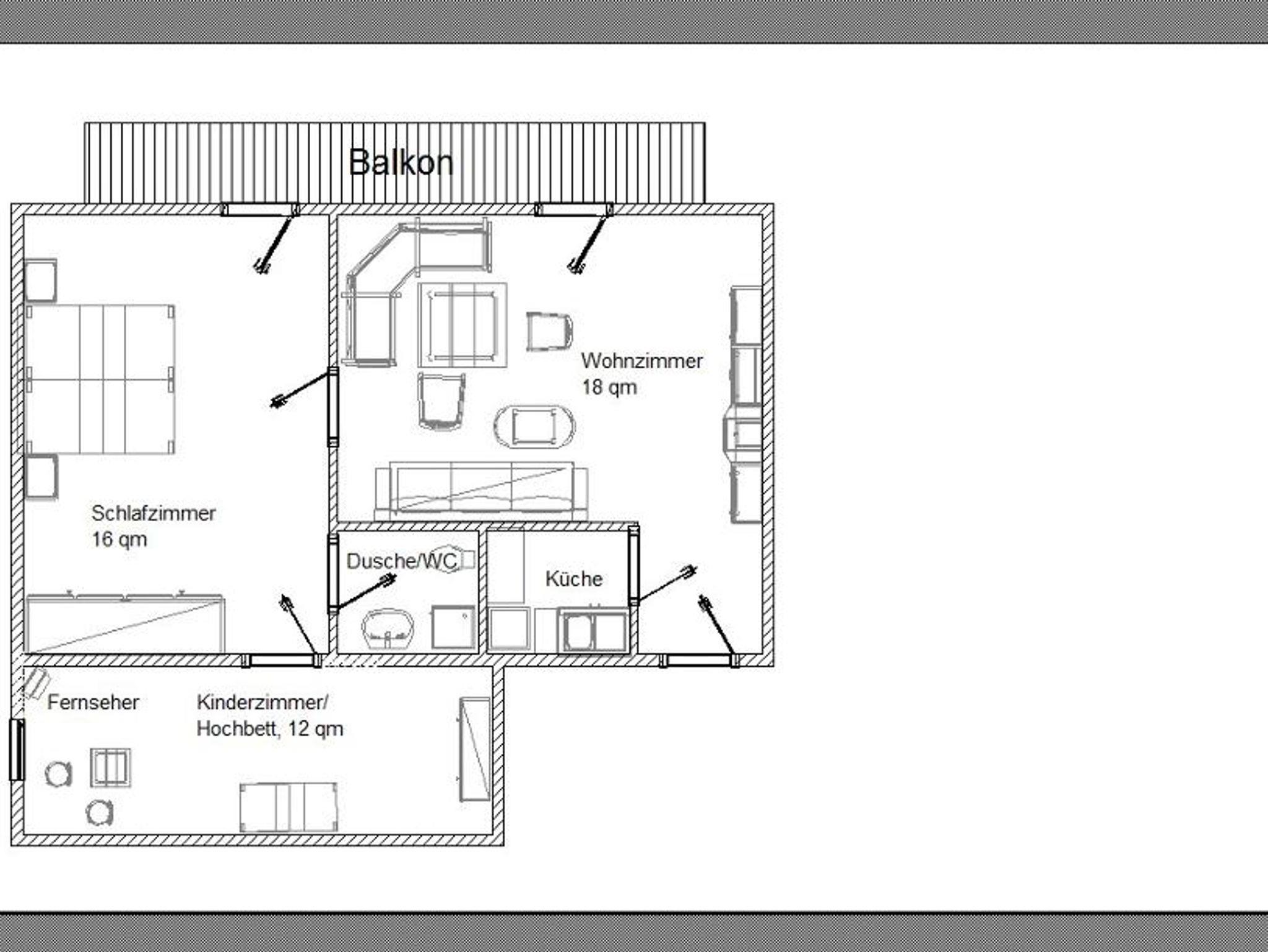 Sie umfasst eine kleine, komplett ausgestattete Küche, Wohnzimmer mit Essecke und Sat/TV, Schlafzimmer sowie Kinderzimmer mit Etagenbett und Sat/TV. Dusche/WC mit Fön und Kosmetikspiegel.