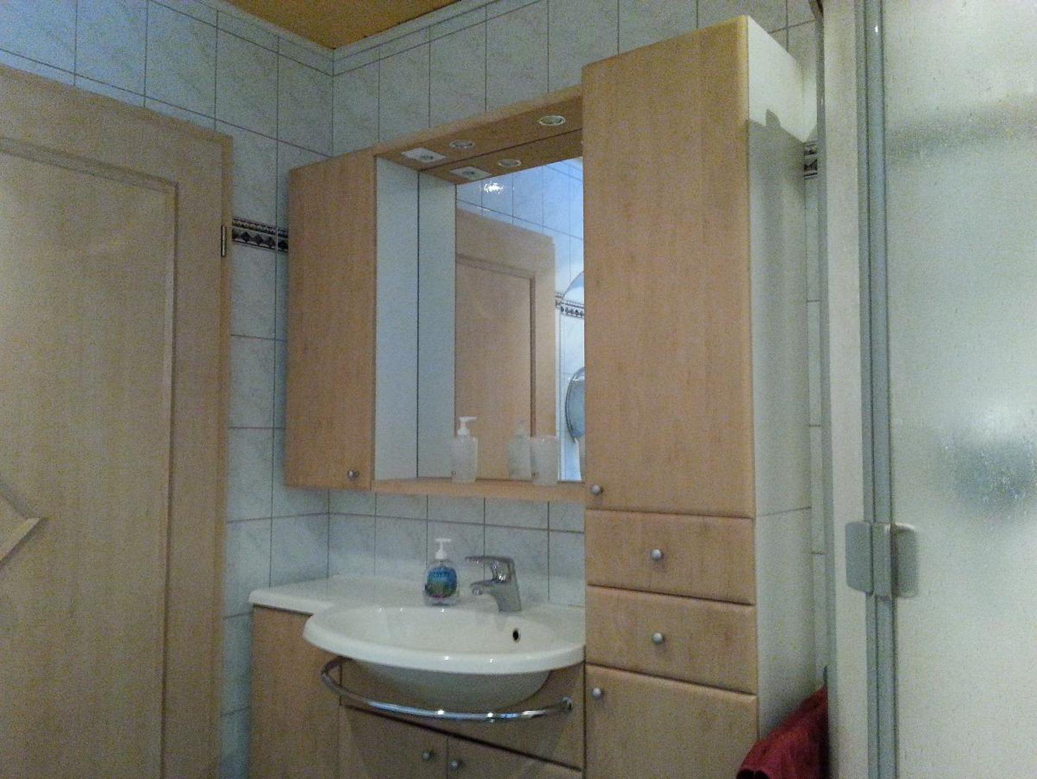 mit einem Doppelbett und Kleiderschrank. Ein weiteres Schlafzimmer mit großer Schrankwand und massivem Etagenbett kann als Kinderzimmer genutzt werden. Das moderne Bad mit Waschbecken,
