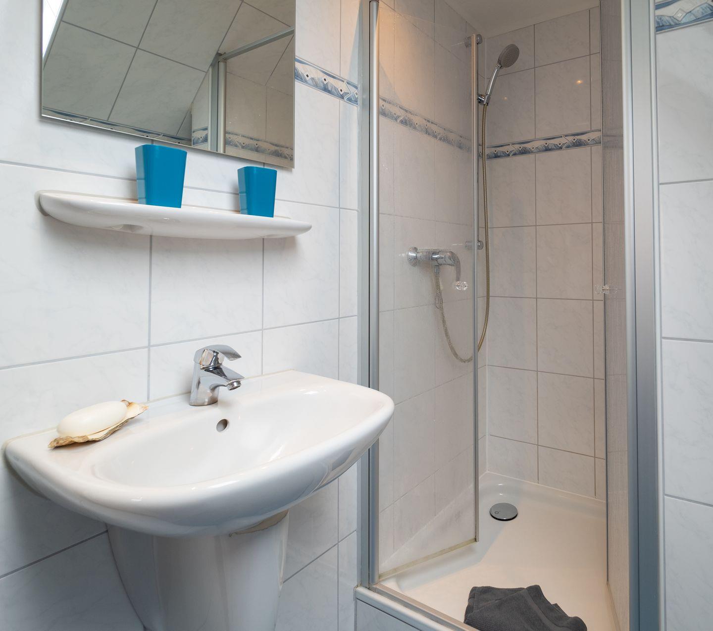 Das Badezimmer ist modern ausgestattet und verfügt über eine Dusche, WC und Waschbecken.