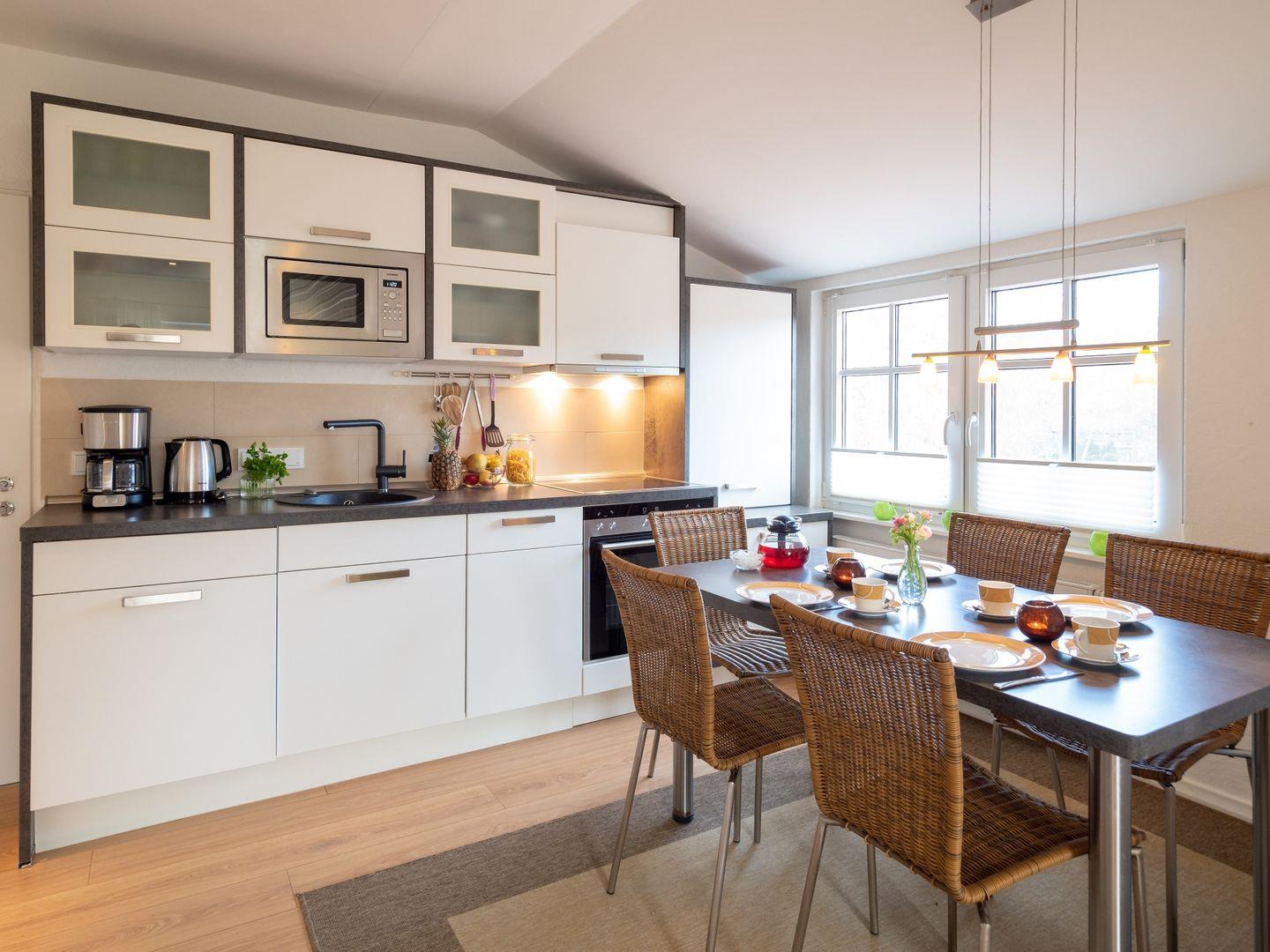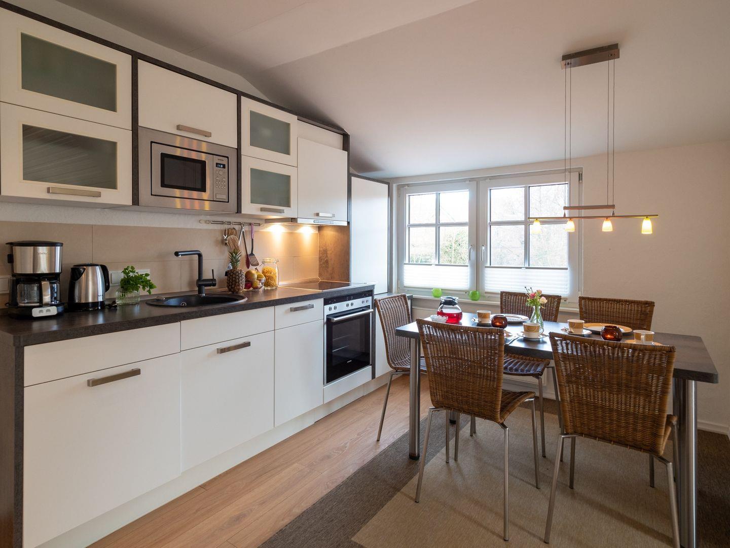 Die Wohnung im Obergeschoss bietet Platz für 2-3 Personen auf großzügigen 35qm. Ausgestattet mit einem Flachbild-TV, Stereoanlage, WLAN und einer Küche inklusive Mikrowelle, Backofen und Geschirrspüler, lässt es sich hier wunderbar entspannen.