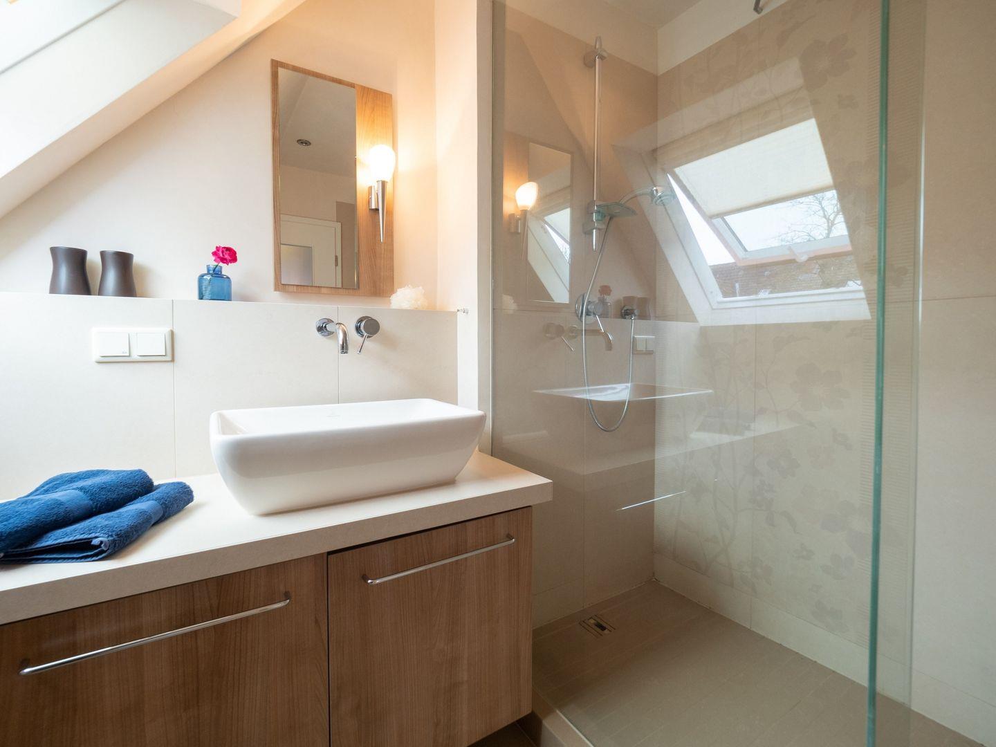 Für zusätzlichen Komfort sorgt die Fußbodenheizung im Bad, ein Fön sowie eine Waschmaschine und ein Trockner auf der Etage. Ein allgemeiner Freisitz im Garten lädt zum Verweilen ein, und ein (Gemeinschafts-) Bollerwagen steht für Ausflüge bereit.