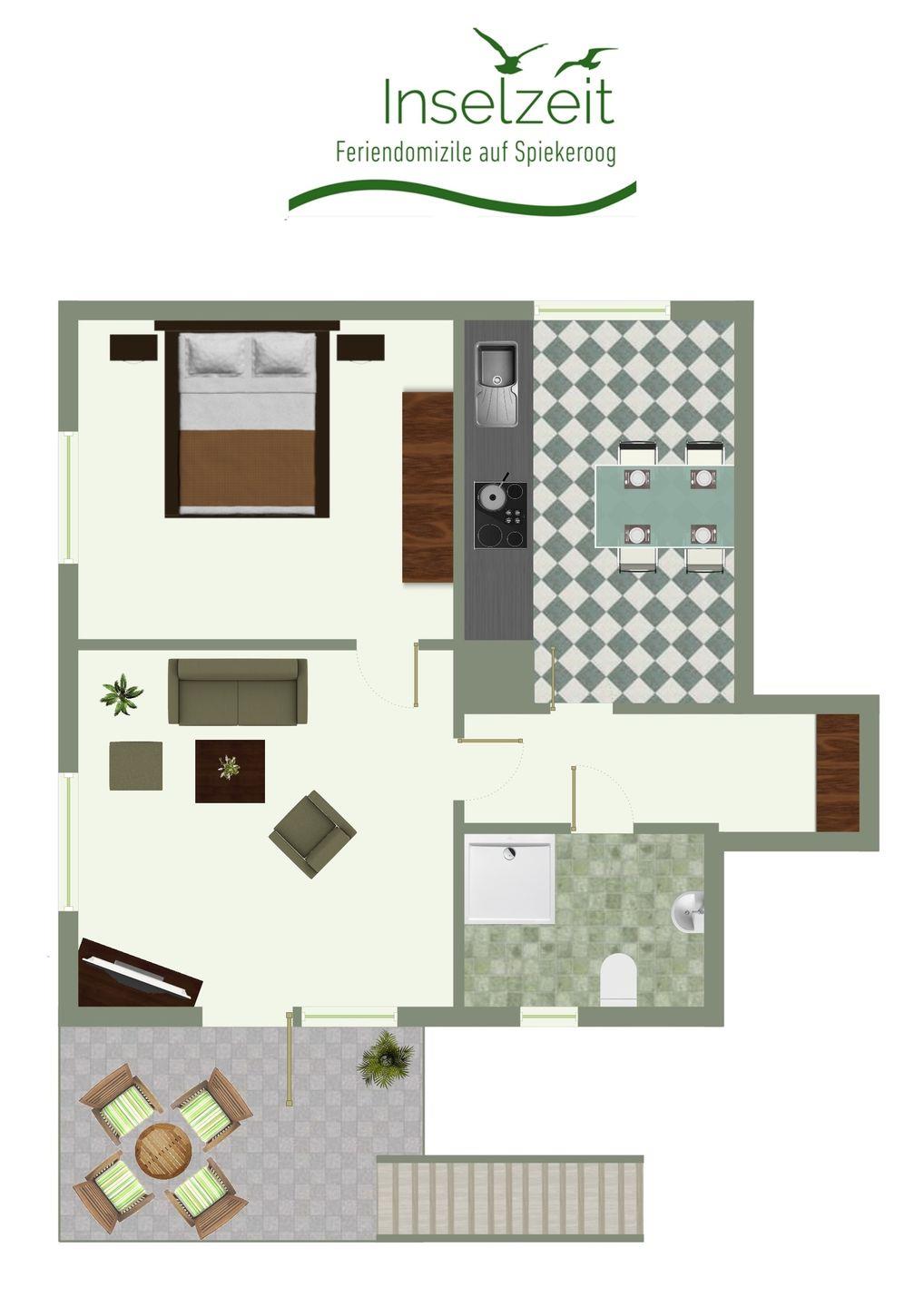 Die Wohnung bietet Platz für drei Personen (+ ein Kleinkind) und Hund. Schlafzimmer, Bad mit Dusche/WC, Wohnzimmer und Küche mit Sitzmöglichkeit. Der Balkon ist überdacht. Die Wohnung liegt im alten Inseldorf.