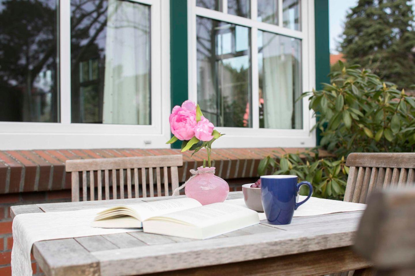 Mit liebevoll ausgewählten Wohnaccessoires schafft die Wohnung eine freundliche und schöne Atmosphäre. Zur Wohnung gehört zudem eine helle, sonnige Terrasse mit Sitzecke und Strandkorb, ideal für entspannte Stunden im Freien.
