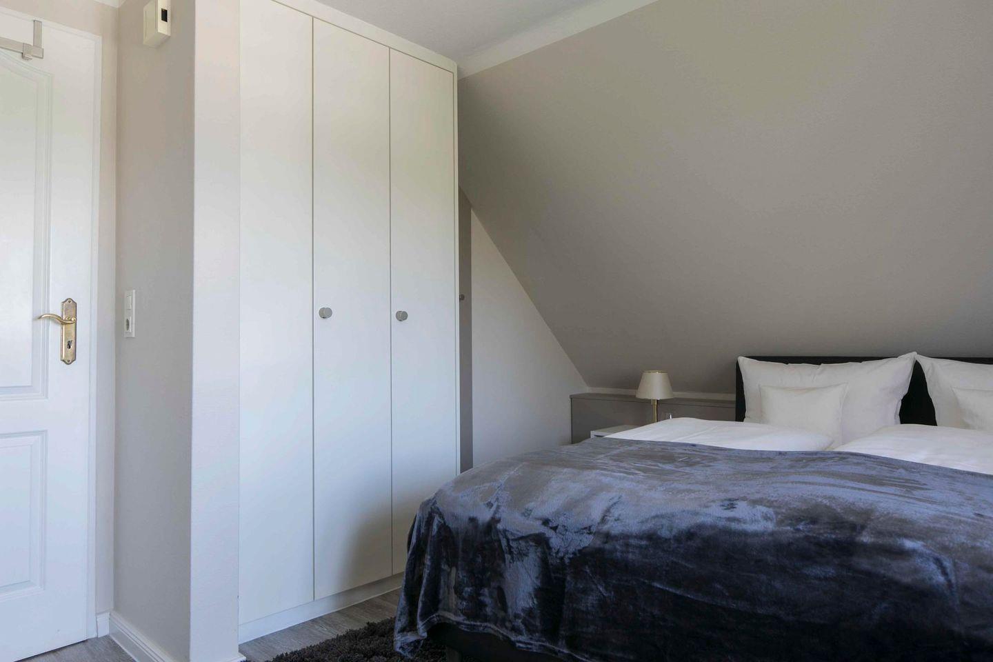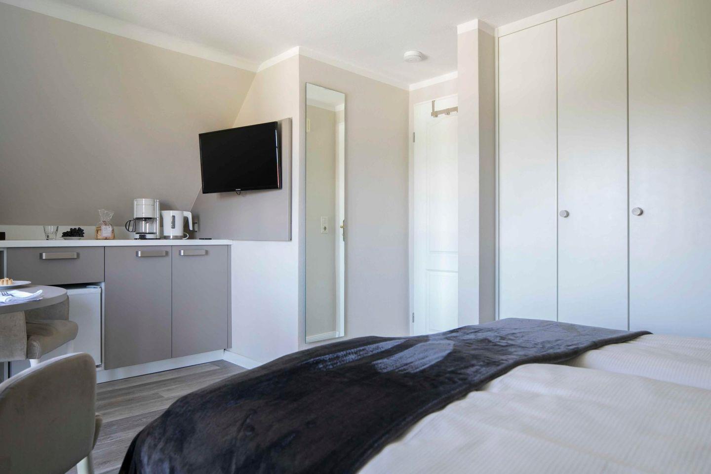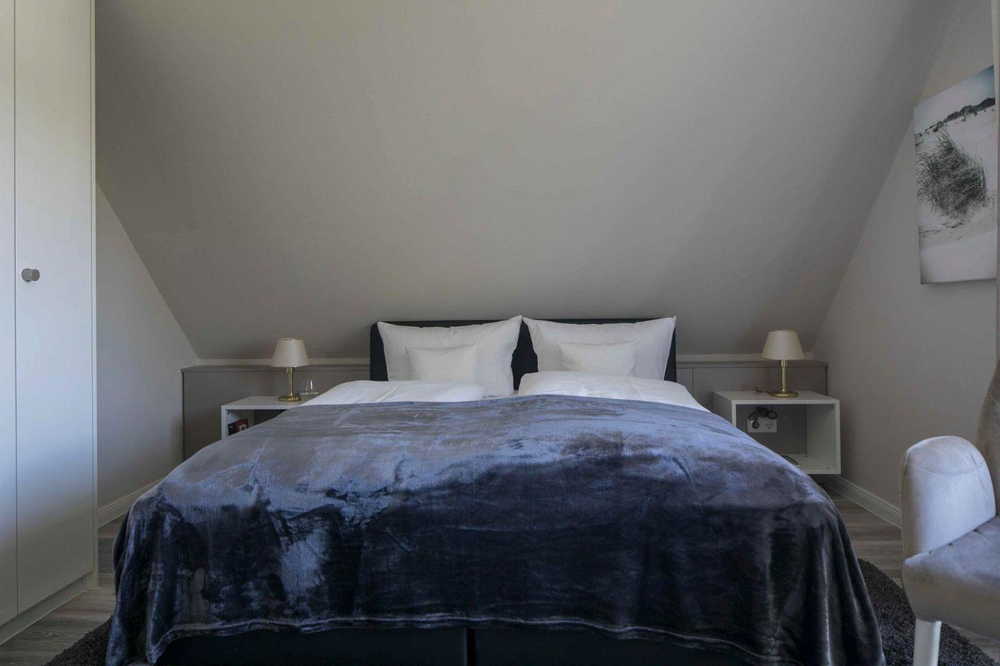 Das Dachgeschosszimmer unseres Gästehauses wurde kürzlich umfassend renoviert. Es bietet ein neues Badezimmer mit Wanne und Dusche. Mit frischen Farben, einem wischbaren Bodenbelag, neuer Einrichtung und einem französischen Balkon modernisiert. Ausgestattet mit einem Boxspring-Doppelbett, Flachbild-TV, Radio/CD-Player, WLAN, Kühlschrank und Teekocher, bietet es eine elegante Urlaubsatmosphäre.
