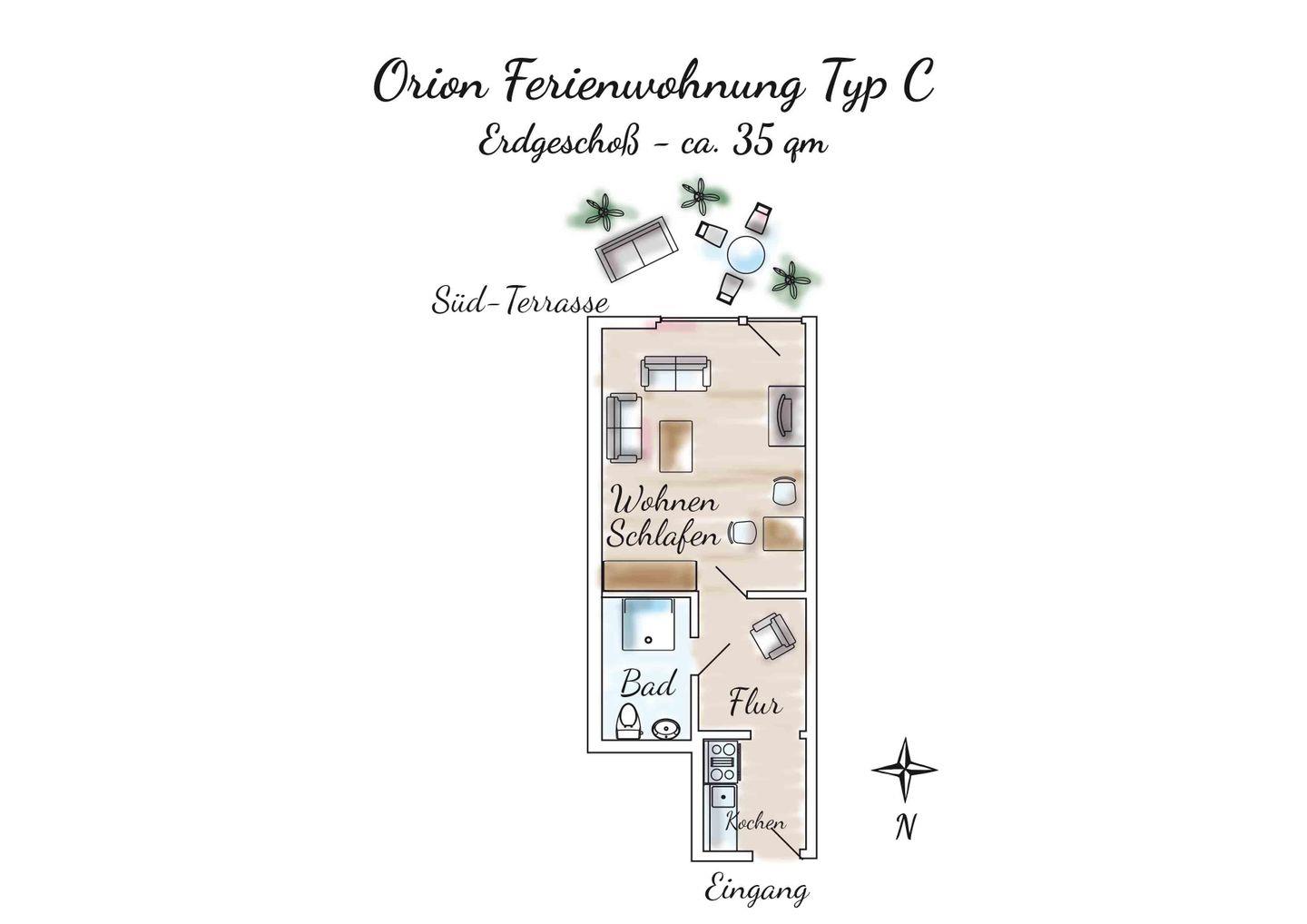 Auf etwa 35 m² bietet die Wohnung einen großzügigen Wohn- und Schlafbereich. Die hochwertige Sofaliege kann abends ohne Umbauen in ein bequemes Bett verwandelt werden. Ein Flur führt zur neuen Küchenzeile und zum Badezimmer mit flacher Dusche. Zusätzlich gibt es eine Südterrasse mit schönem Gartenblick.