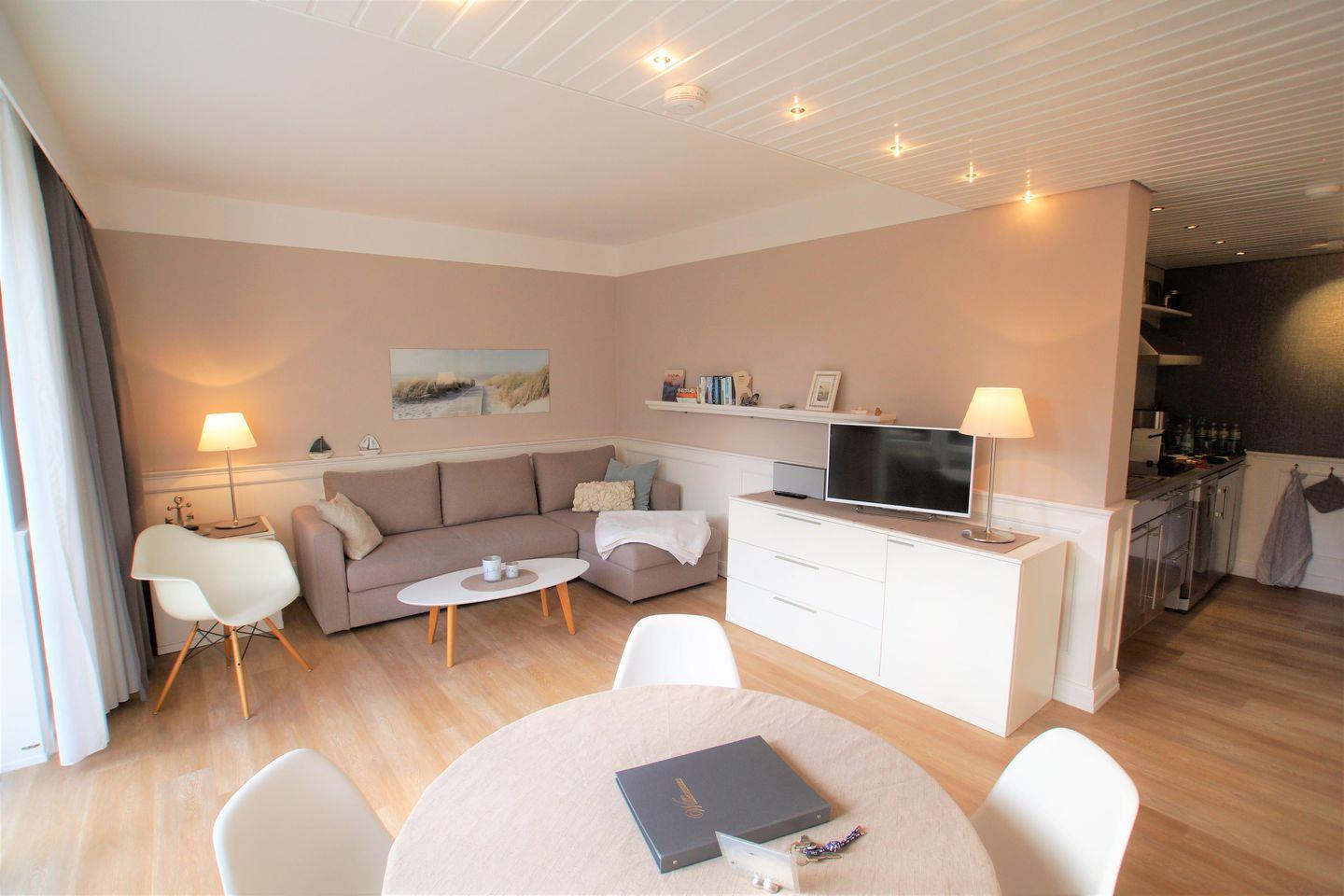 Wohnraum mit Schlafsofa (Liegefläche 135 x 225 cm), Kabel-TV, DAB-Radio mit CD-Spieler, USB und Bluetooth, kostenloser W-LAN-Zugang.