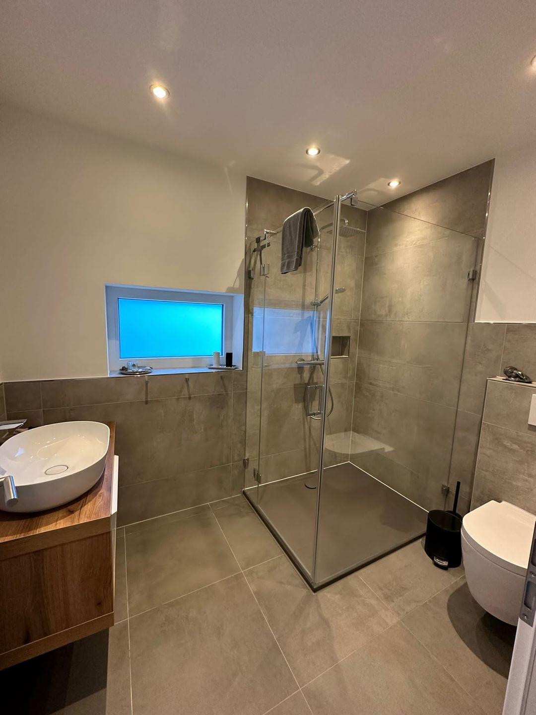 Terrassenerneuerung und Badsanierung Anfang 2023. Bad mit WC und großer Glasdusche, Fußbodenheizung und Föhn. Terrasse mit Strandkorb und Gartenmöbeln mit Sitzauflagen.