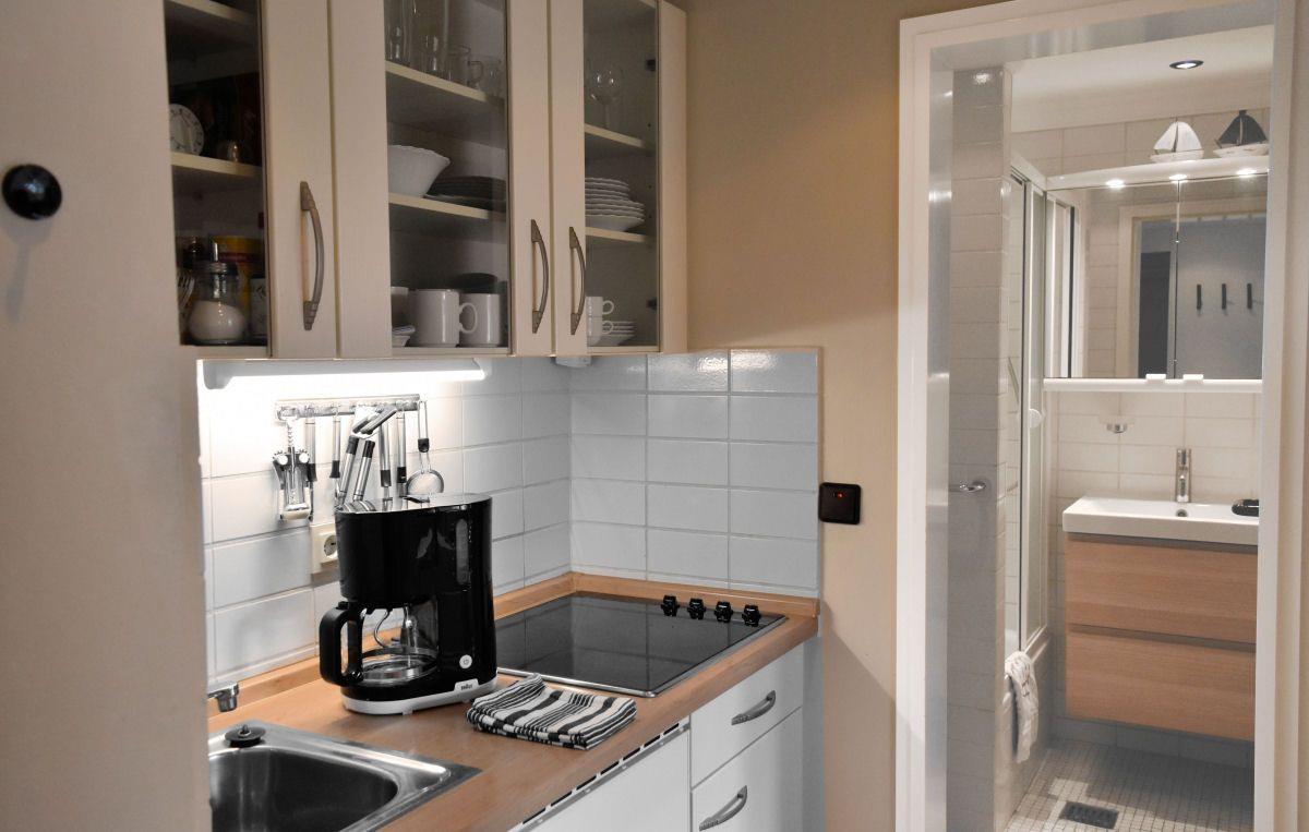 Schöne, kleine Ferienwohnung für 1-4 Personen im Erdgeschoss, ca. 32 m², mit eigener Terrasse und Garten, 1 Schlafzimmer (1 Doppelbett), 1 Wohnraum mit Schlafsofa, Kabel-LED-TV und HiFi-Anlage; hochwertig ausgestattete Einbauküchenzeile mit Ceranfeld, Kaffeemaschine, Wasserkocher und Toaster; Bad mit Dusche, Waschtisch und WC (Fön und Kosmetikspiegel vorhanden); Bettwäsche, Handtücher, Terrasse mit Teakholzmöbeln und Auflagen; separater Hauswirtschaftsraum mit Waschmaschine und Trockner. IR-Sauna gegen Münzen im hauseigenen Fitnessraum verfügbar.