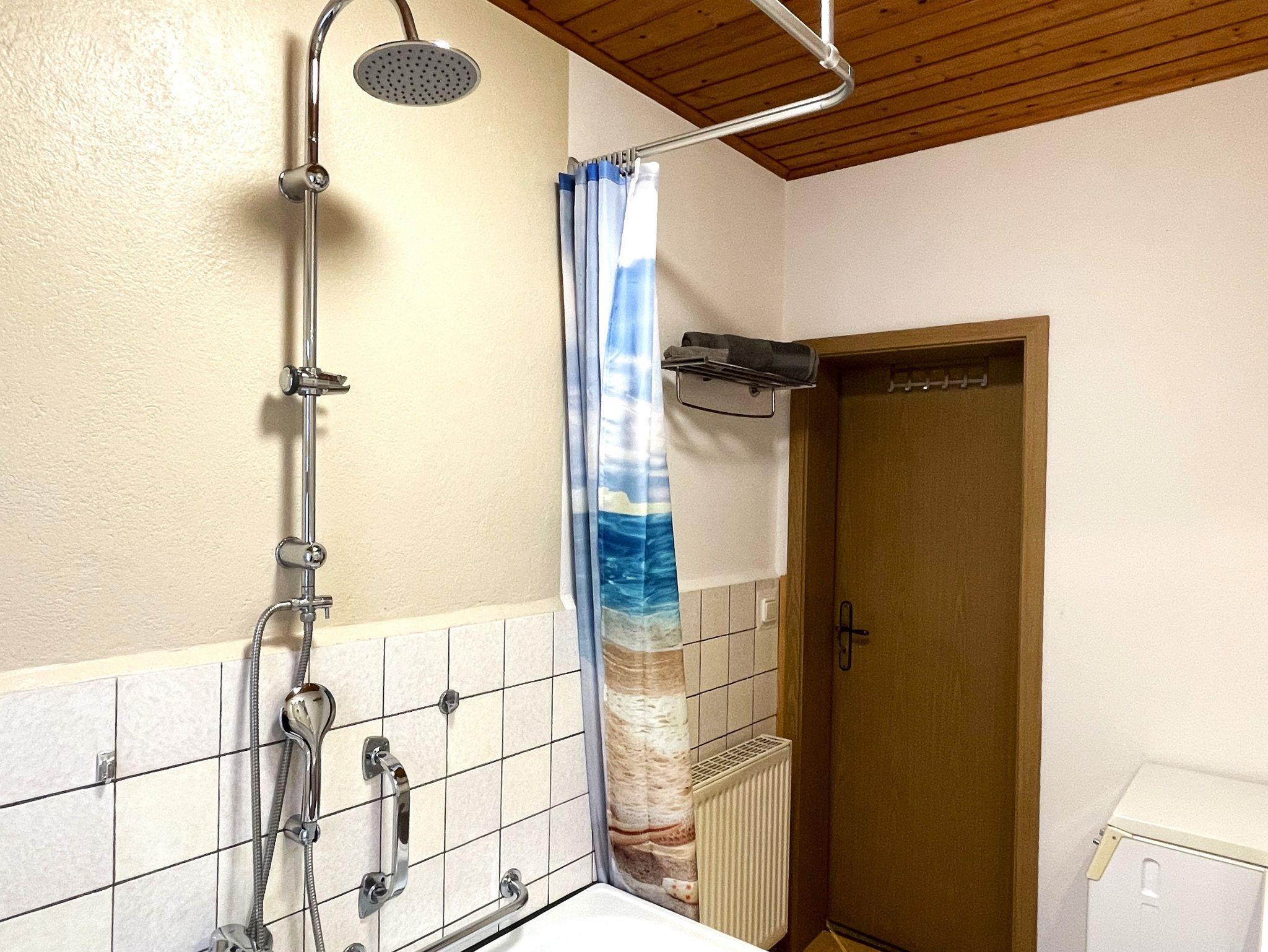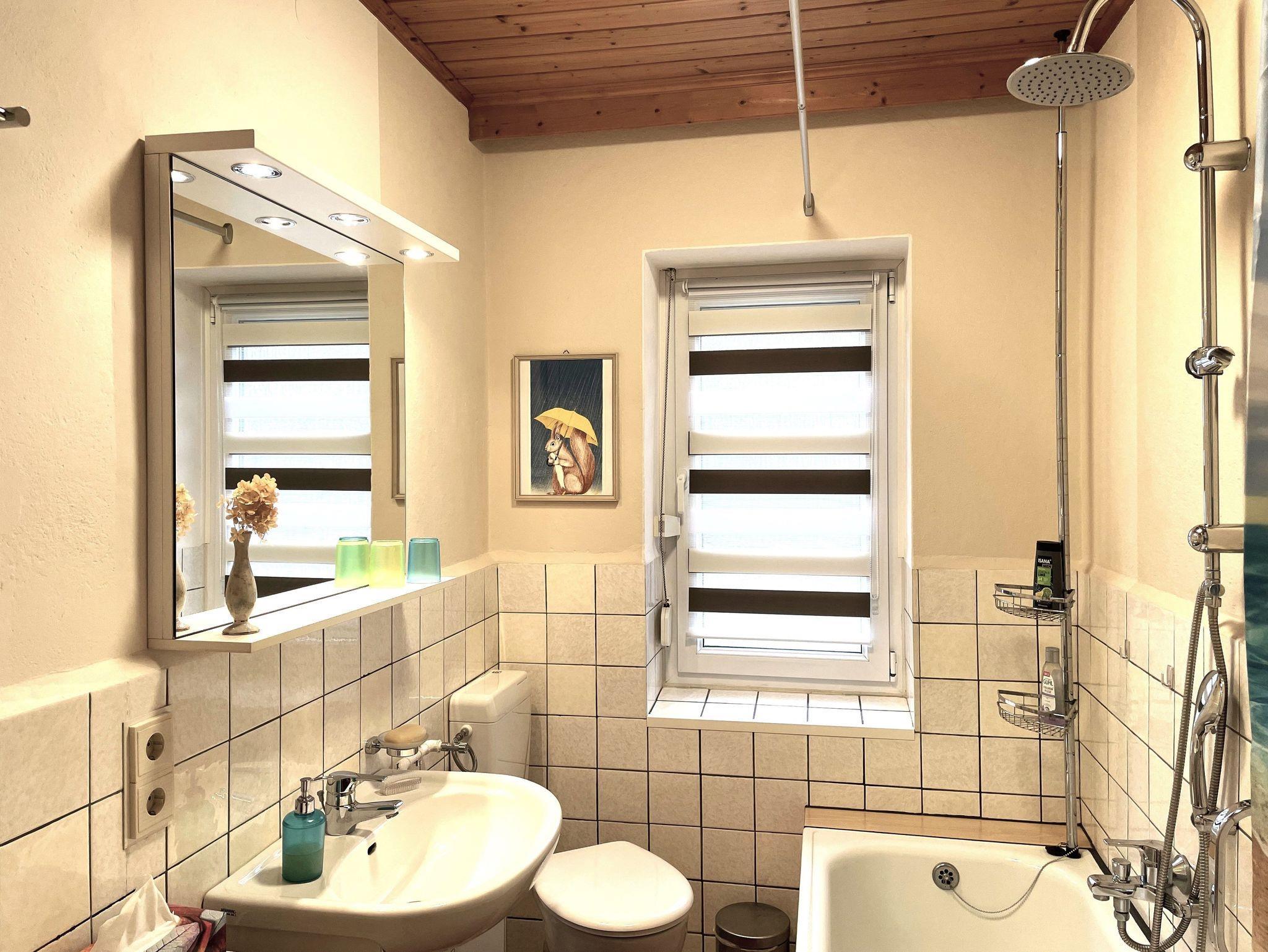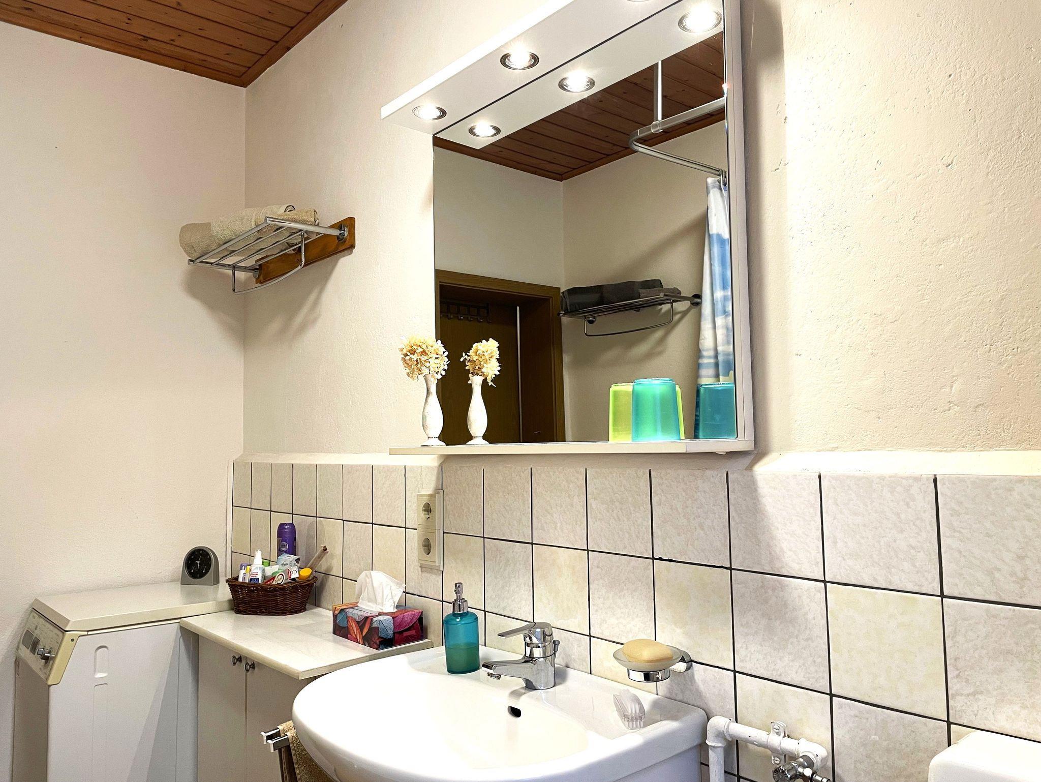 Das Badezimmer ist ausgestattet mit Waschbecken, Spiegelschrank, Badewanne, WC und Waschmaschine.