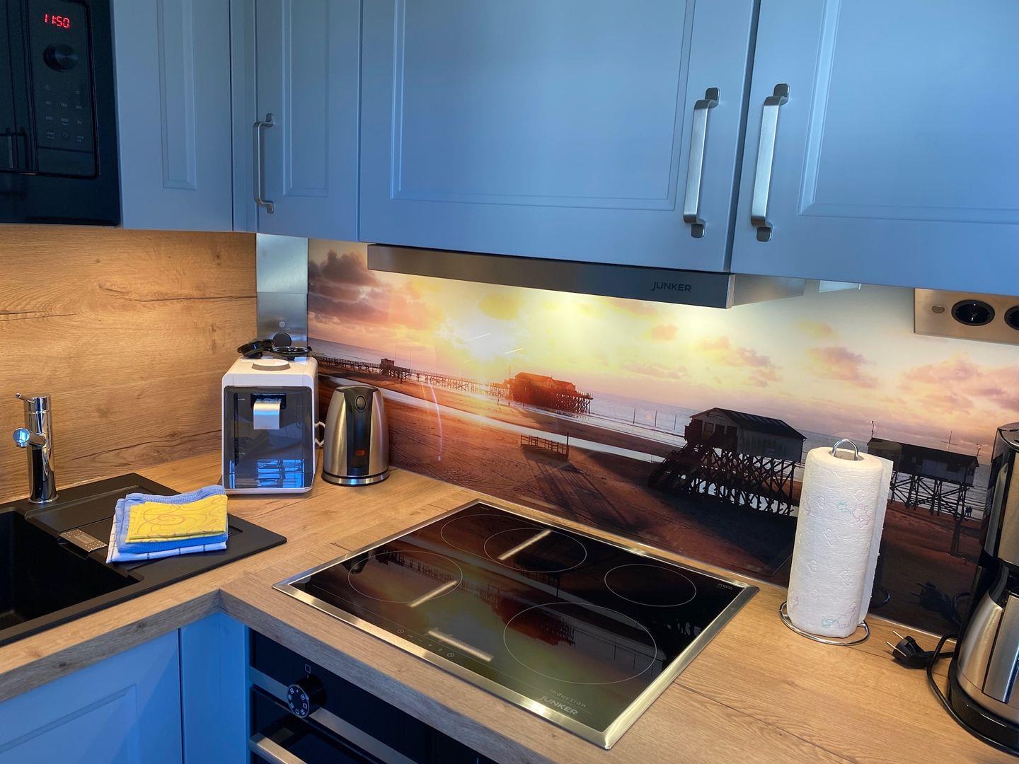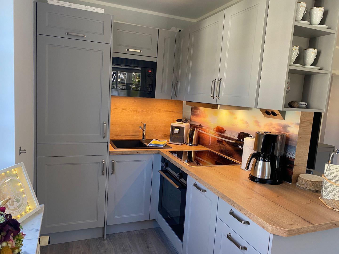 Die ins Wohnzimmer integrierte Küche ist mit Cerankochfeld, Backofen, Mikrowelle, Wasserkocher, Kaffeemaschine, Spülmaschine, Kühlschrank und Gefrierschrank ausgestattet. Selbstverständlich sind ausreichend Geschirr sowie die üblichen Utensilien einer Küche vorhanden. Der Esstisch bietet ausreichend Platz für bis zu 4 Personen. Als Highlight steht Ihnen hier auch noch eine Waschmaschine zur kostenlosen Nutzung zur Verfügung.
