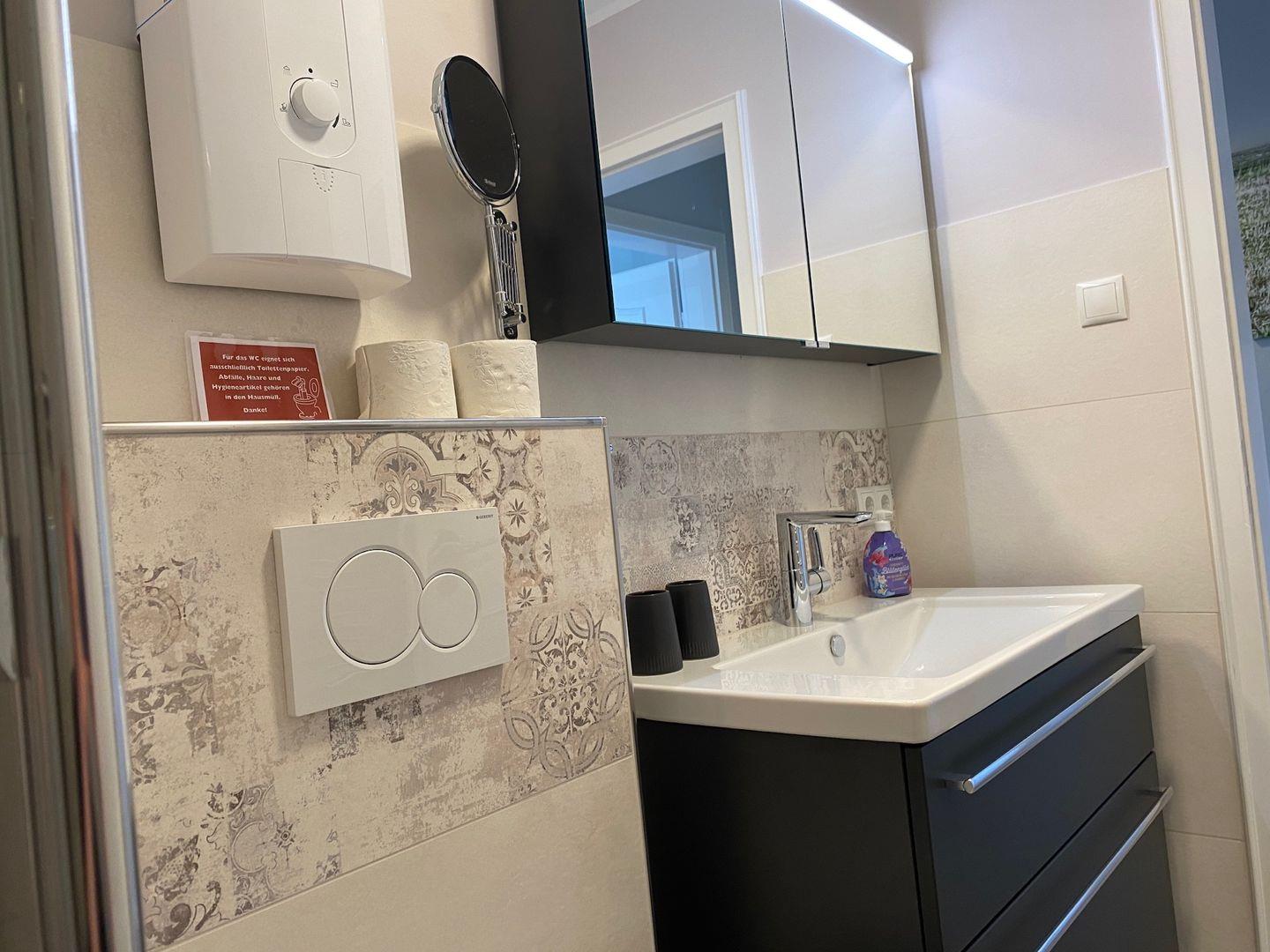 Das innenliegende Duschbad mit WC ist groß und hell, es bietet viel Stauraum. Ein Kosmetikspiegel steht Ihnen auch zur Verfügung.