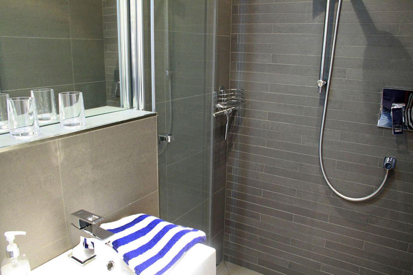 Das Badezimmer hat eine Dusche mit bodentiefem Einstieg sowie eine Glasfalttür. Weiter finden Sie das WC, einen großen Spiegel mit Beleuchtung sowie einen Handtuchtrockner.